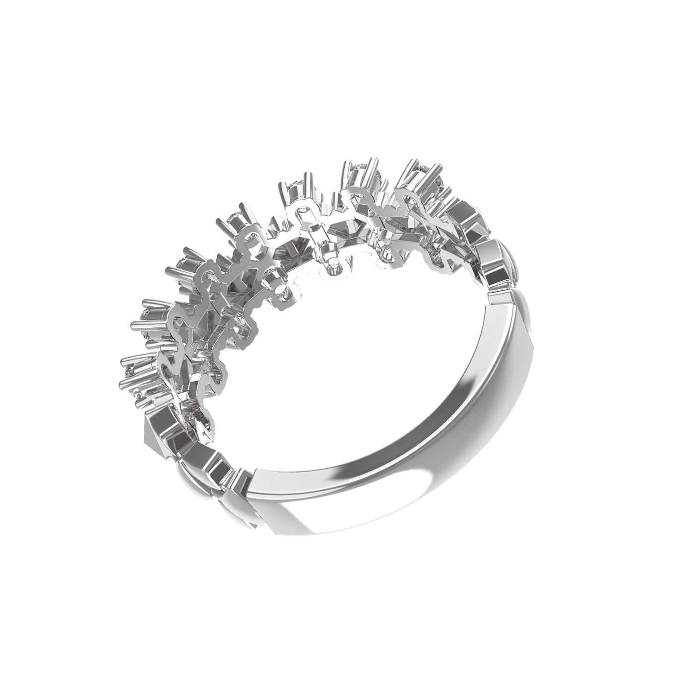 В центре композиции расположены 14 безупречных бриллиантов круглой формы с чистым белым цветом вставок. Драгоценные камни закреплены таким образом, чтобы максимально раскрыть их игру света при каждом движении. Холодный блеск белого золота подчеркивает роскошь оформления, делая аксессуар универсальным дополнением как повседневного, так и вечернего гардероба. Данная модель выполнена в стиле унисекс, что позволяет носить это кольцо как мужчинам, так и женщинам.