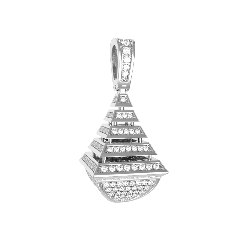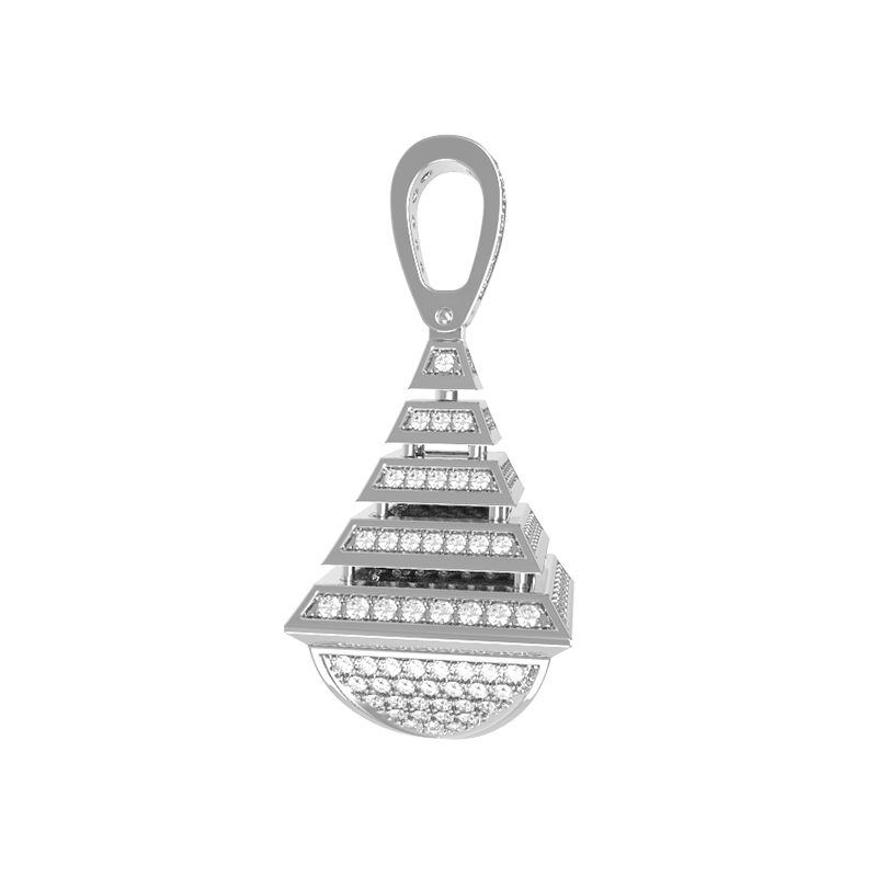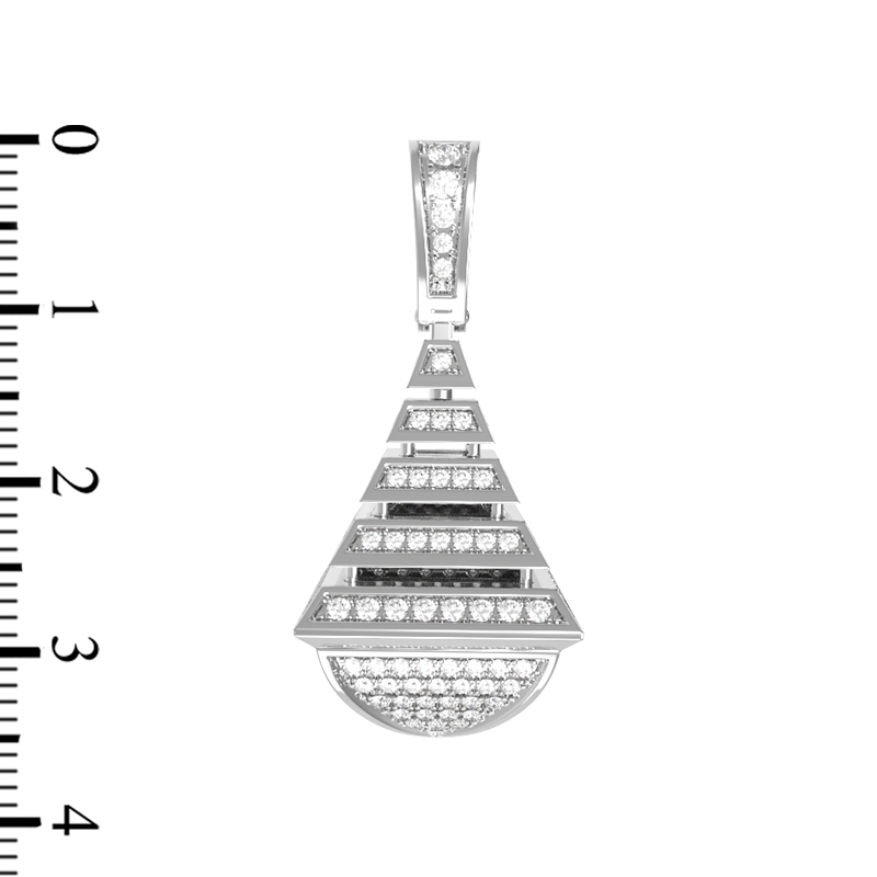 Роскошная подвеска из белого золота 585 пробы — это воплощение ювелирного мастерства и современного геометрического стиля. Изделие входит в коллекцию De Luxe Бриллианты — Pyramids, дизайн которой вдохновлен четкими линиями и архитектурной лаконичностью форм. Центральным элементом украшения стала сложная многоуровневая конструкция, напоминающая ступенчатую пирамиду, увенчанную элегантной петлей для крепления на цепь.
