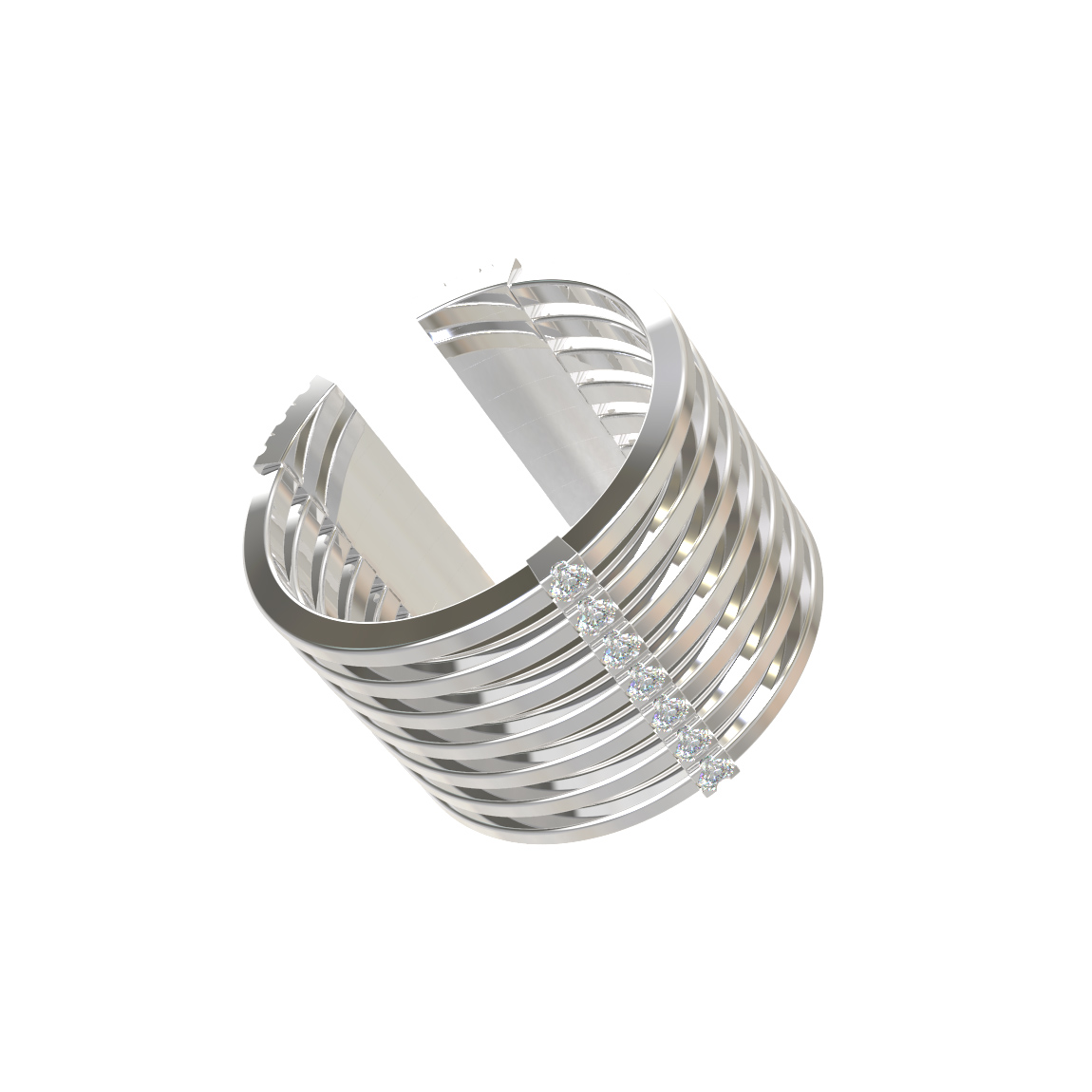 Особую роскошь модели придает инкрустация: 49 ослепительных бриллиантов круглой огранки с белым цветом вставок создают выразительную игру света, наполняя украшение магическим сиянием. Бриллиантовая дорожка элегантно украшает часть шинки, создавая стильный контраст с глянцевой поверхностью белого золота.