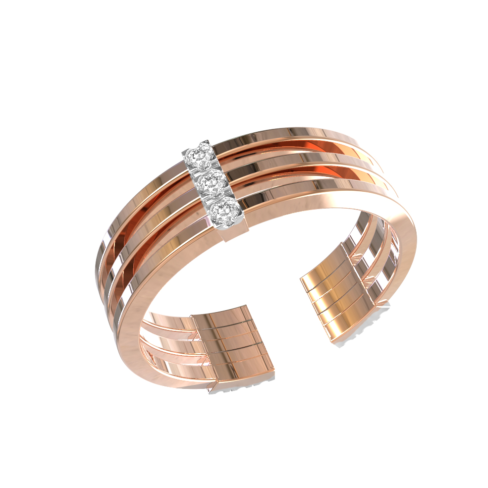 Кольцо из золота с бриллиантами из коллекции De Luxe Бриллианты — Diamond lines воплощает в себе современный взгляд на ювелирное искусство. Дизайн украшения, вдохновленный архитектурными линиями, построен на контрасте теплых и холодных оттенков драгоценных материалов. Основа выполнена из красного золота 585 пробы, что обеспечивает прочность и благородный блеск. Открытая конструкция состоит из трех параллельных шинок, которые плавно соединяются с двух сторон в эффектные площадки, украшенные инкрустацией.