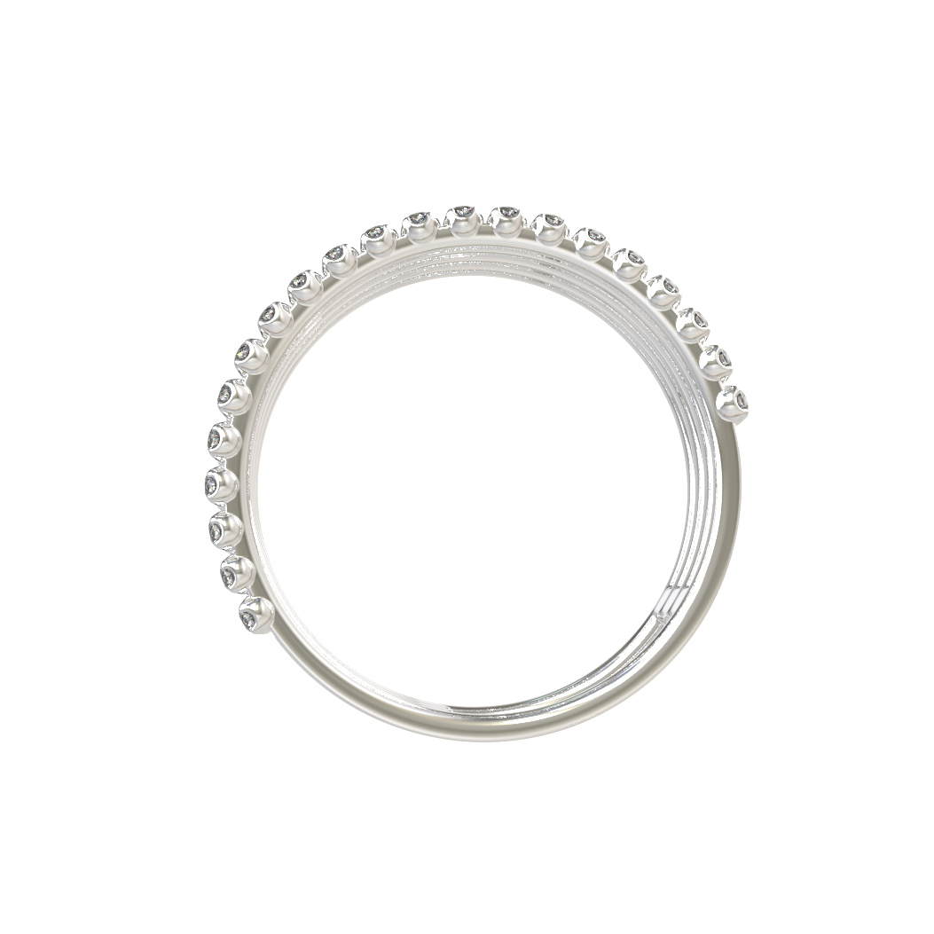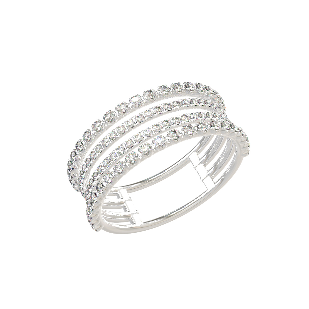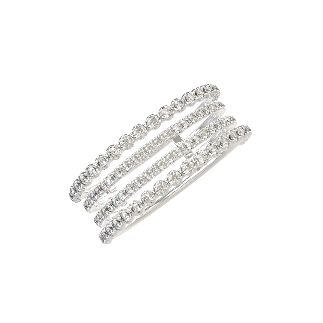 Элегантное кольцо из белого золота 585 пробы из коллекции De Luxe Бриллианты — Diamond lines станет достойным дополнением к образу современного человека. Изысканный аксессуар выполнен в сдержанном, но выразительном дизайне, который подчеркивает статус и безупречный вкус владельца. Это ювелирное изделие гармонично сочетается как с повседневным стилем, так и с вечерним нарядом, подчеркивая индивидуальность обладателя. Кольцо выполнено в форме изящного каффа, где четыре параллельные дорожки, инкрустированные драгоценными камнями, создают эффект визуального объема и динамики.