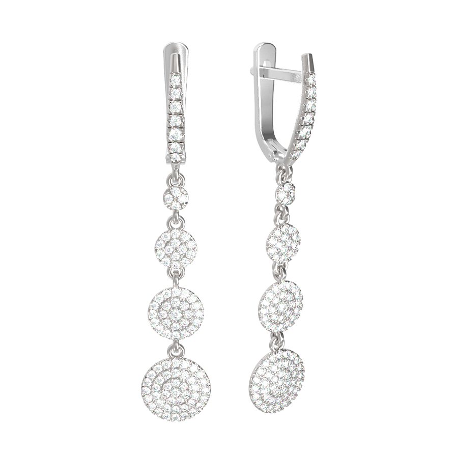 Дизайн модели представляет собой утонченную композицию из подвижных элементов круглой формы, инкрустированных камнями. Общее количество вставок составляет 184 бриллианта. Каждый камень имеет классическую форму огранки круг, что позволяет им максимально раскрывать игру света и блеск. Белый цвет вставок гармонично дополняет холодный оттенок золота, создавая цельный и элегантный образ. Эти серьги станут центральным элементом вашего вечернего наряда, придавая ему нотки роскоши и особого шарма.