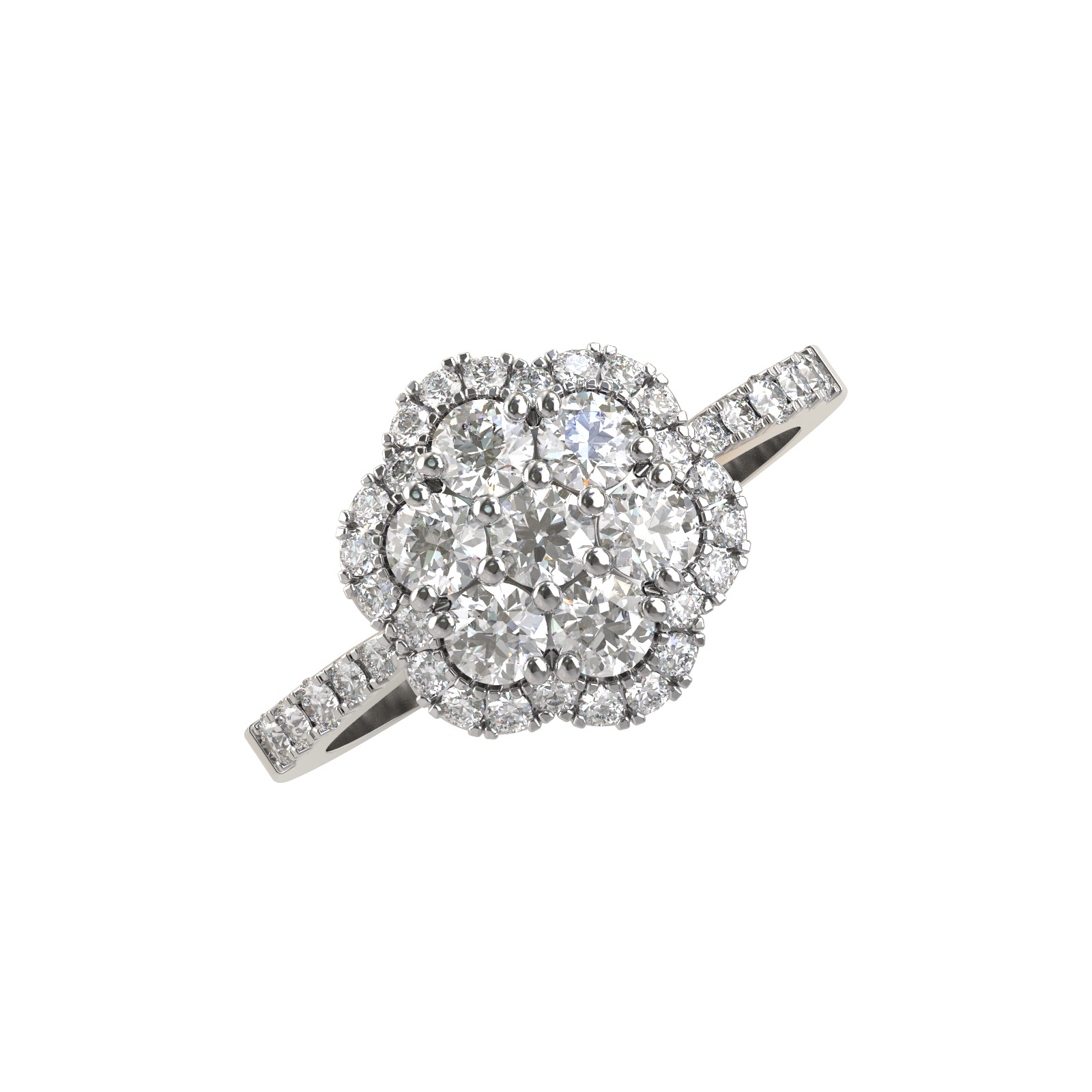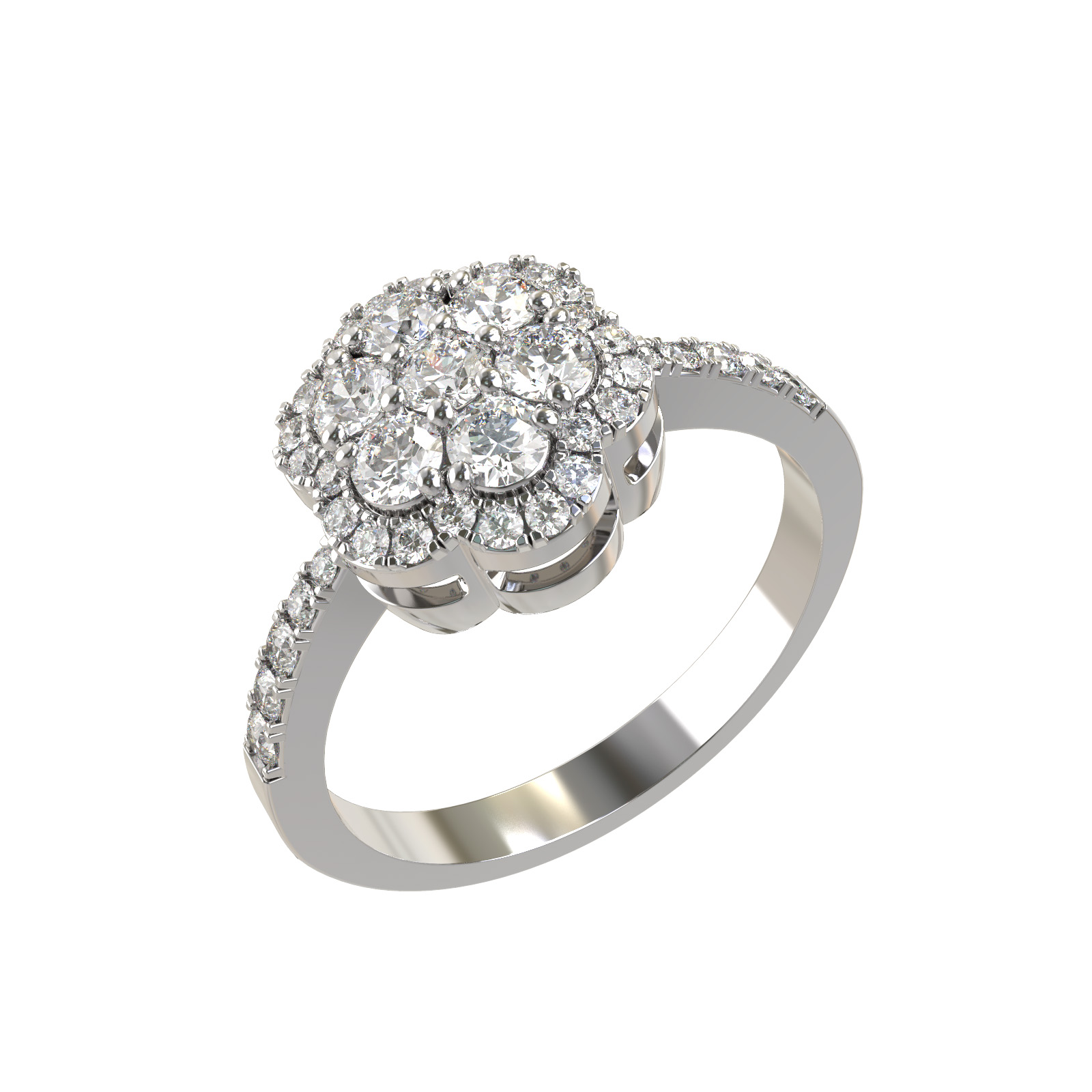 Изысканное кольцо из белого золота 585 пробы станет центральным элементом вашей коллекции украшений. Дизайн изделия объединяет классическую элегантность и безупречный блеск: центральная композиция, состоящая из крупных камней, визуально имитирует роскошный цветок, подчеркнутый сиянием дополнительных бриллиантов по шинке кольца. Всего в украшении использована 41 вставка круглой формы, обладающая чистым белым цветом, что создает завораживающую игру света при каждом движении руки.