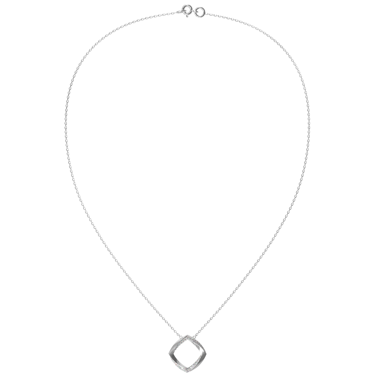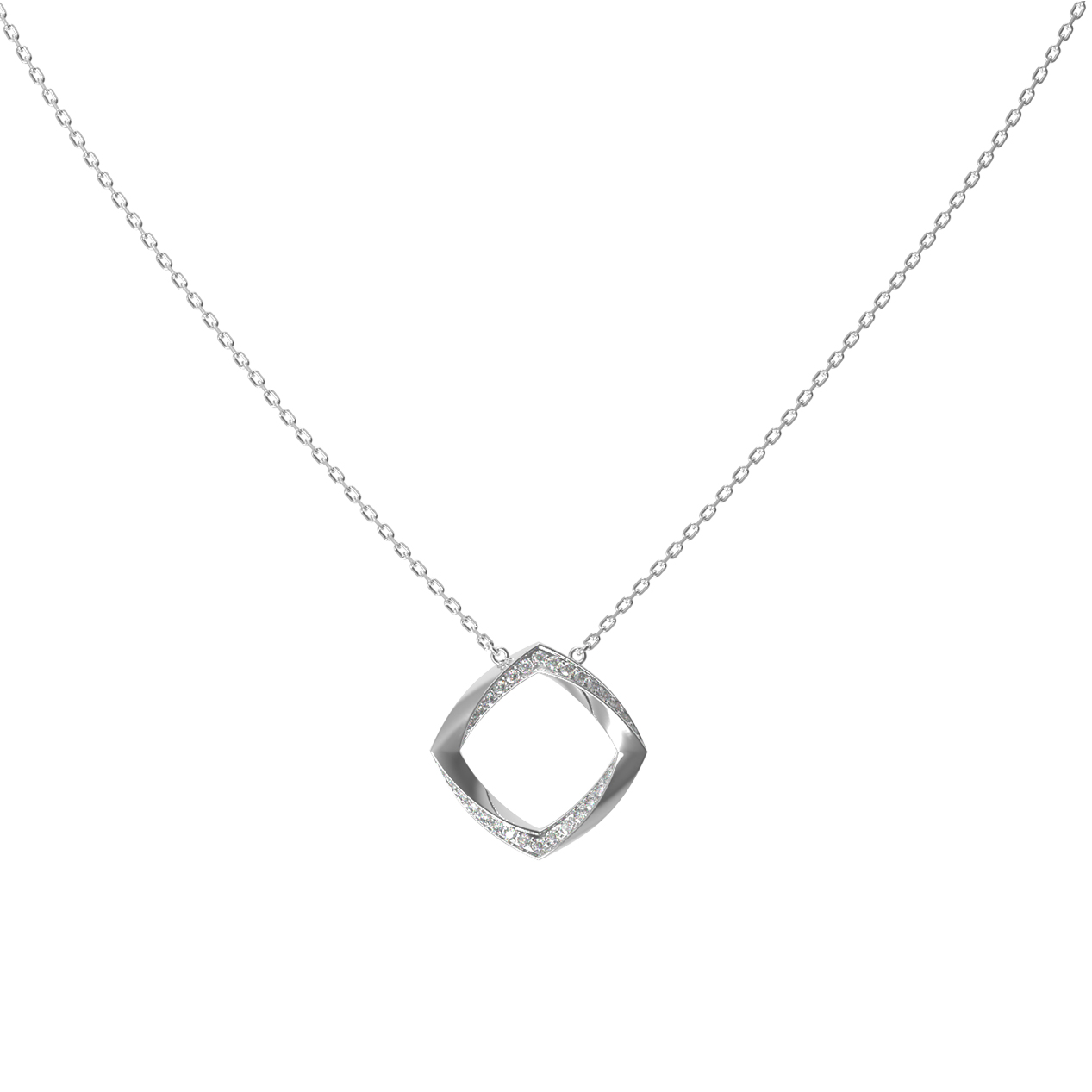 Центральным элементом изделия является геометрическая подвеска, инкрустированная 102 бриллиантами круглой формы с белым цветом вставок. Мастерская работа подчеркивает сияние каждого камня, создавая эффектное обрамление. Колье выполнено из белого золота 585 пробы, что обеспечивает долговечность и благородный холодный отблеск, идеально дополняющий любые вечерние или повседневные ансамбли.