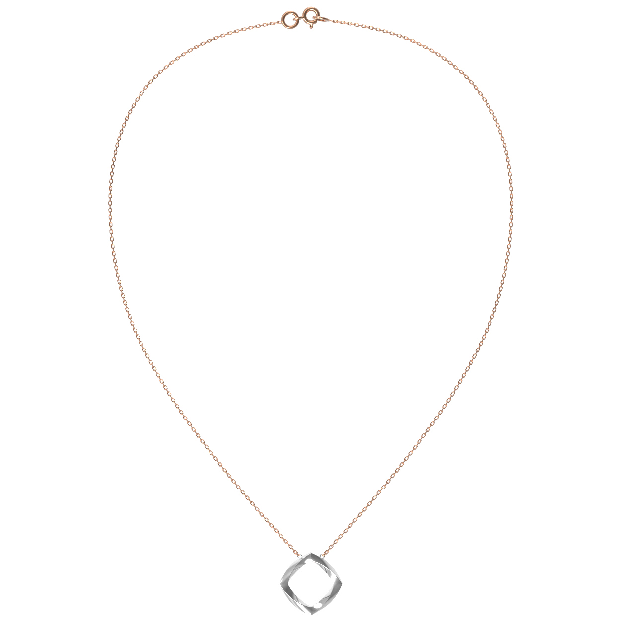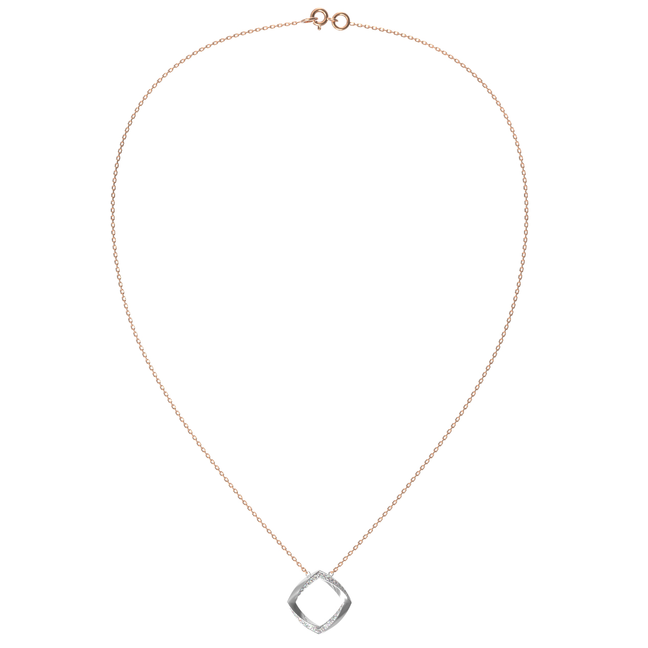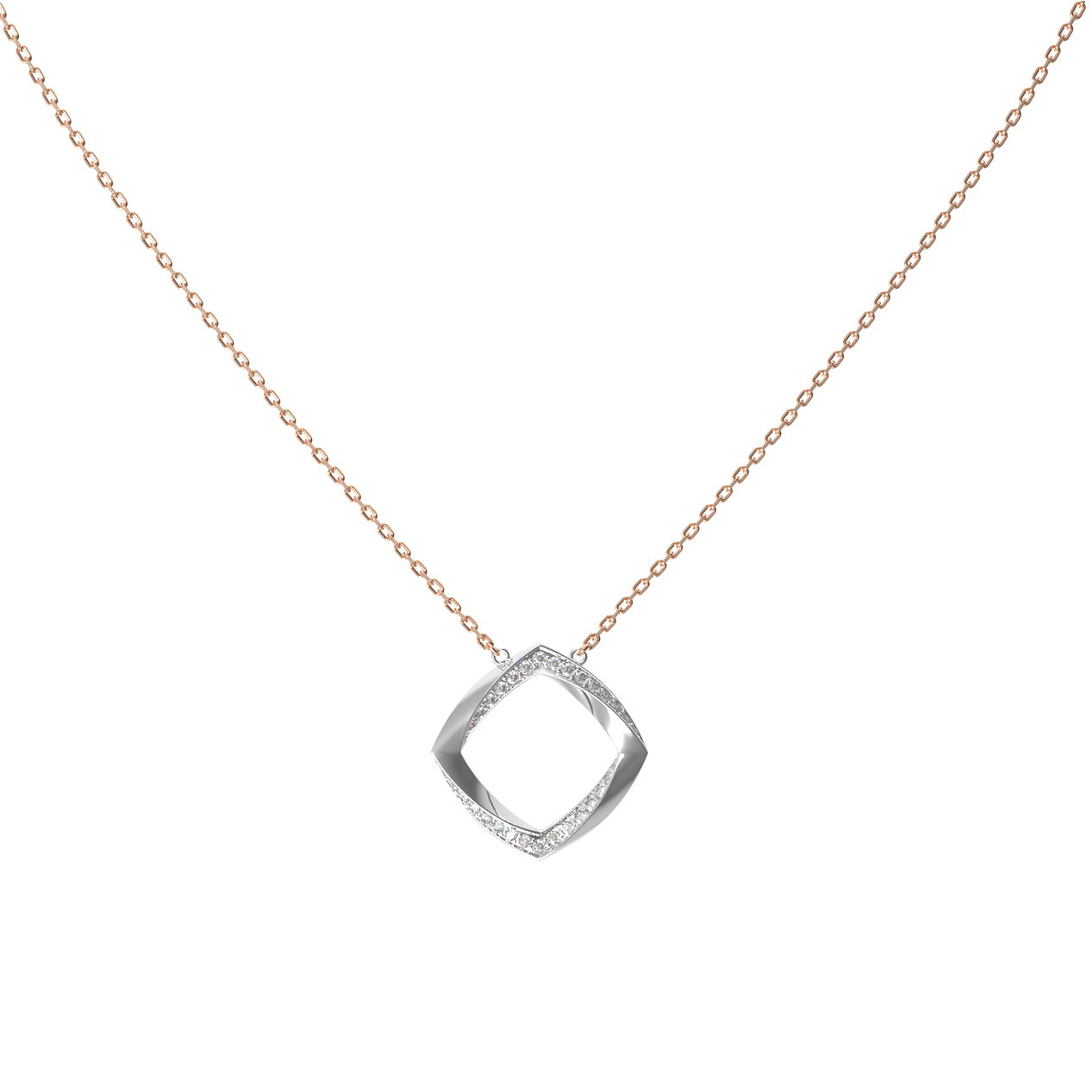 Центральным элементом композиции является оригинальная подвеска геометрической формы, инкрустированная 102 бриллиантами круглой огранки. Белый цвет камней создает эффектный контраст с металлом, наполняя украшение живым блеском при каждом движении. Тщательная огранка позволяет свету преломляться внутри каждого бриллианта, делая колье заметным и выразительным аксессуаром.