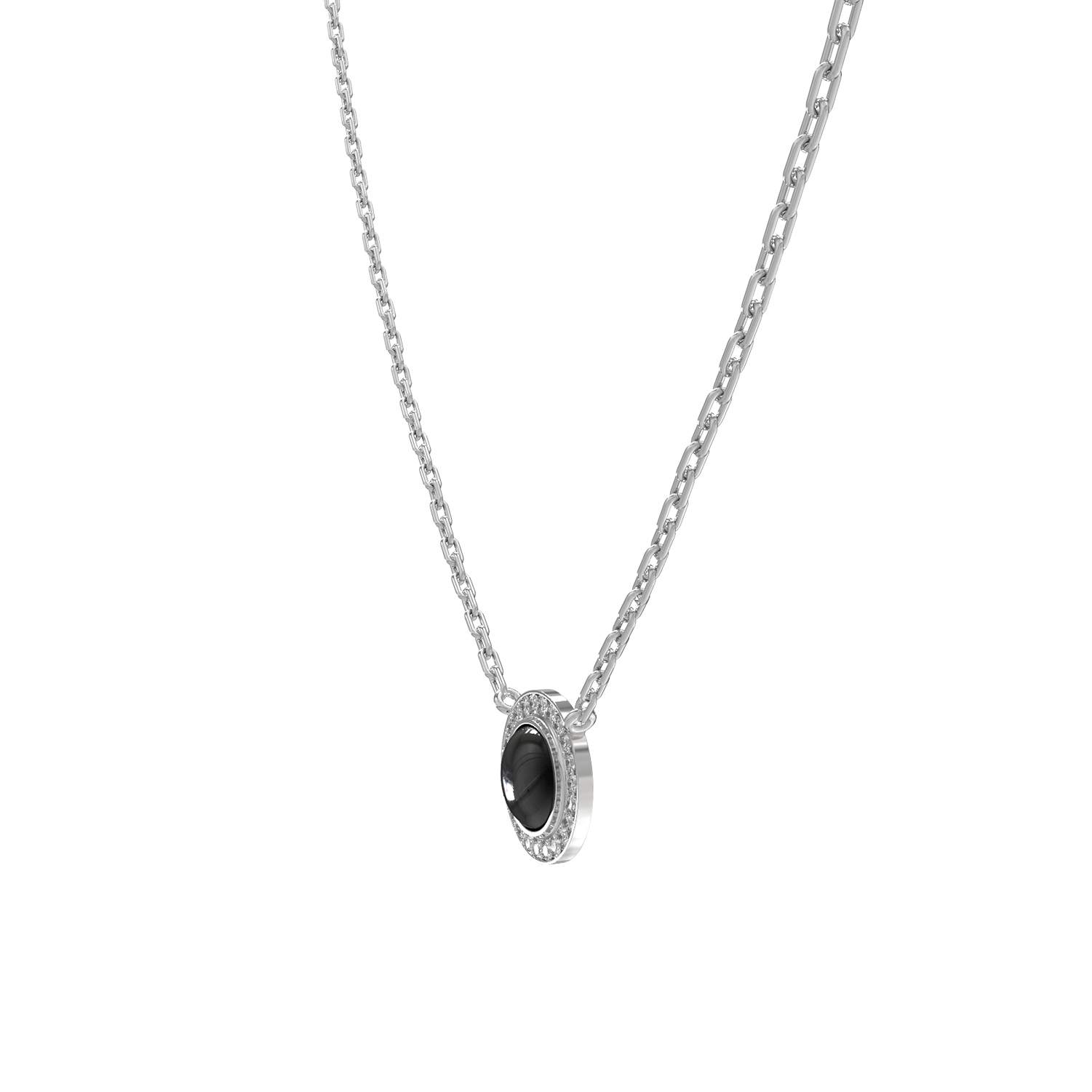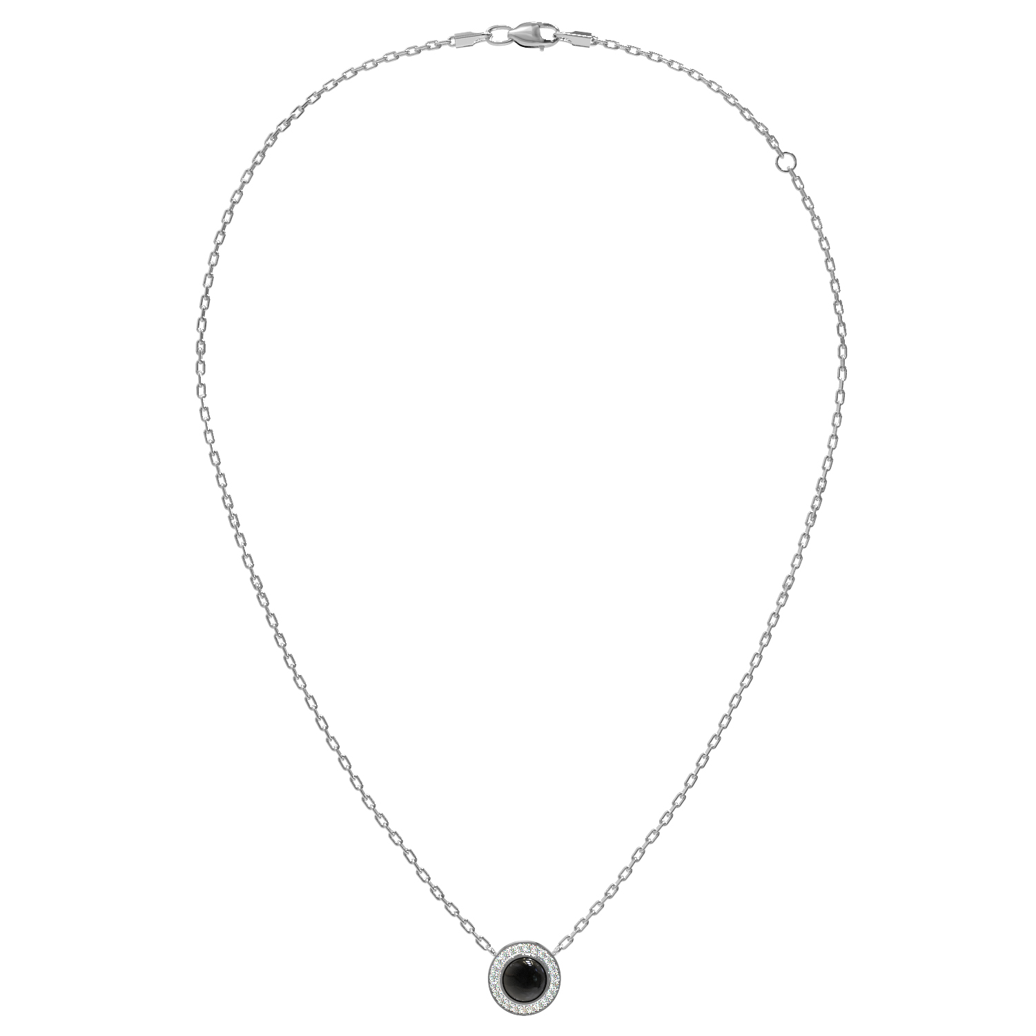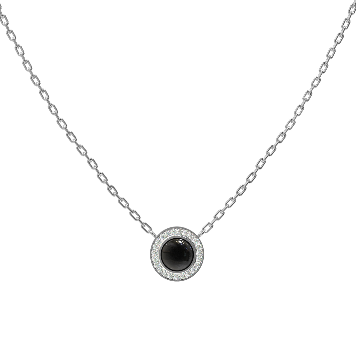 Вокруг оникса расположена сияющая россыпь из 48 сверкающих бриллиантов круглой огранки. Сочетание черного и белого цвета в этом дизайне создает эффектный визуальный акцент, делая колье по-настоящему притягательным аксессуаром. Тонкая, прочная цепочка гармонично дополняет подвеску, обеспечивая комфортную посадку на шее.