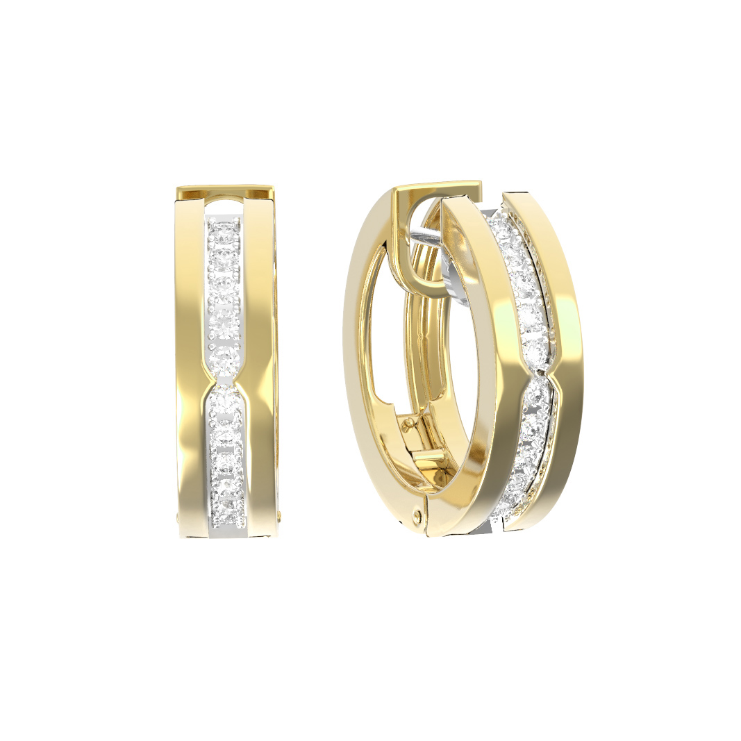 В центре композиции расположены 22 бриллианта круглой формы с чистым белым цветом вставок. Камни аккуратно инкрустированы в дорожку, проходящую по центру каждого изделия. Такой прием придает украшению динамику и яркость, позволяя свету играть на гранях при каждом вашем движении. Ювелирное изделие обладает универсальной геометрией, которая делает его подходящим аксессуаром как для женщин, так и для мужчин. Благодаря своему дизайну, эти серьги станут важным элементом образа, подчеркивая безупречный вкус владельца.