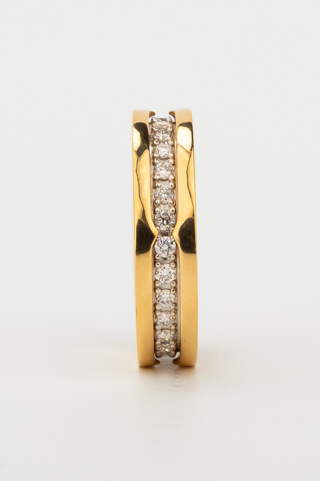 Центральную часть изделия украшает дорожка из 28 драгоценных камней: вставка из бриллиантов круглой огранки с сияющим белым цветом приковывает взгляд своей игрой света. Бриллианты надежно закреплены в центре, создавая эффект непрерывного сияния, который будет уместен как для повседневной носки, так и для торжественных мероприятий. Кольцо выполнено с вниманием к деталям, обеспечивая комфортную посадку на пальце.