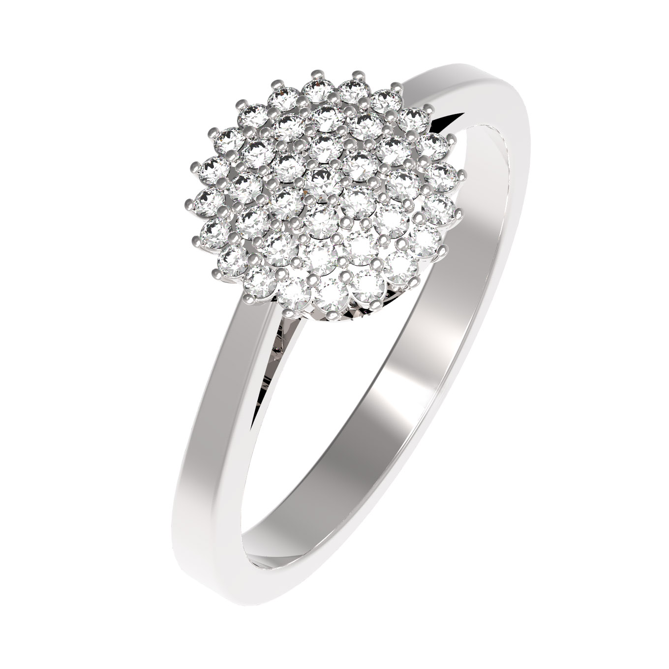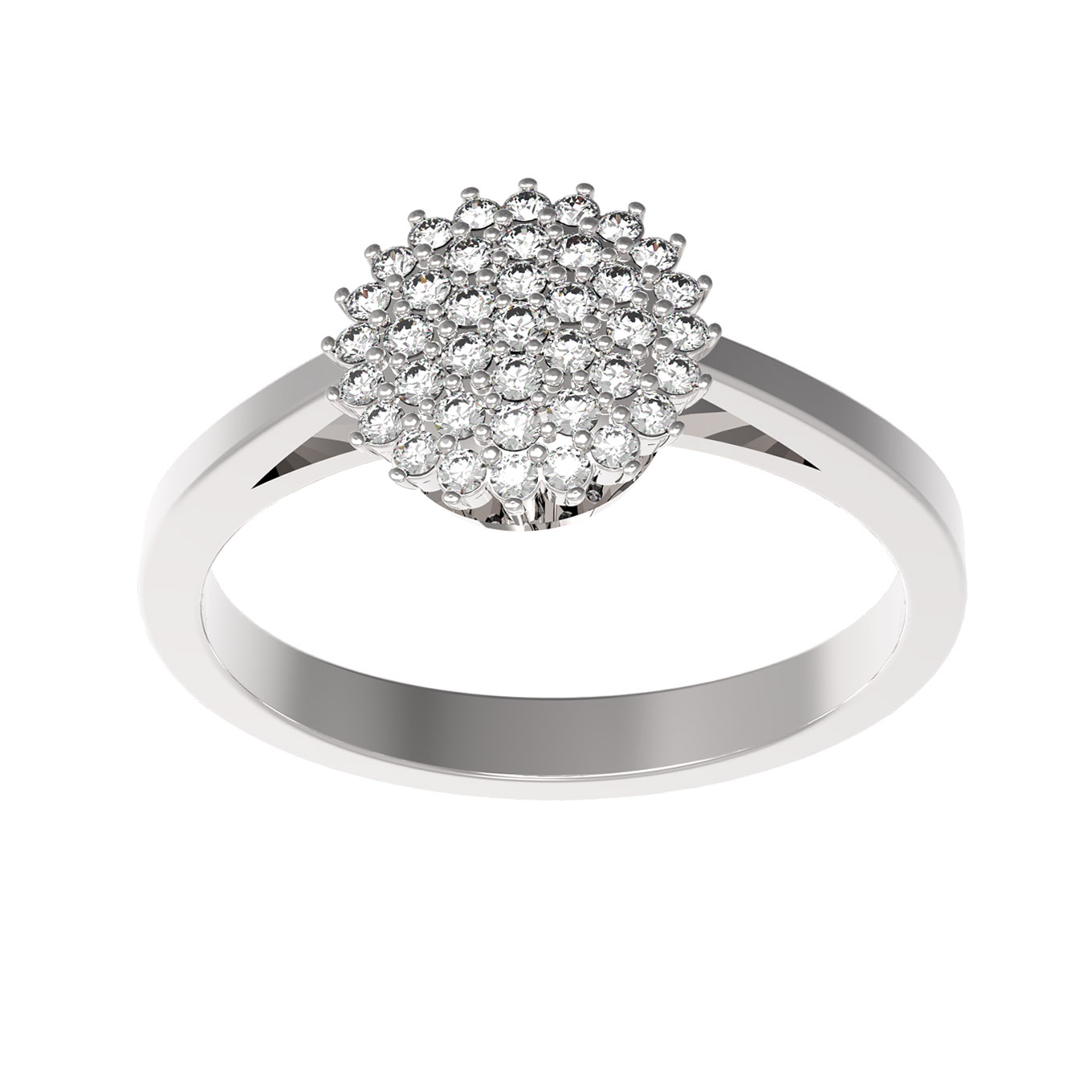 Центральная часть кольца декорирована композицией из 39 бриллиантов круглой огранки. Белые камни плотно прилегают друг к другу, создавая эффект сплошного мерцающего полотна, которое притягивает взгляды при каждом движении руки. Продуманный дизайн позволяет носить это кольцо как самостоятельный аксессуар, так и в качестве части ювелирного комплекта.