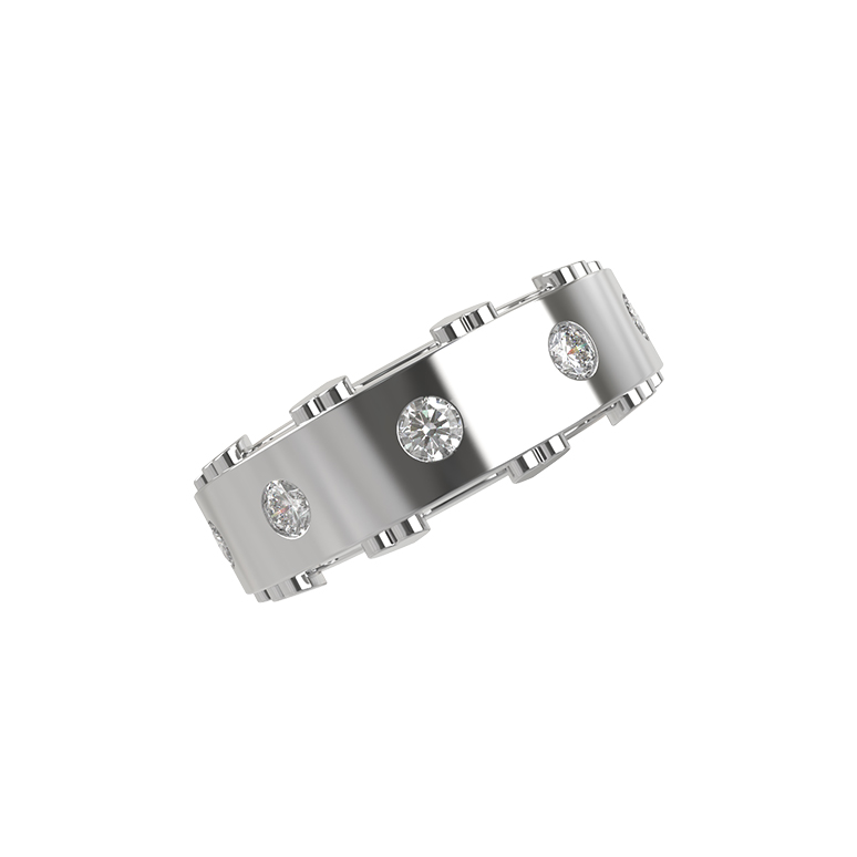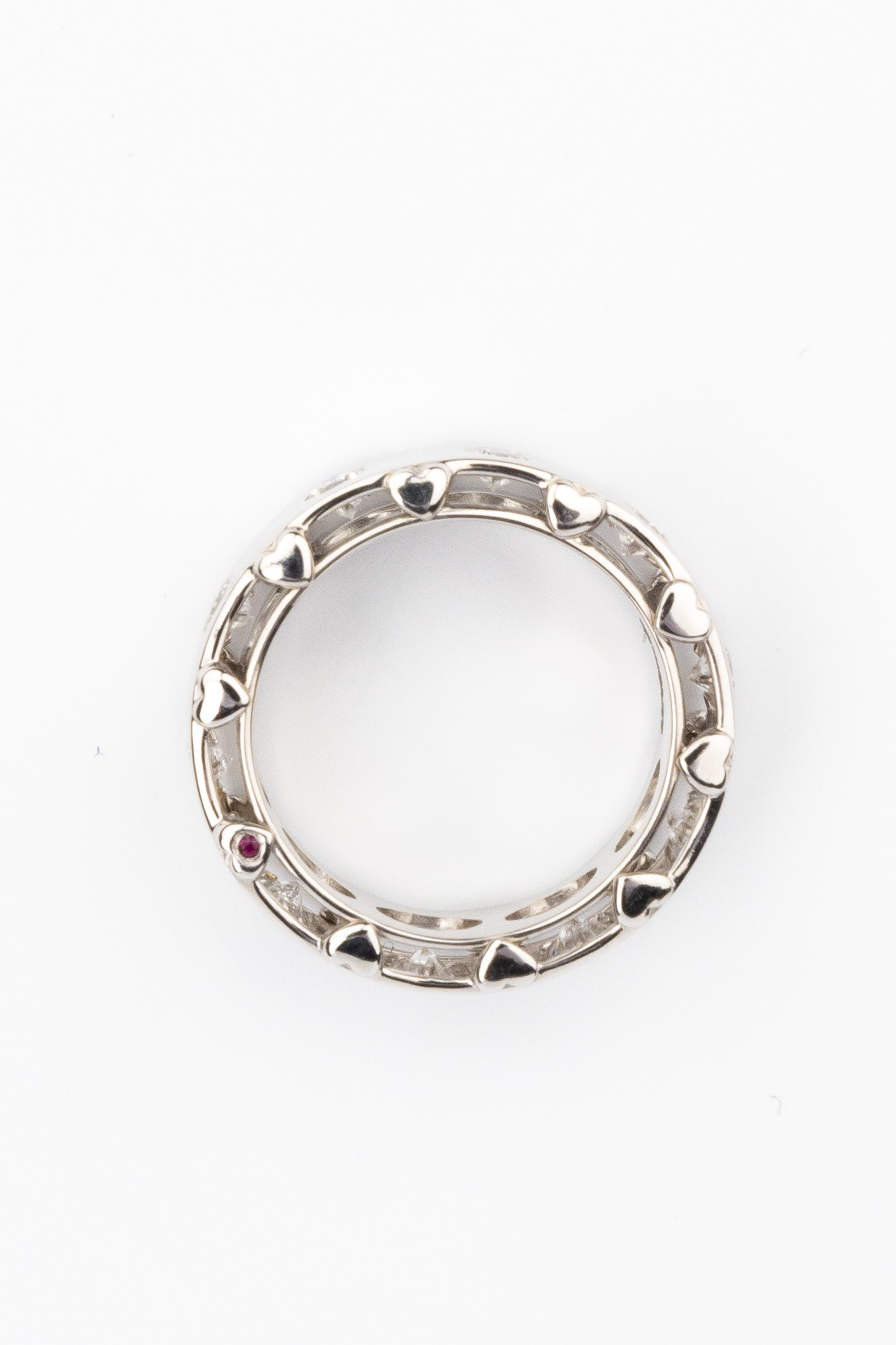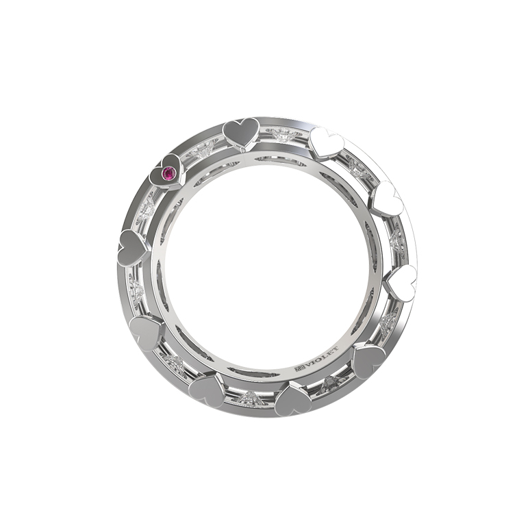 Центральным акцентом композиции выступают 12 вставок, среди которых роскошные бриллианты и яркий рубин. Круглая форма вставок классического белого и насыщенного красного цвета создает эффектную игру света, притягивающую восхищенные взгляды. Белое золото идеально обрамляет каждый камень, придавая украшению завершенный и безупречный вид.