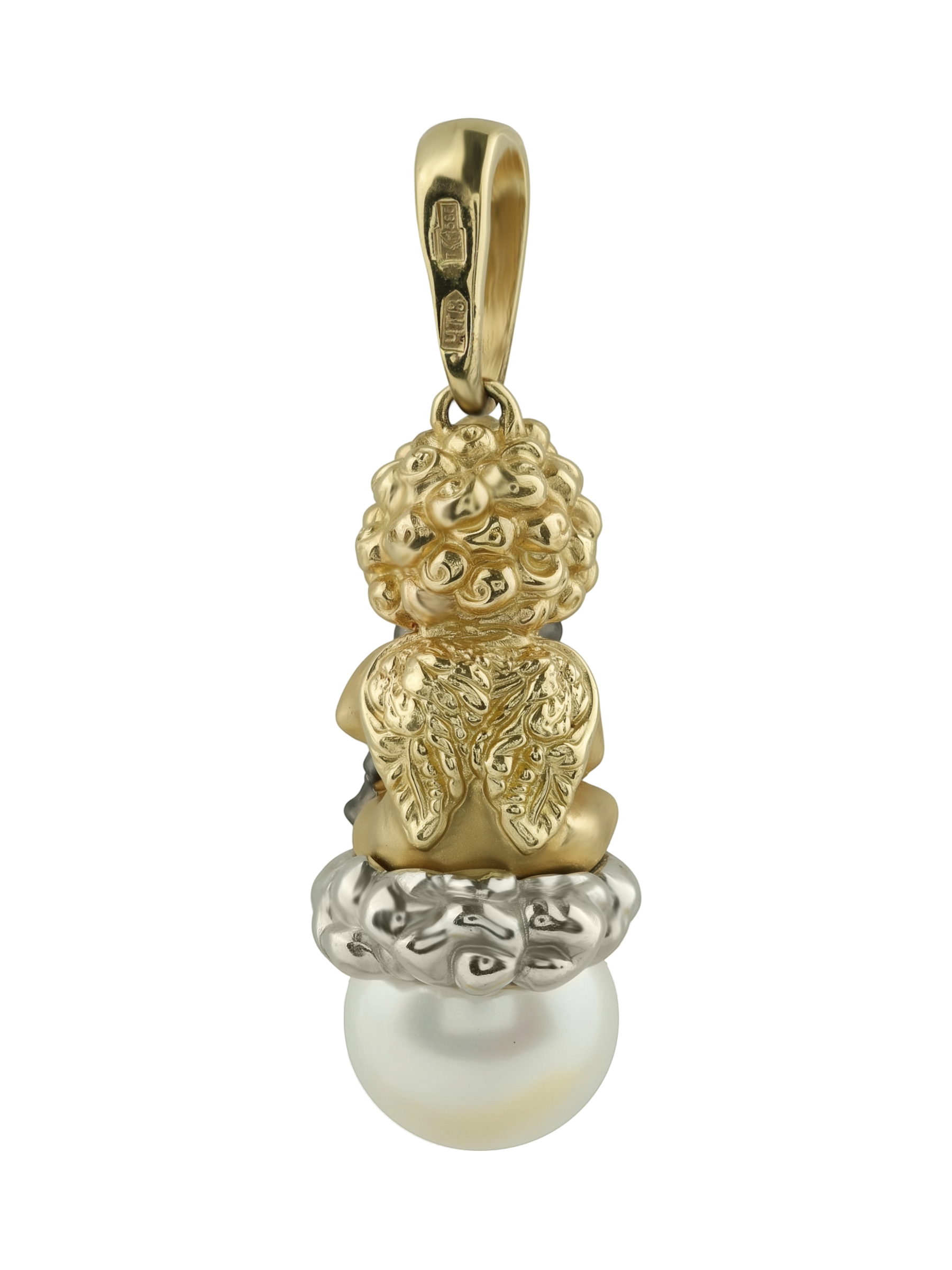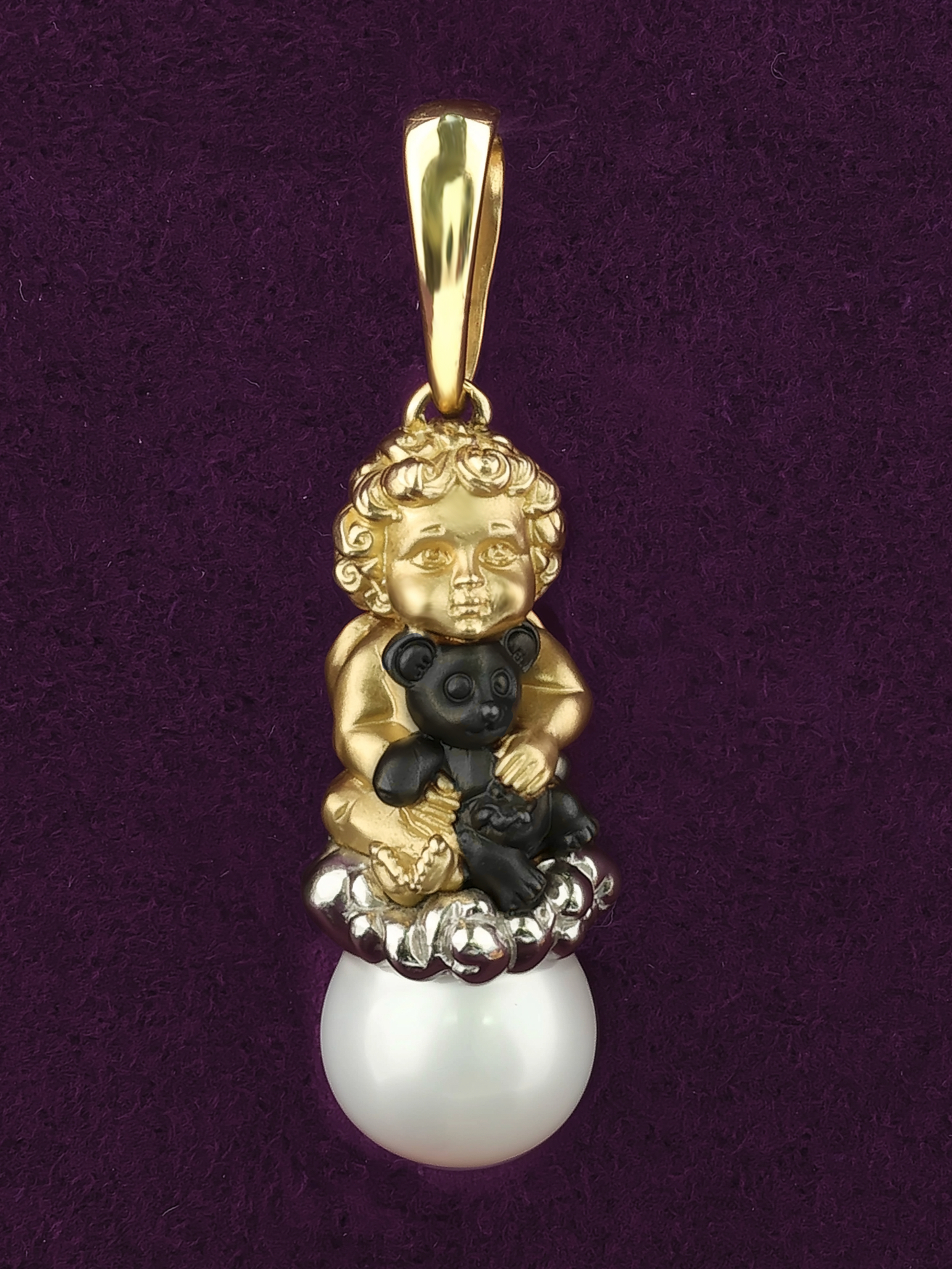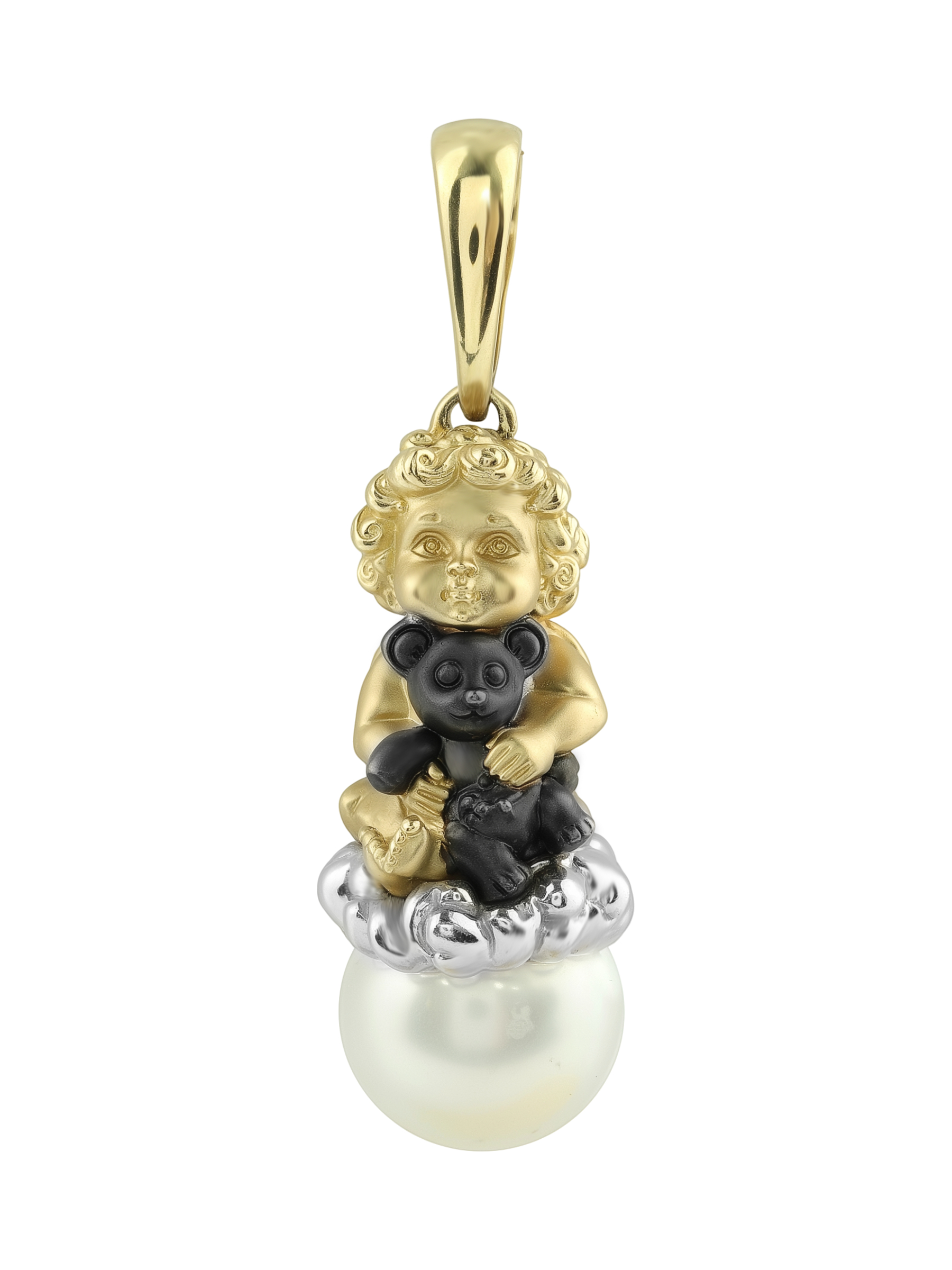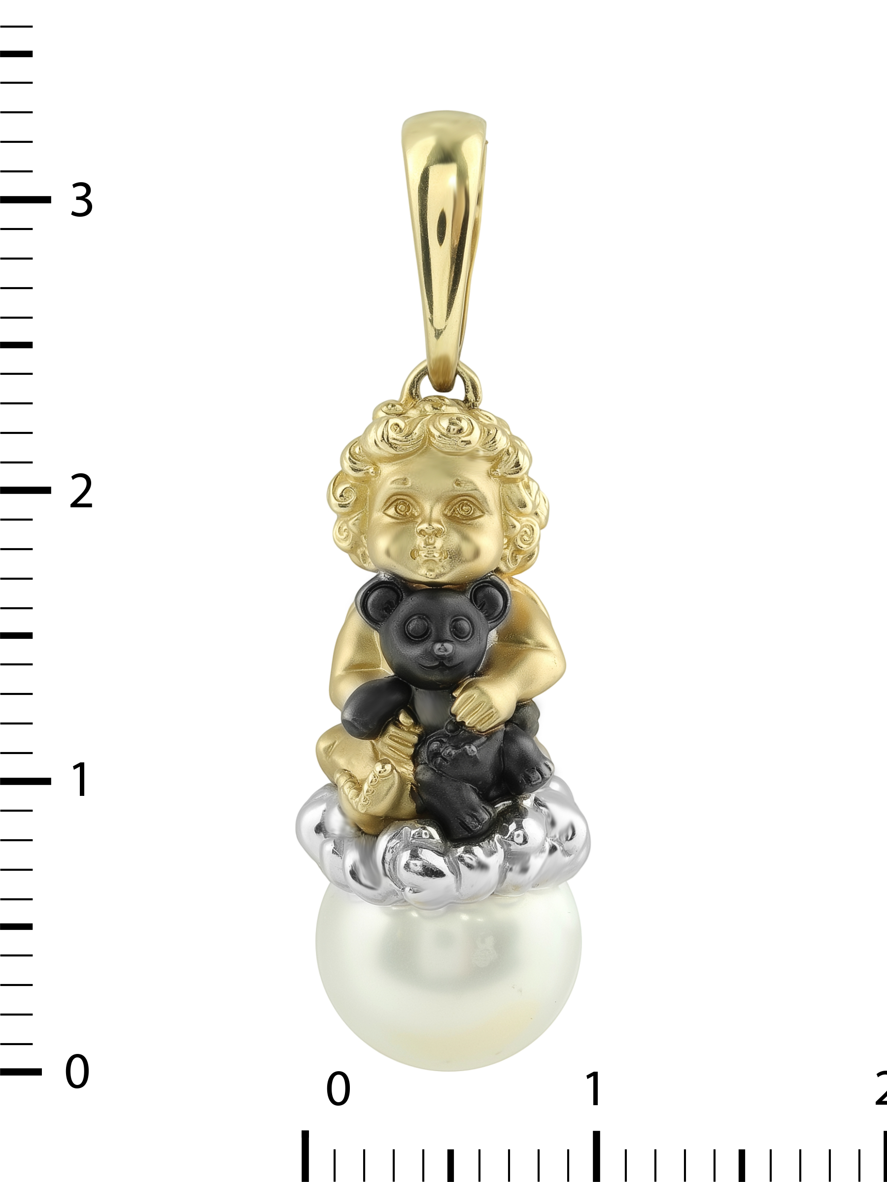 Подвеска из лимонного золота с жемчугом — это искусная работа, которая станет центральным акцентом вашего образа. Изделие из коллекции De Luxe — Купидоны выполнено в оригинальном дизайне: центральной фигурой является очаровательный Купидон, бережно обнимающий игрушку. Детализация подвески подчеркивает высокий уровень ювелирного мастерства, превращая украшение в настоящий объект искусства.