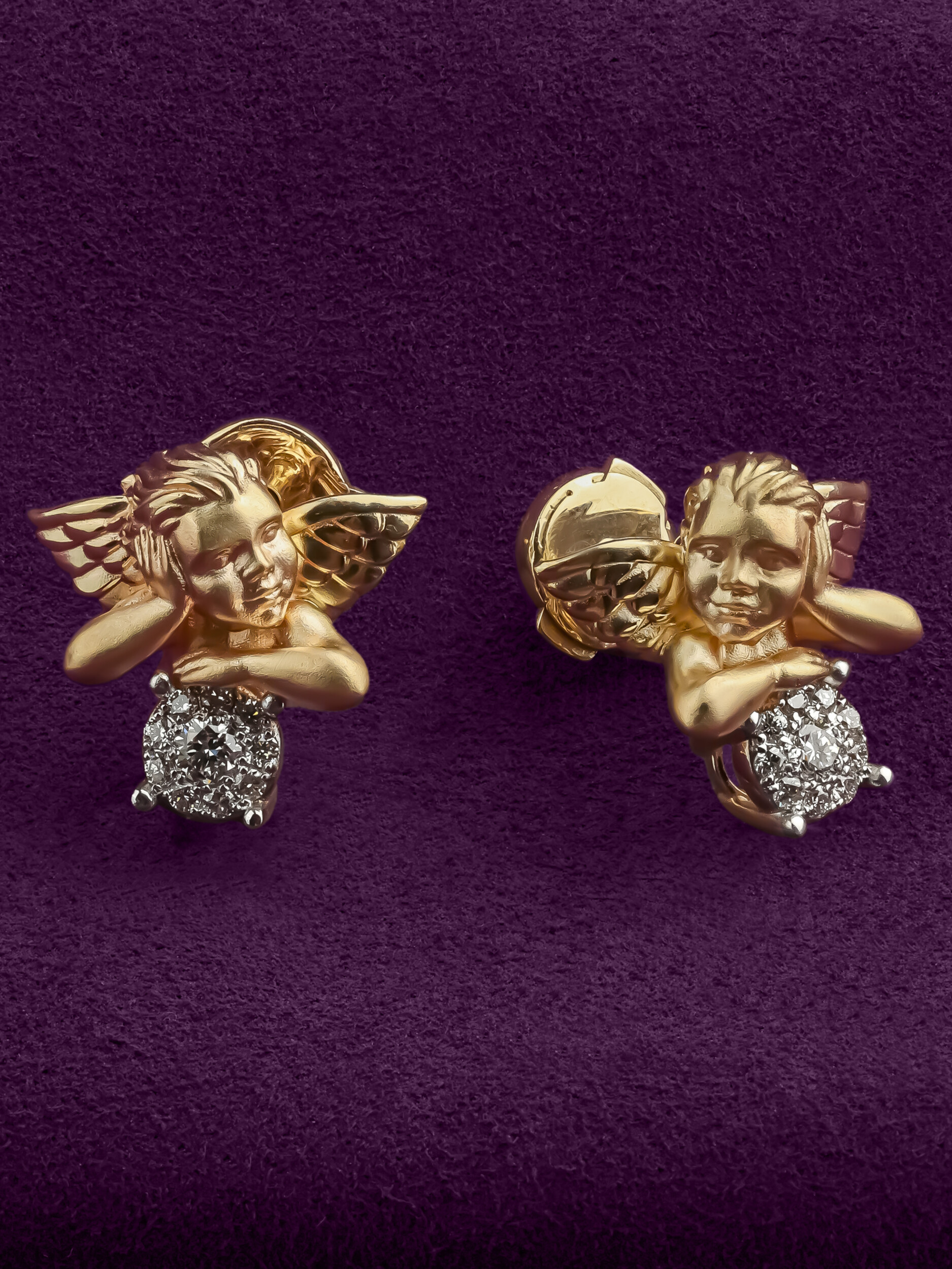 Серьги из золота c бриллиантами из коллекции De Luxe — Купидоны представляют собой воплощение изящества и символичного дизайна. Центральным элементом украшения стали фигурки купидонов, выполненные в красном золоте 585 пробы. Детализированная проработка образа ангелов придает изделию особую выразительность и глубину, превращая ювелирное украшение в настоящее произведение искусства.