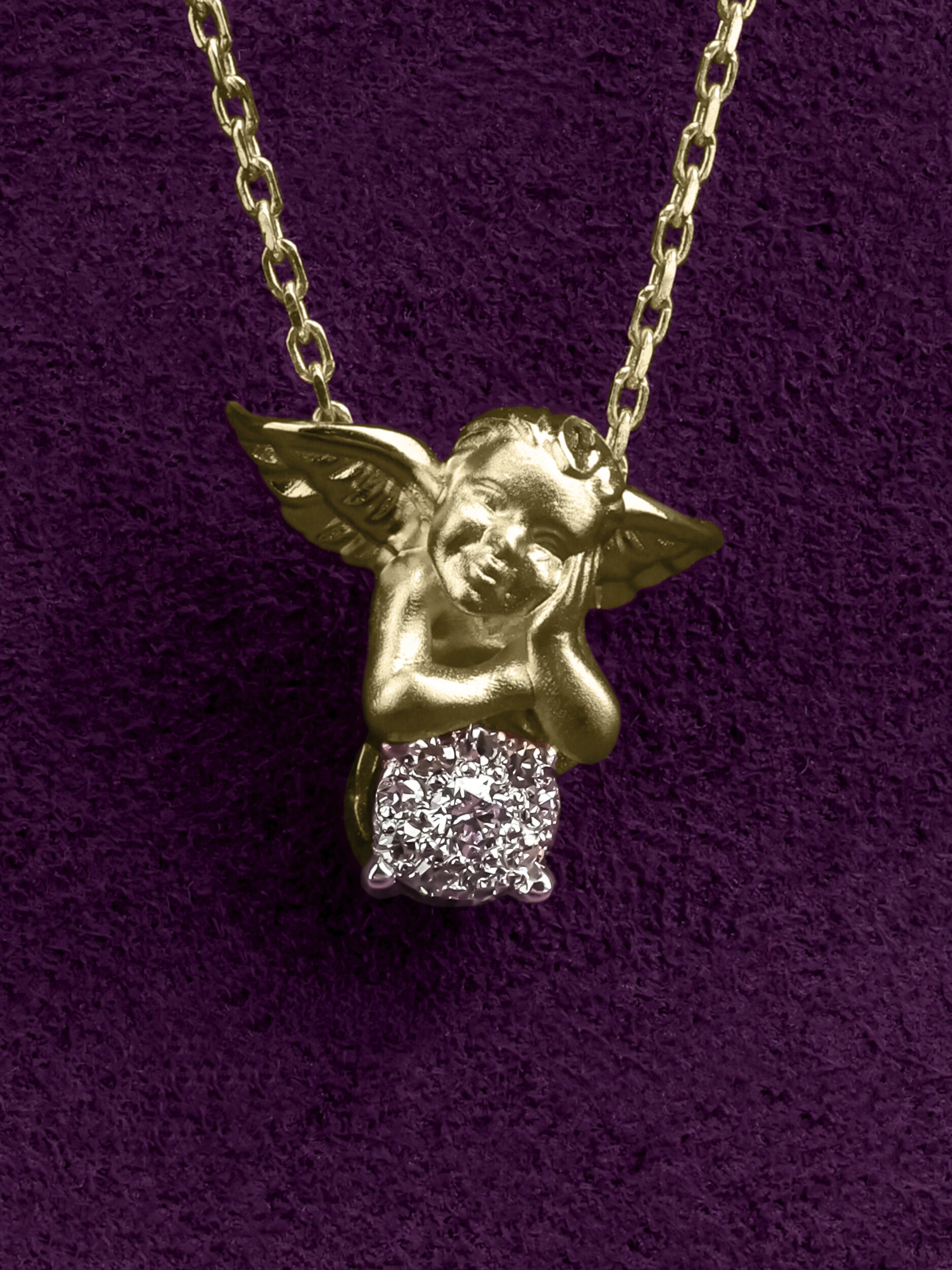 Центральным элементом композиции является вставка из белого бриллианта круглой формы. Игра света на гранях камня придает колье особое сияние и роскошный блеск. Всего в оформлении использовано 10 вставок, которые гармонично дополняют детализированный облик купидона. Благодаря своему лаконичному и символичному дизайну, данное колье подходит как для женщин, так и для мужчин, предпочитающих статусные украшения со смыслом.