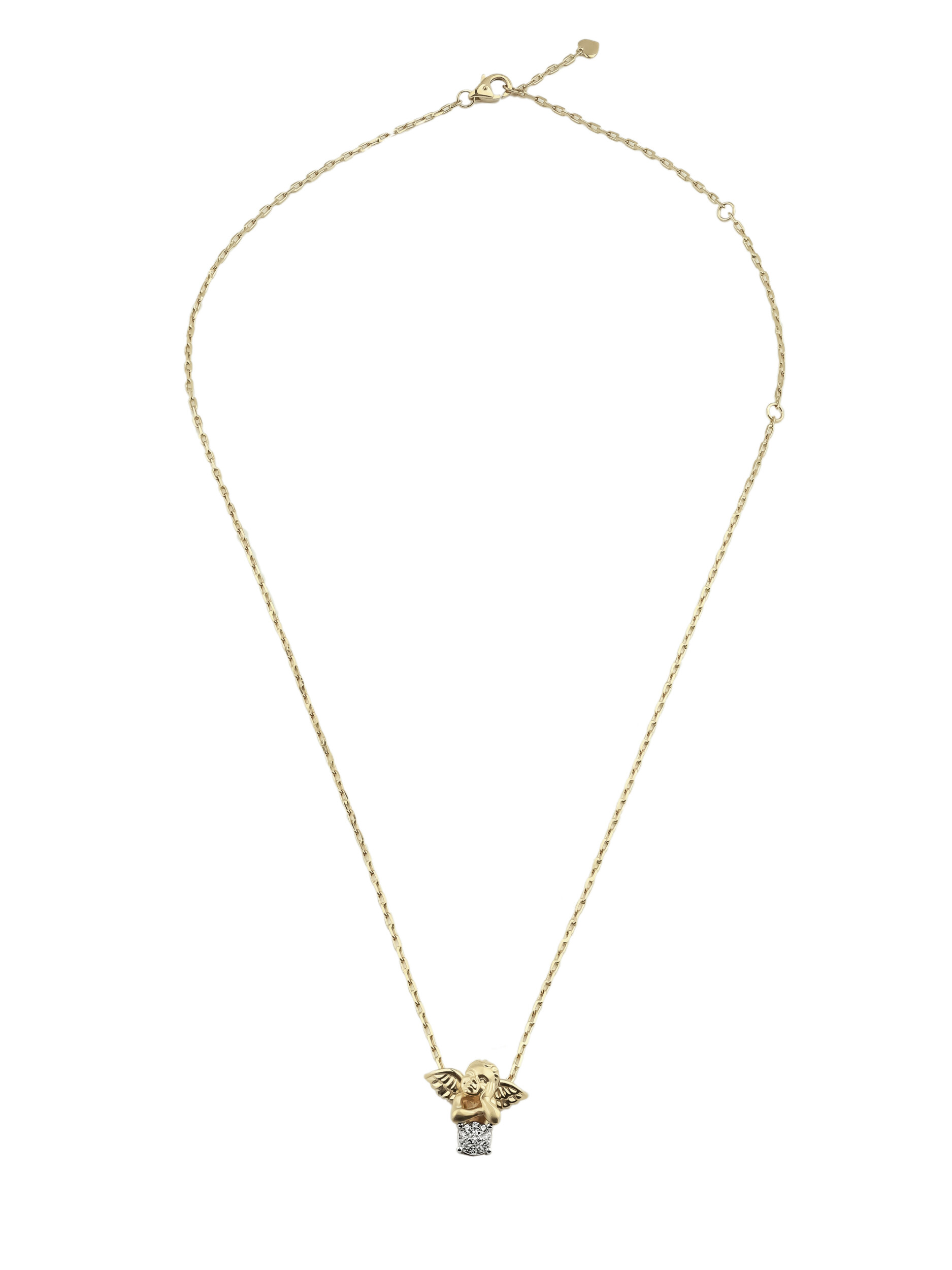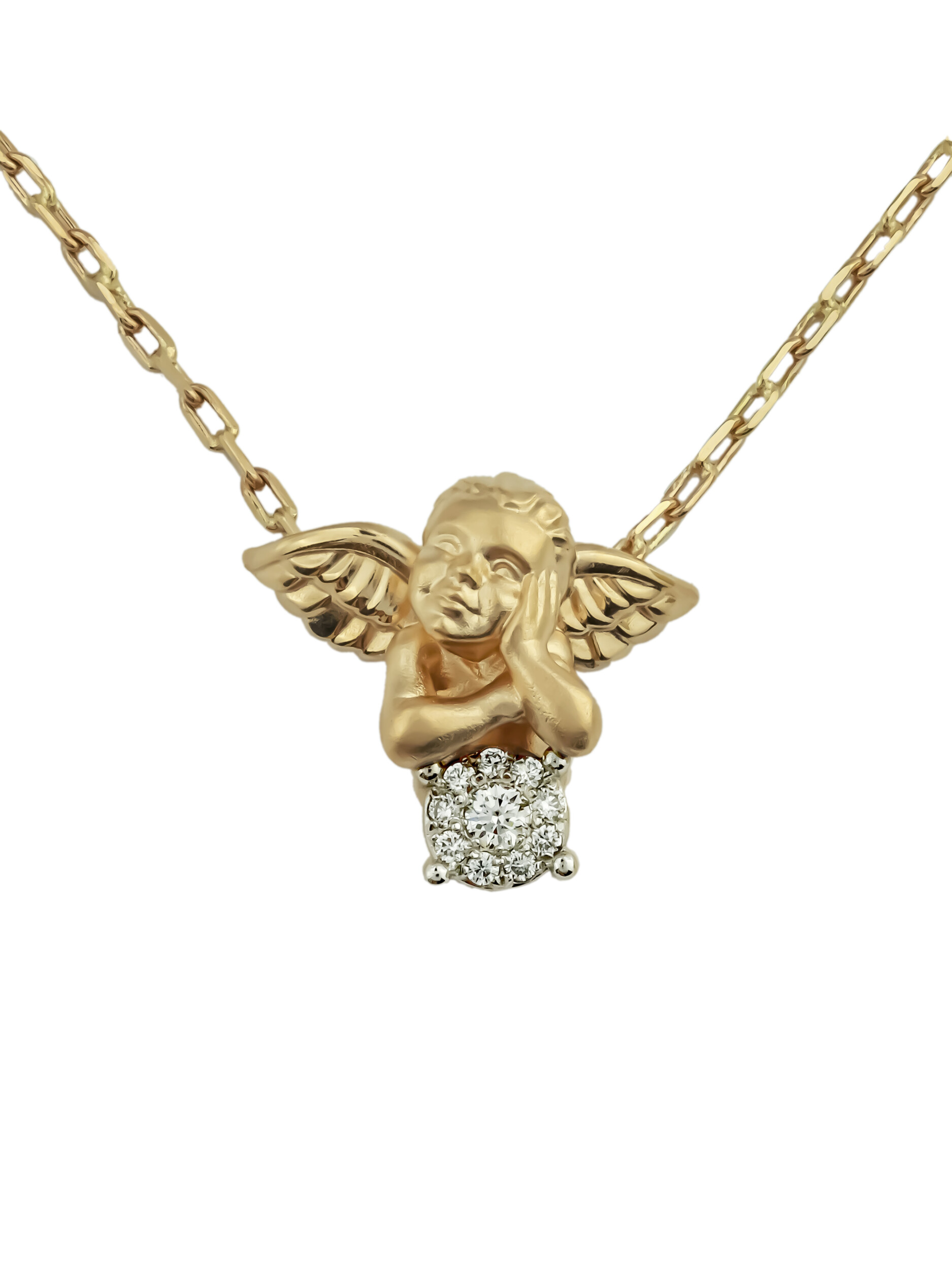 Изысканное колье из лимонного золота 585 пробы станет утонченным акцентом вашего образа. Дизайн украшения, выполненный в виде очаровательного купидона, привносит в ювелирное изделие нотки нежности и высокого искусства. Центральным элементом выступает композиция из 10 бриллиантов белого цвета круглой формы, которые эффектно сияют при каждом движении, подчеркивая статус и безупречный вкус владельца.