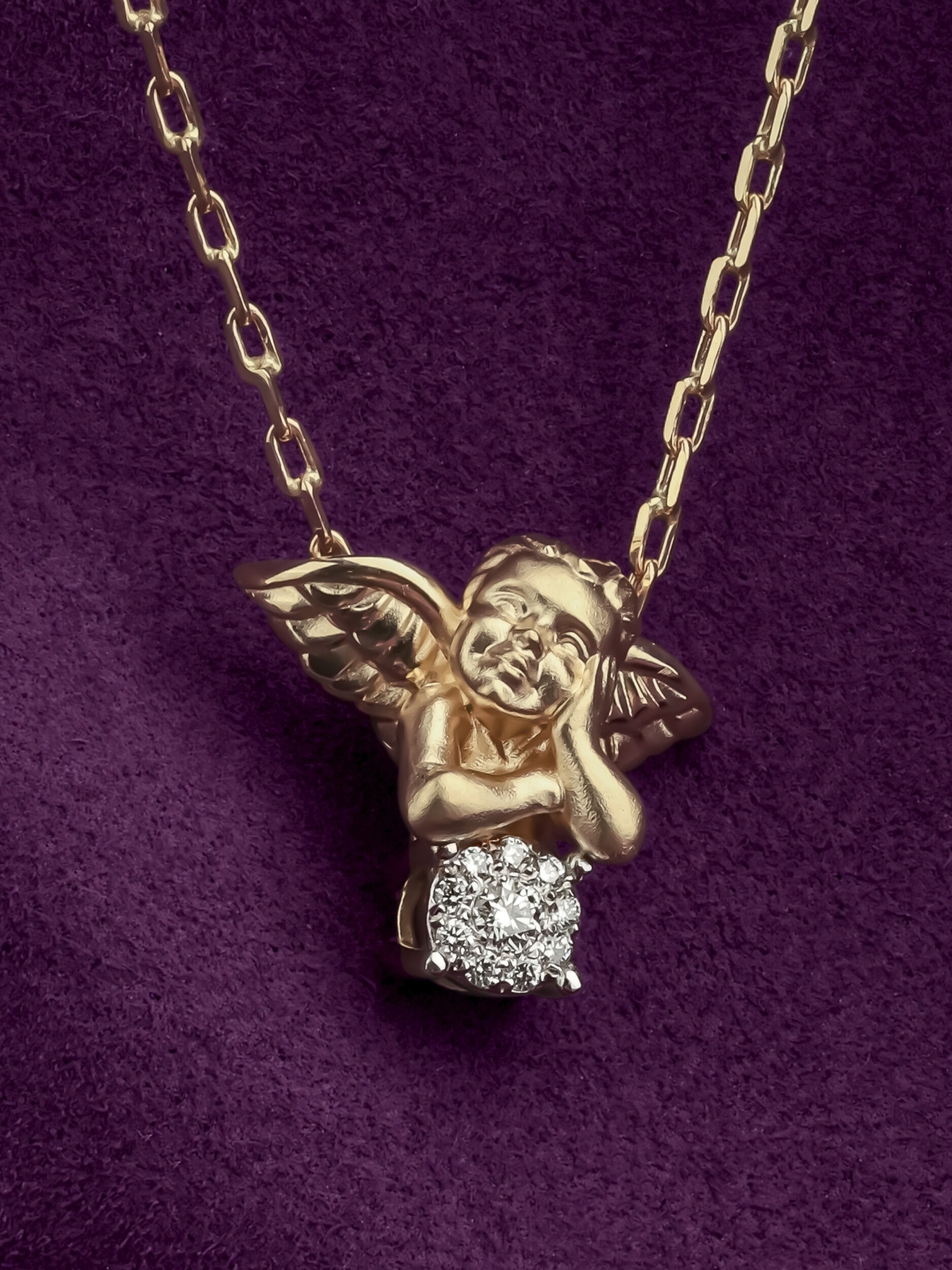 Это колье из коллекции De Luxe — Купидоны выполнено с особым вниманием к деталям. Лимонный оттенок золота гармонично сочетается с холодным блеском драгоценных камней, создавая сбалансированный и выразительный ансамбль. Украшение универсально и подходит как для женщин, так и для мужчин, предпочитающих премиальные аксессуары со смыслом. Лаконичная, но прочная цепь надежно удерживает подвеску, позволяя носить колье ежедневно или дополнять им вечерний наряд.