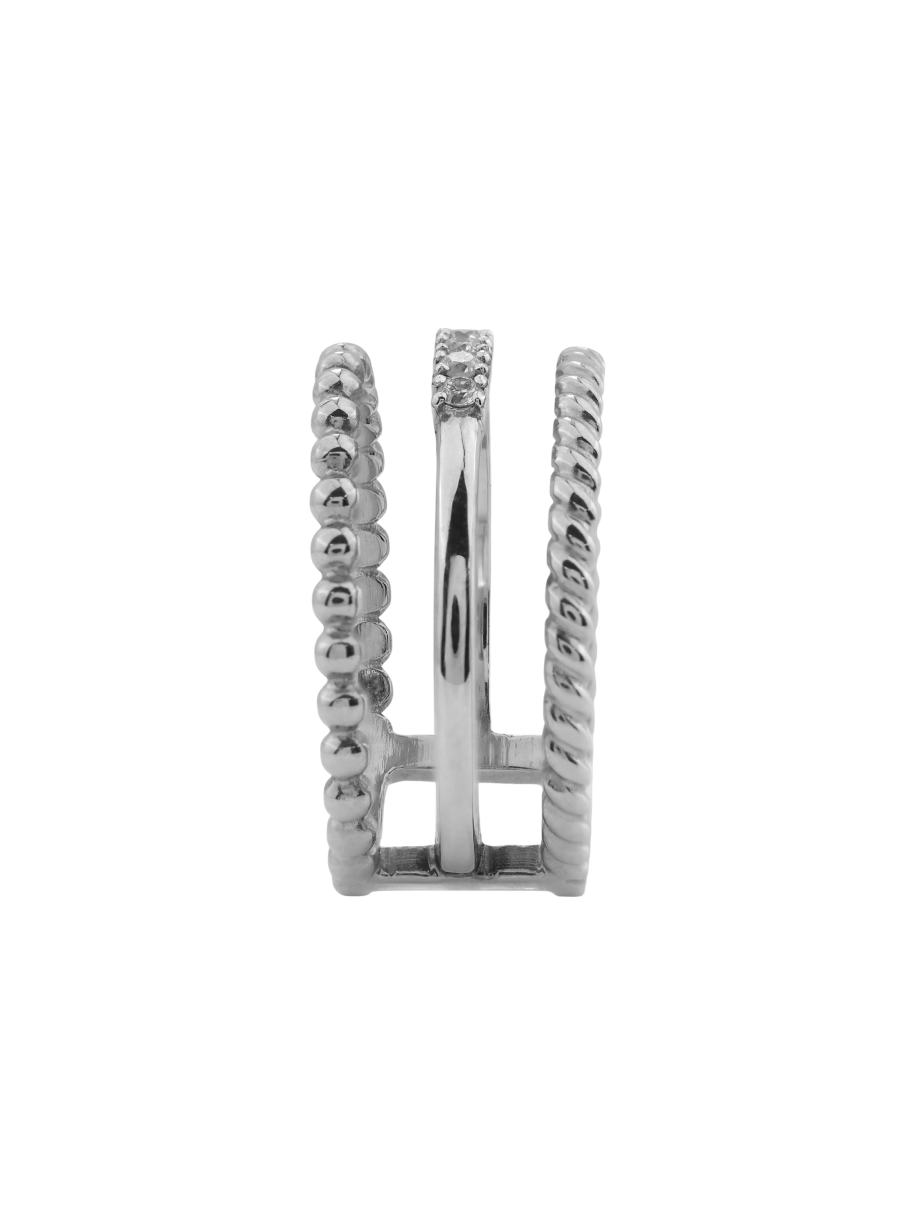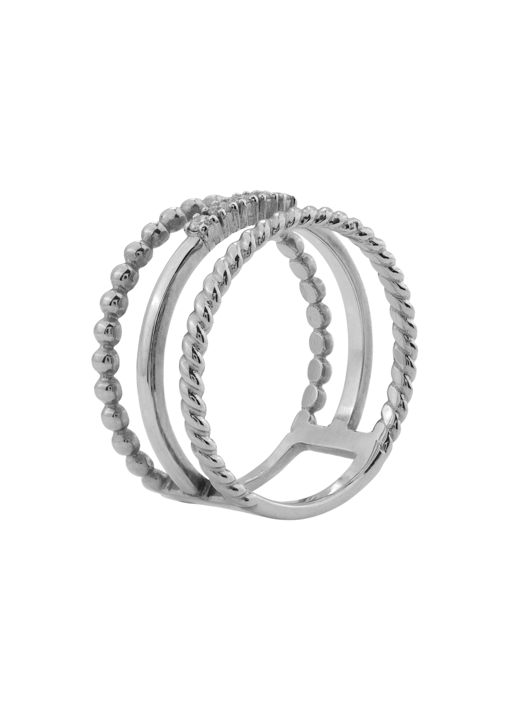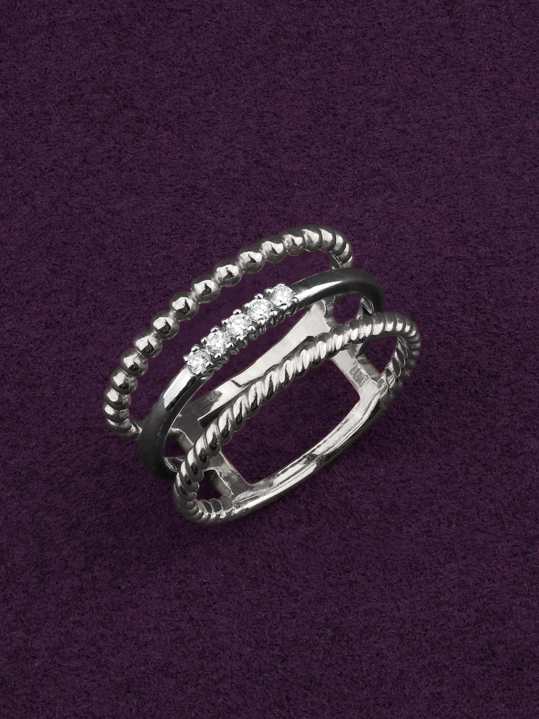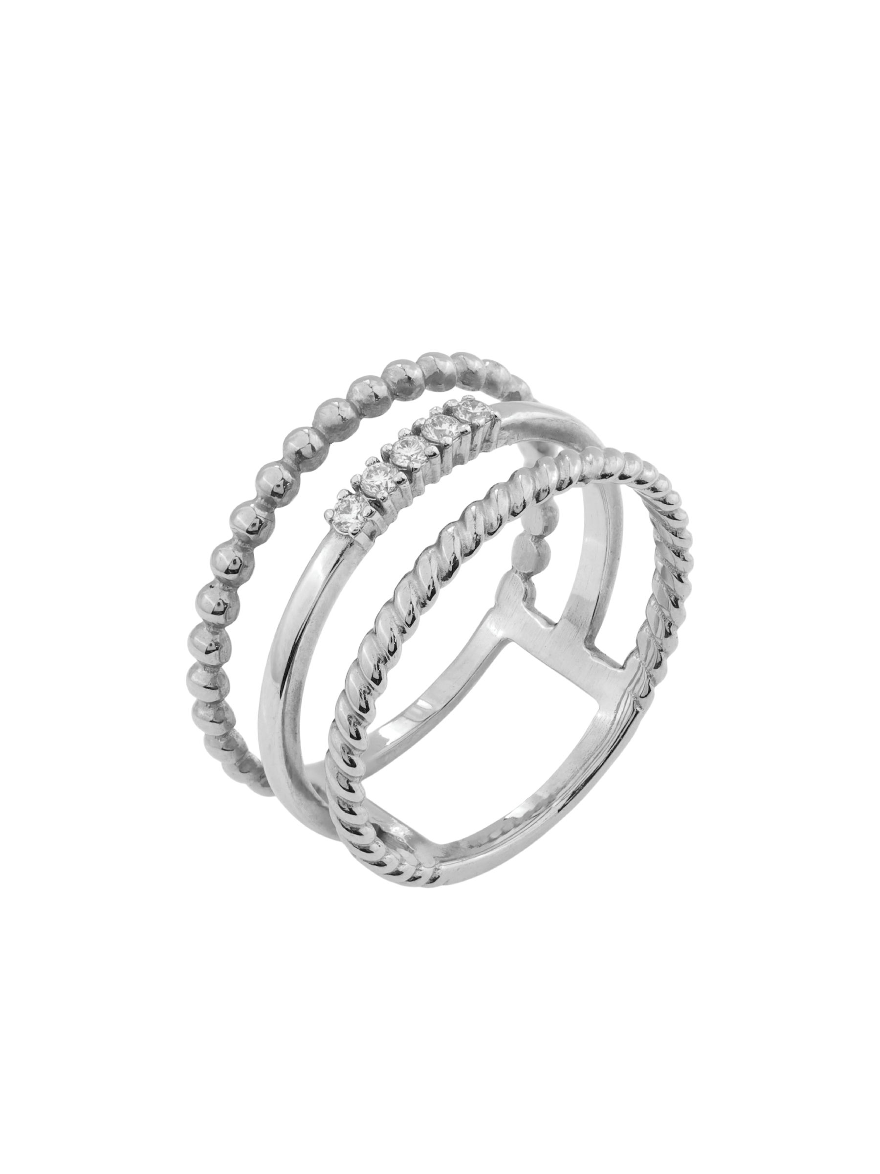 Центральным элементом композиции является дорожка из 5 сверкающих бриллиантов. Белые вставки круглой огранки обладают завораживающим сиянием, которое эффектно подчеркивается холодным блеском белого золота. Сложная многослойная конструкция кольца делает его нетривиальным выбором для тех, кто ценит сочетание архитектурных форм и классических материалов. Это украшение универсально: оно гармонично смотрится как на женской, так и на мужской руке, становясь стильным аксессуаром для любого случая.