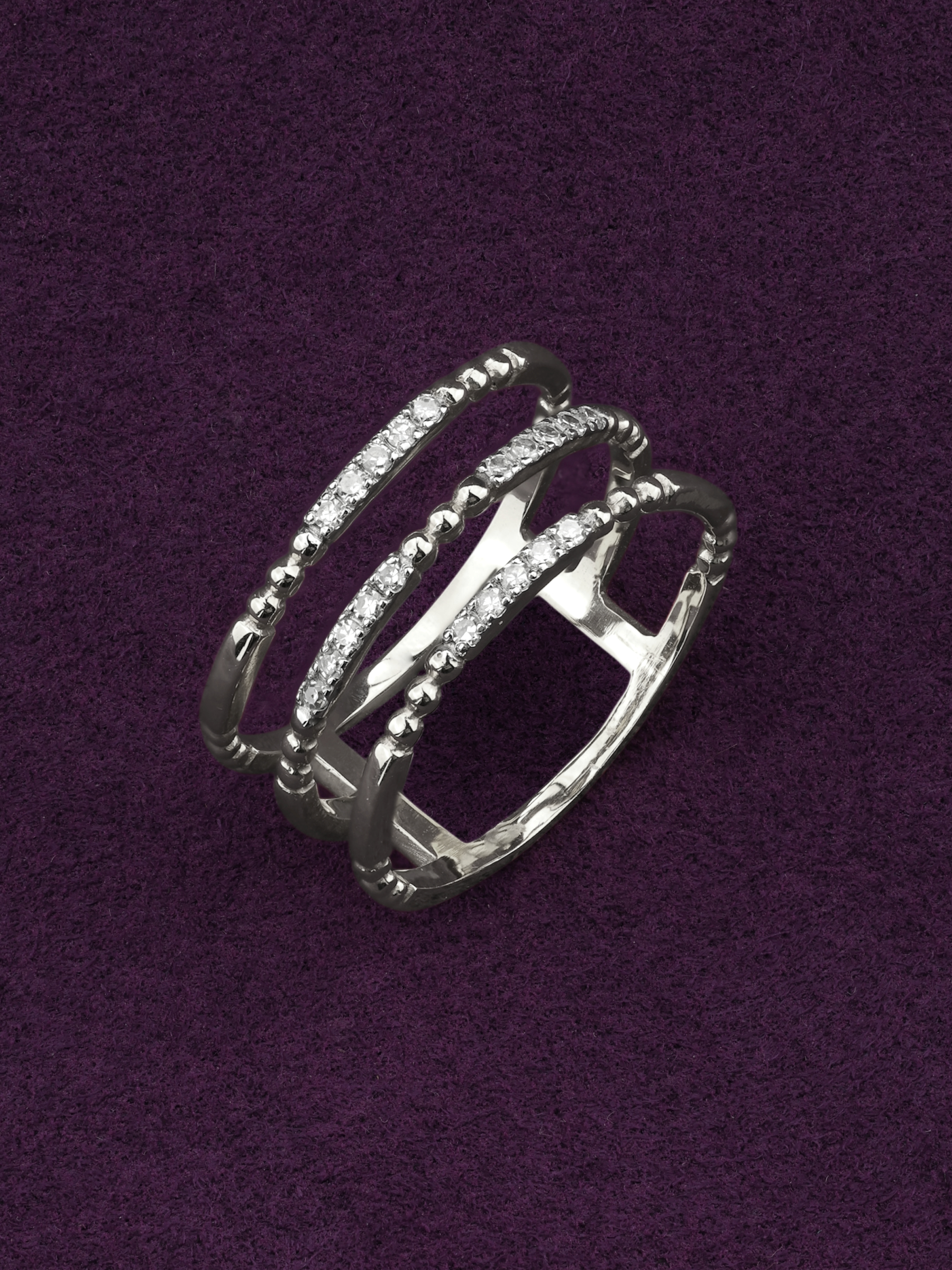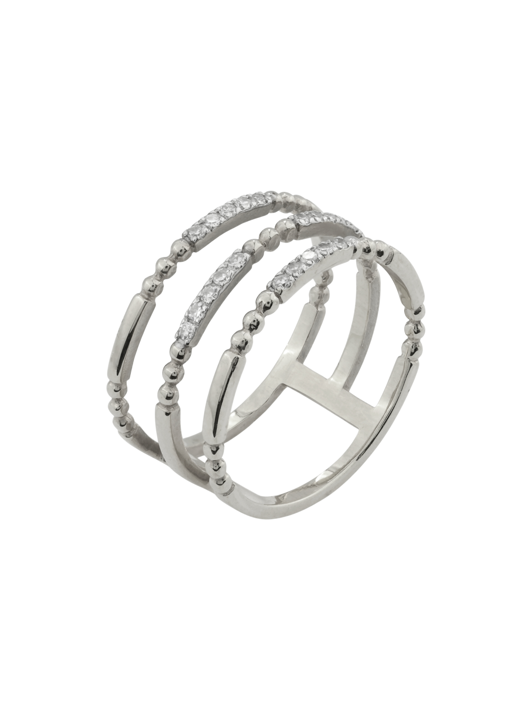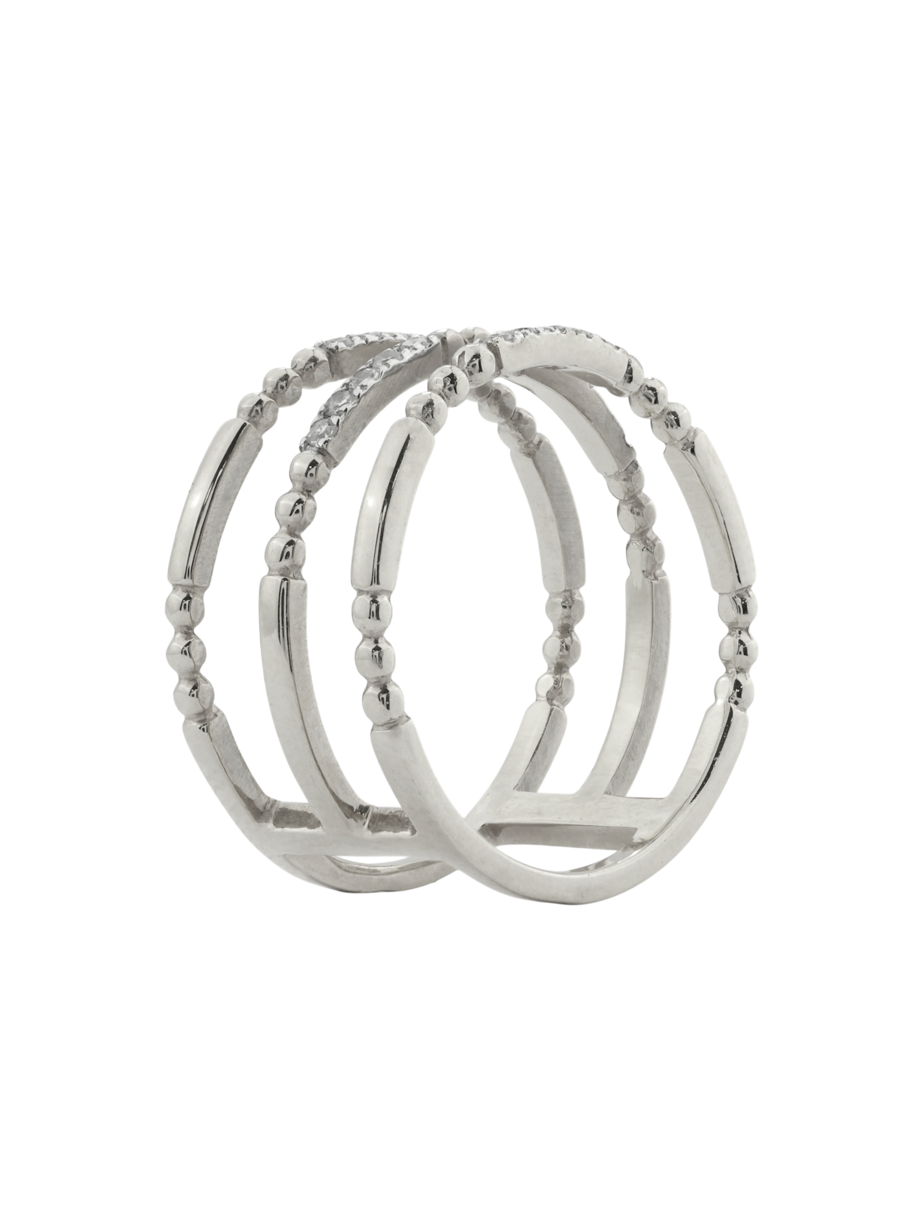 Элегантное кольцо из белого золота 585 пробы из коллекции De Luxe Бриллианты — Balls станет воплощением вашего безупречного стиля. Это ювелирное изделие представляет собой сложную многоярусную конструкцию из нескольких шинок, которые соединены между собой, создавая эффектный объемный образ. Дизайн мастерски сочетает гладкий блеск благородного металла с деликатной фактурой: часть элементов украшена миниатюрными шариками, придающими кольцу особую выразительность.