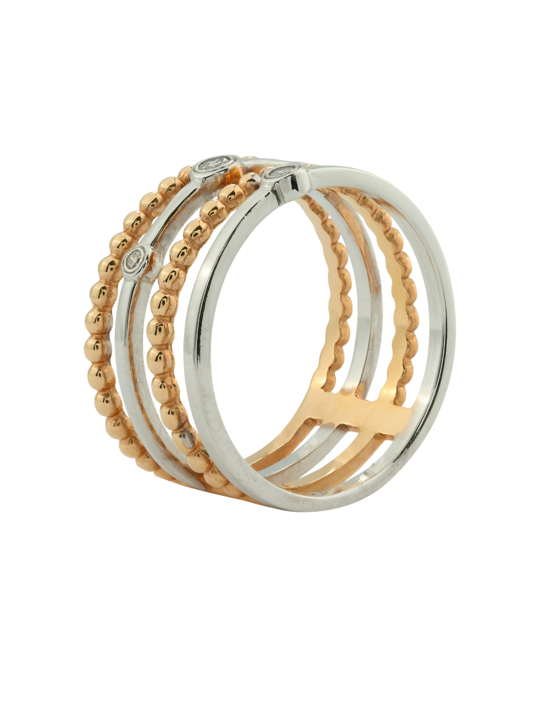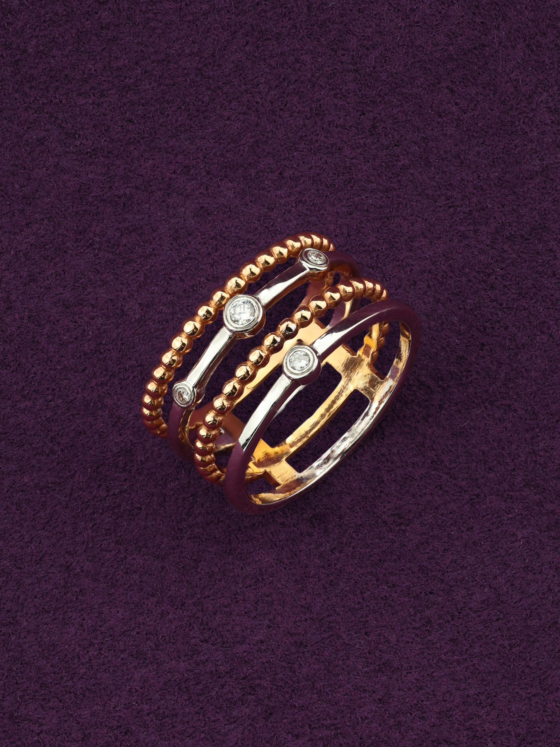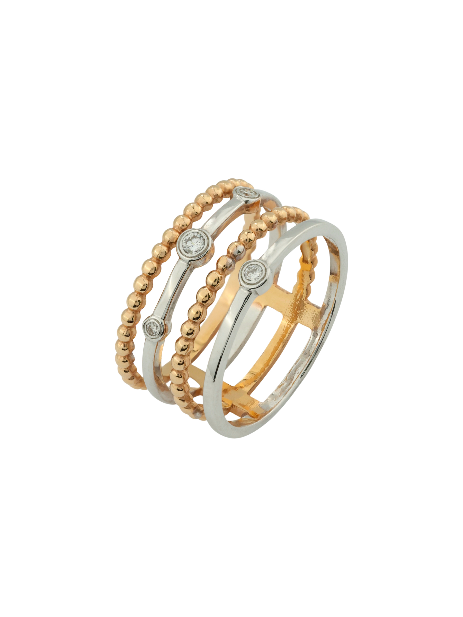 Элегантное кольцо из красного золота 585 пробы — это воплощение безупречного вкуса и современного стиля. Изделие из коллекции De Luxe Бриллианты — Balls привлекает внимание своей необычной многоярусной конструкцией: сочетание гладких линий и фактурных элементов, напоминающих изящные бусины, создает динамичный и выразительный объем. Ювелиры гармонично дополнили композицию четырьмя бриллиантами круглой формы, которые придают украшению особенное благородное сияние.