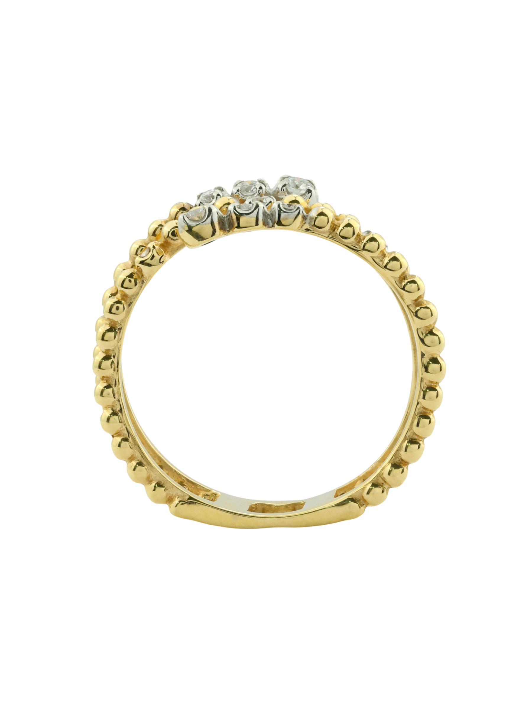 В качестве вставок использованы 9 великолепных бриллиантов круглой огранки. Белый цвет камней создает эффектный контраст с теплым сиянием лимонного металла, добавляя украшению особую глубину и выразительность. Тщательно проработанная форма кольца делает его универсальным аксессуаром: оно гармонично дополнит как элегантный женский образ, так и стильный мужской аутфит, становясь акцентным элементом вашего ювелирного гардероба.