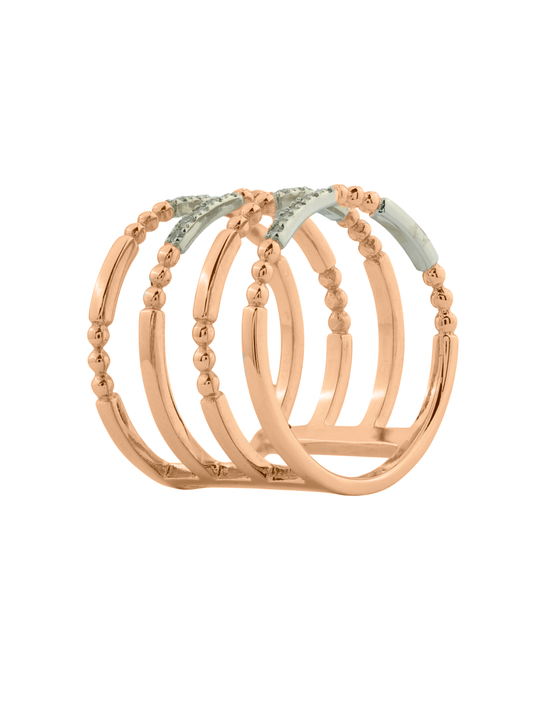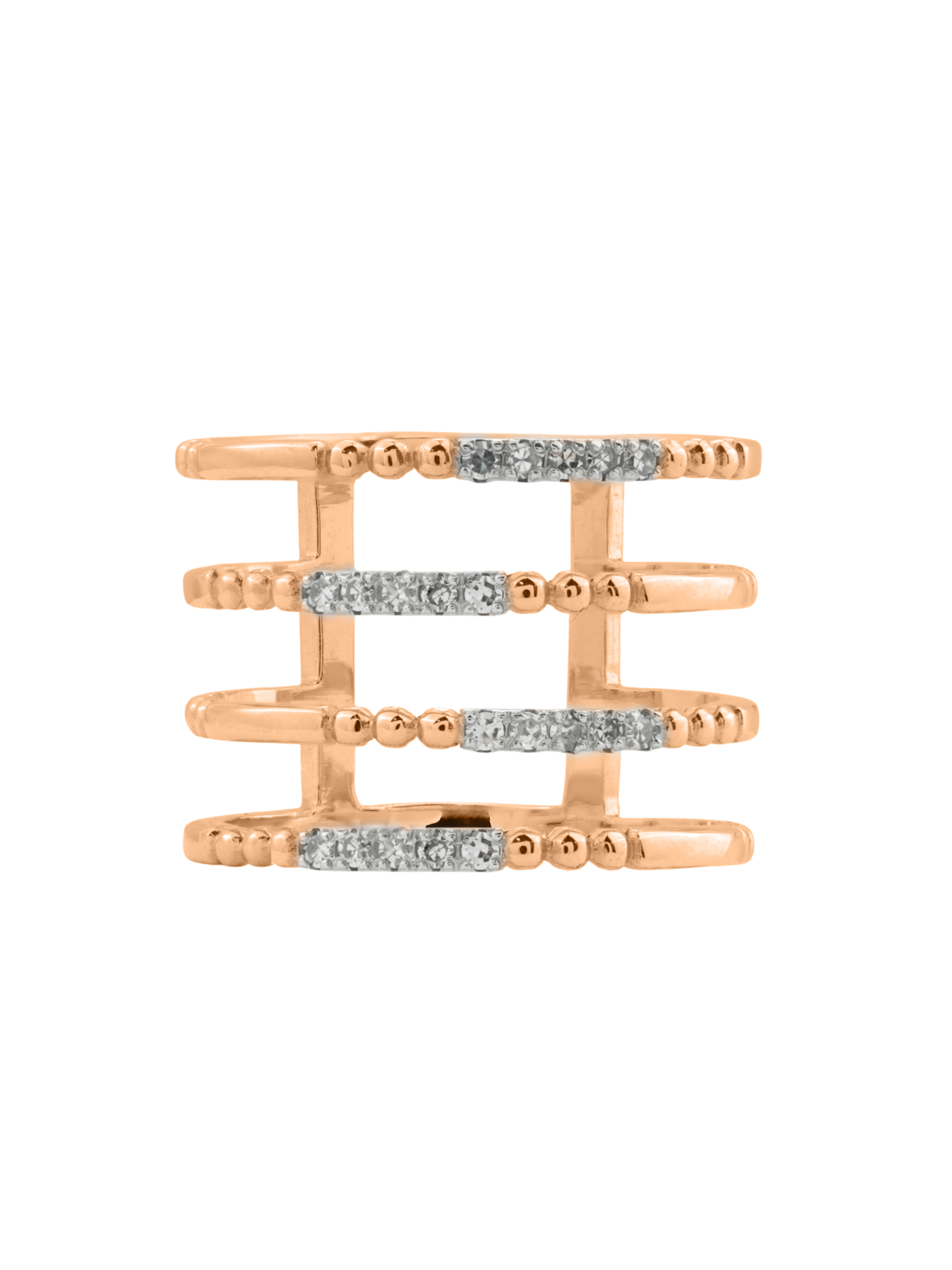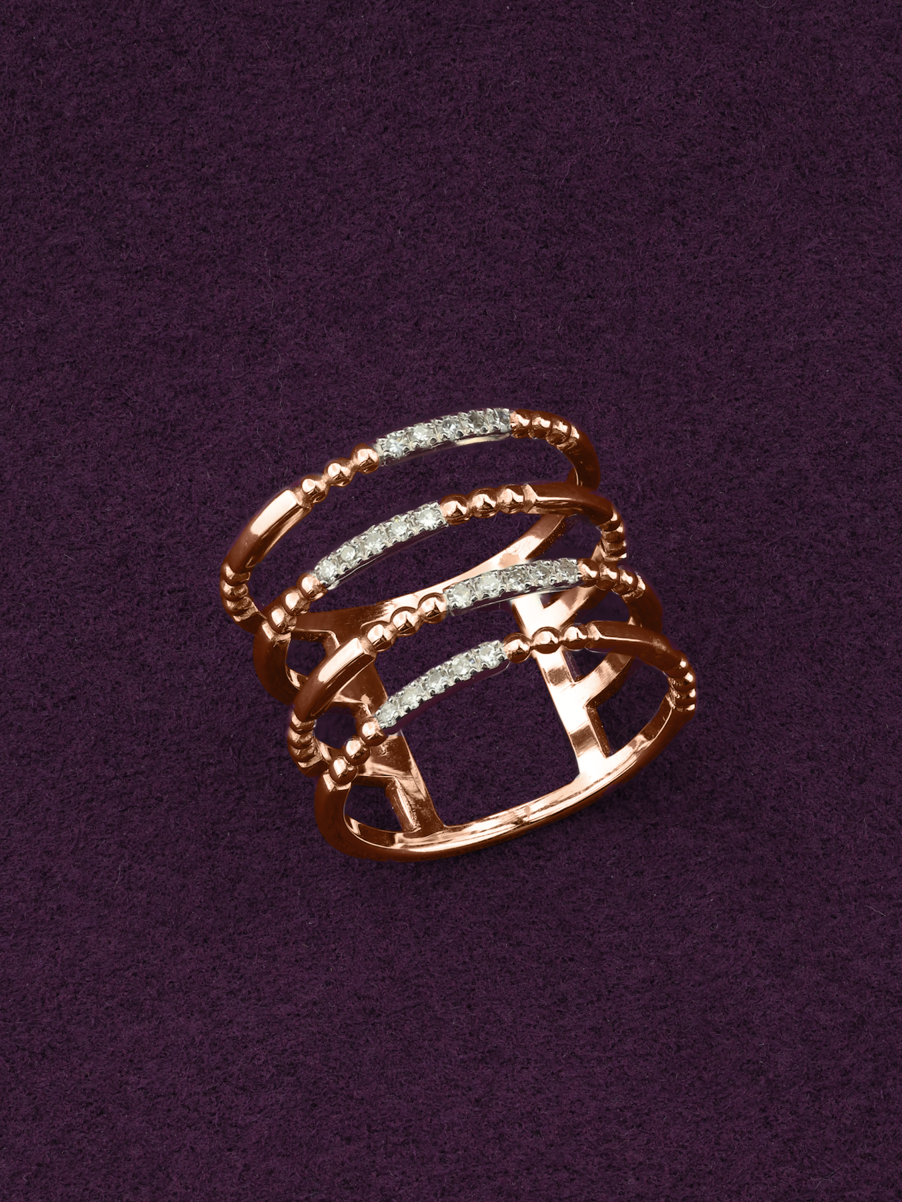 Элегантное кольцо из красного золота 585 пробы станет безупречным акцентом вашего образа, подчеркивая утонченный вкус и статус. Украшение из коллекции De Luxe Бриллианты — Balls привлекает внимание своим необычным дизайном: широкая шинка выполнена из нескольких переплетающихся линий с оригинальной фактурой, напоминающей ряд изящных бусин. Контраст благородного красного золота и сияющих вставок делает это изделие универсальным дополнением как для повседневного, так и для вечернего гардероба.
