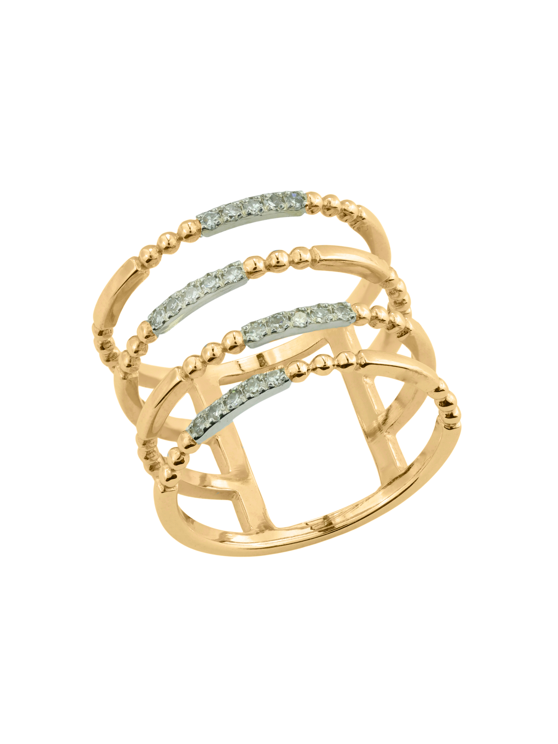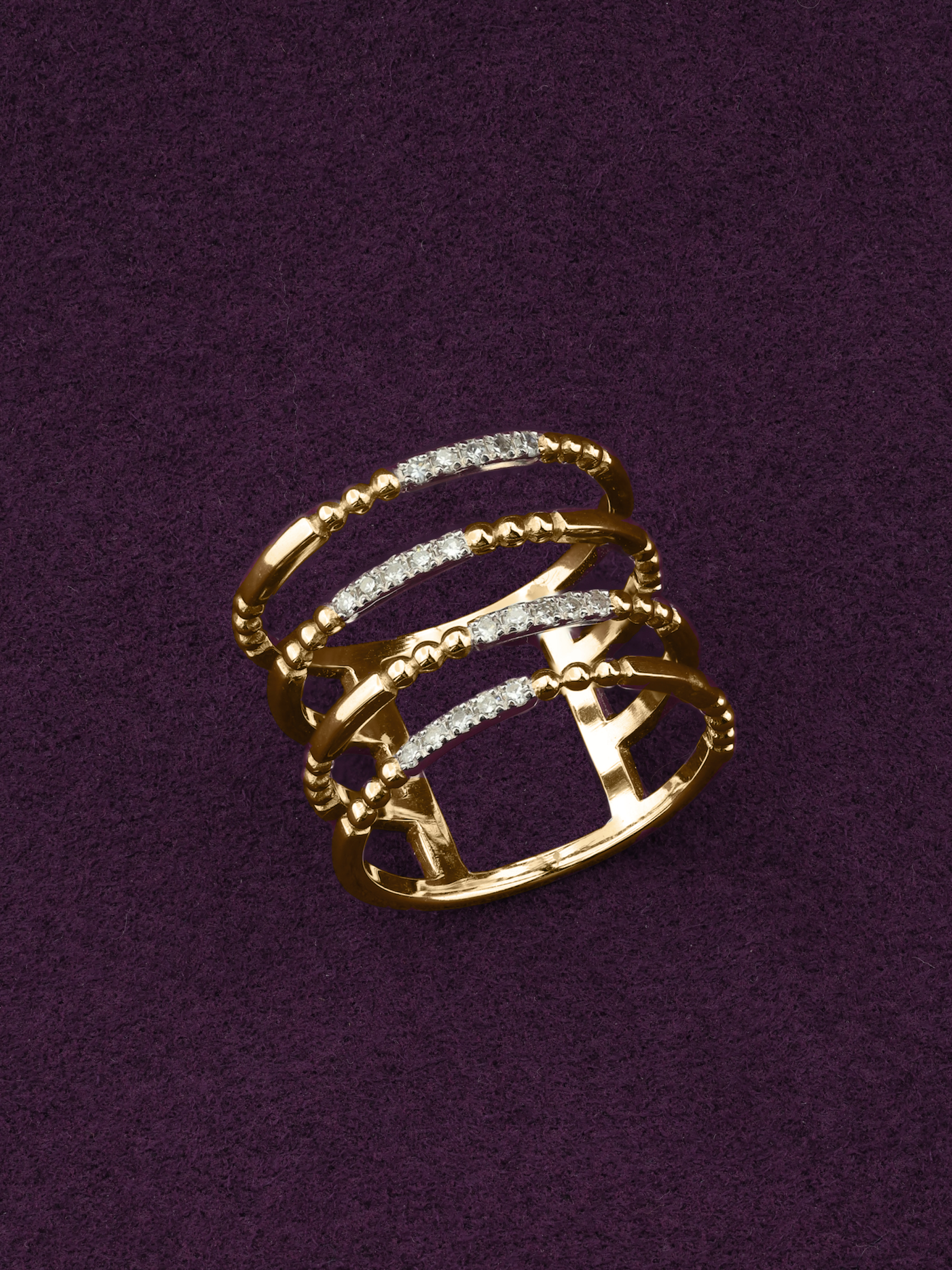 Эффектное кольцо из лимонного золота 585 пробы станет центральным акцентом вашего образа, подчеркивая статус и безупречный вкус. Ювелирное изделие из коллекции De Luxe Бриллианты — Balls привлекает внимание своим архитектурным дизайном: композиция из нескольких тонких шинок, декорированных изящными шариками, создает выразительный объем и динамику. Необычная фактура металла великолепно сочетается с благородным блеском вставок.