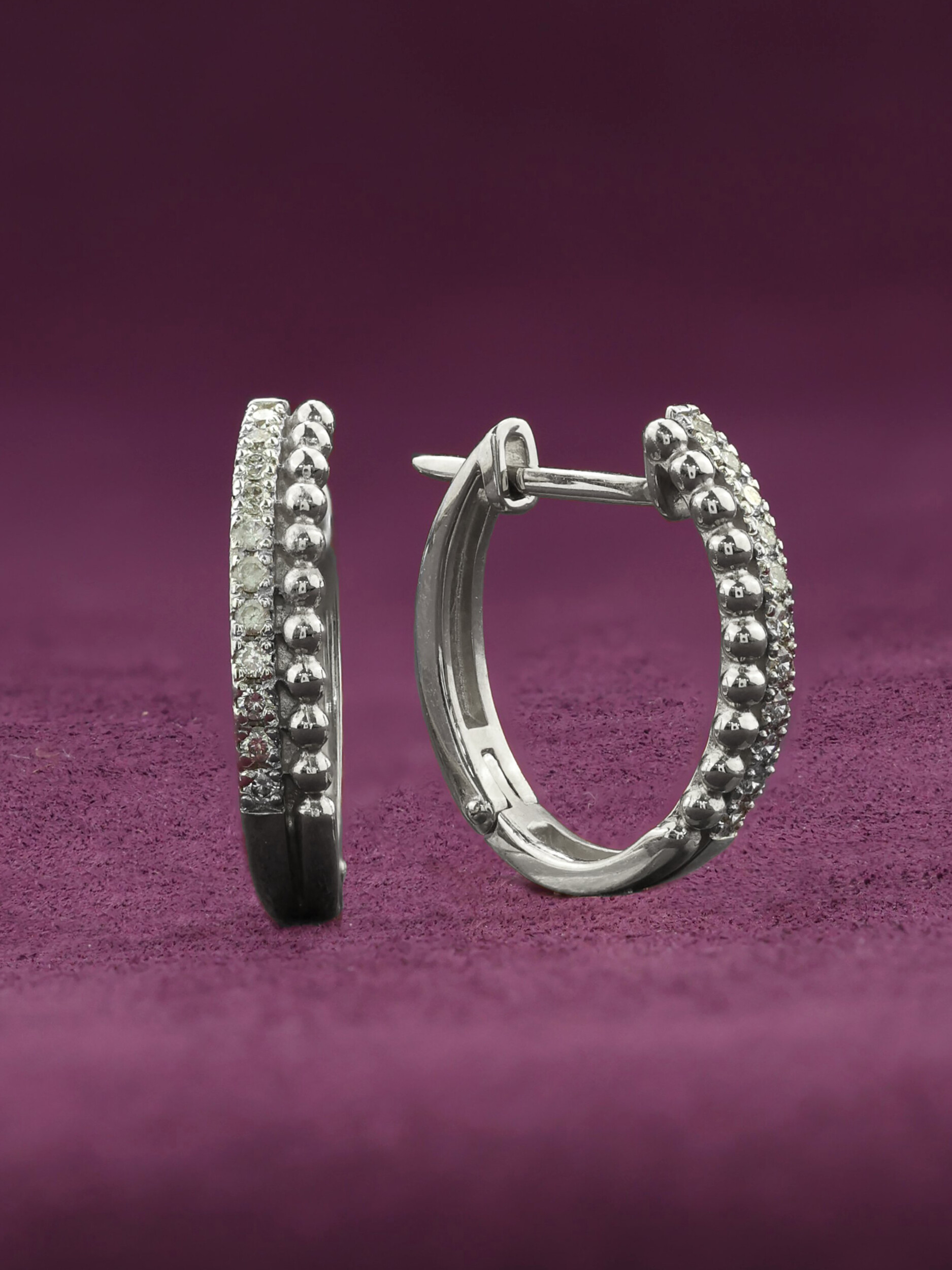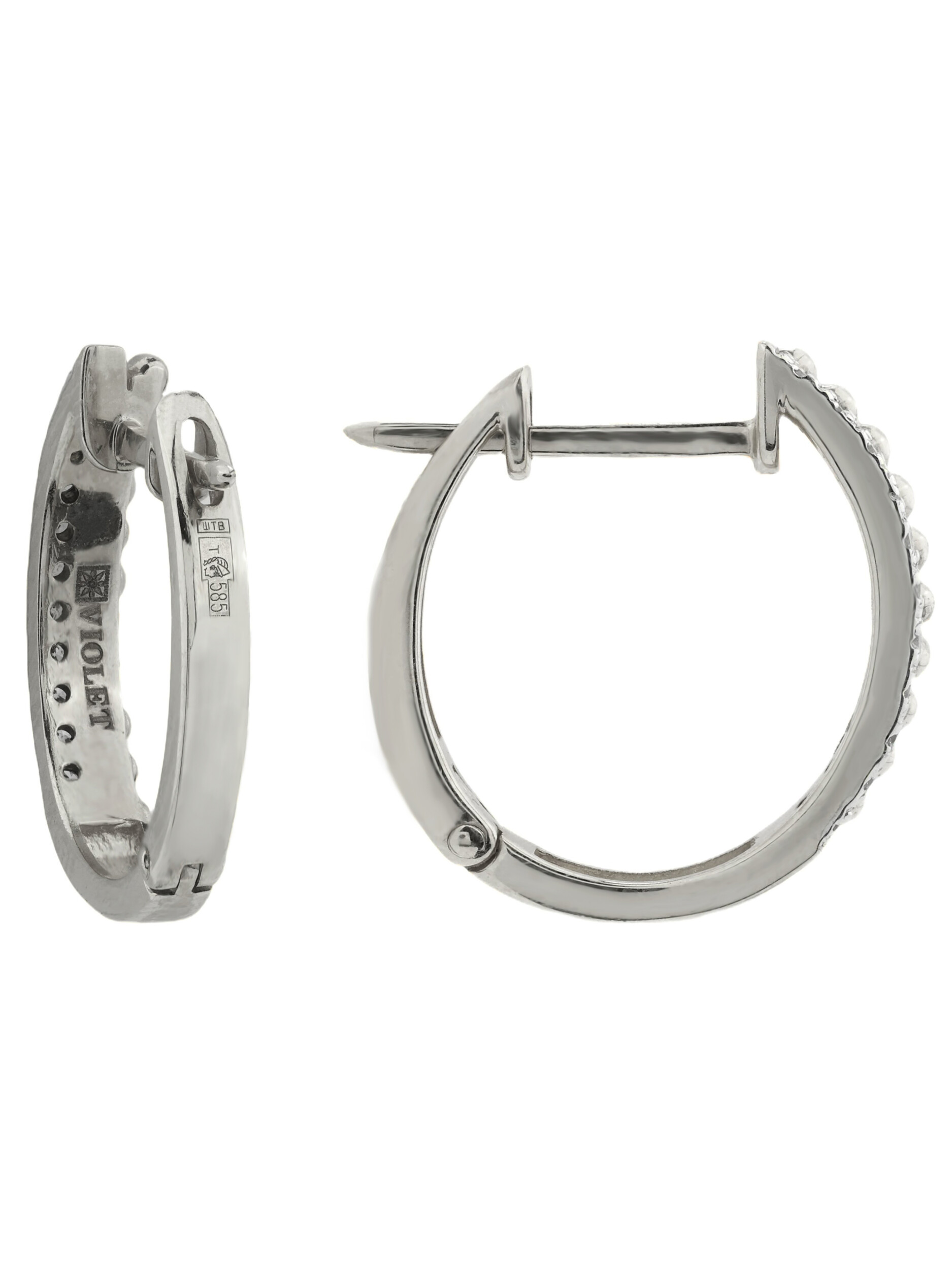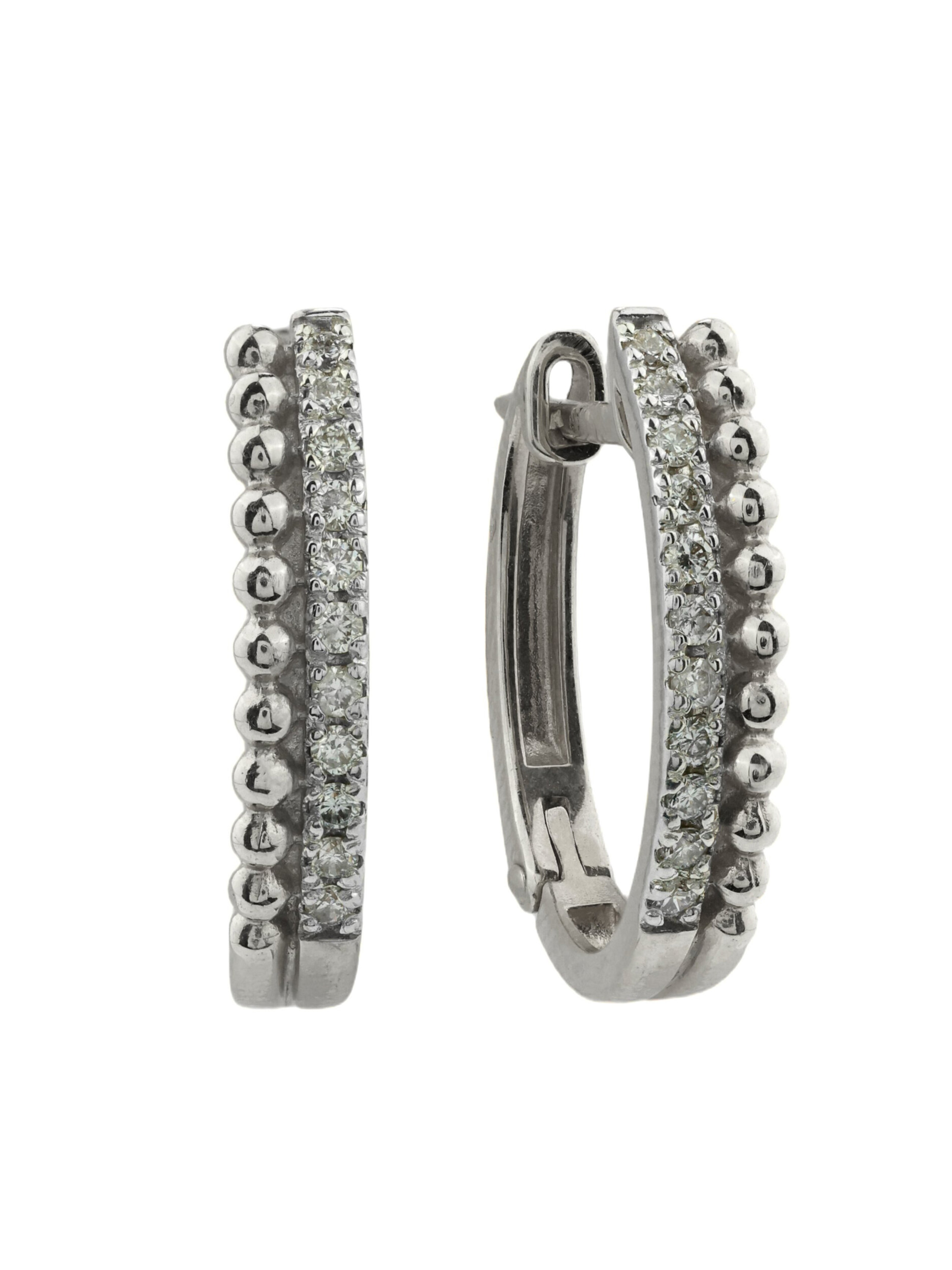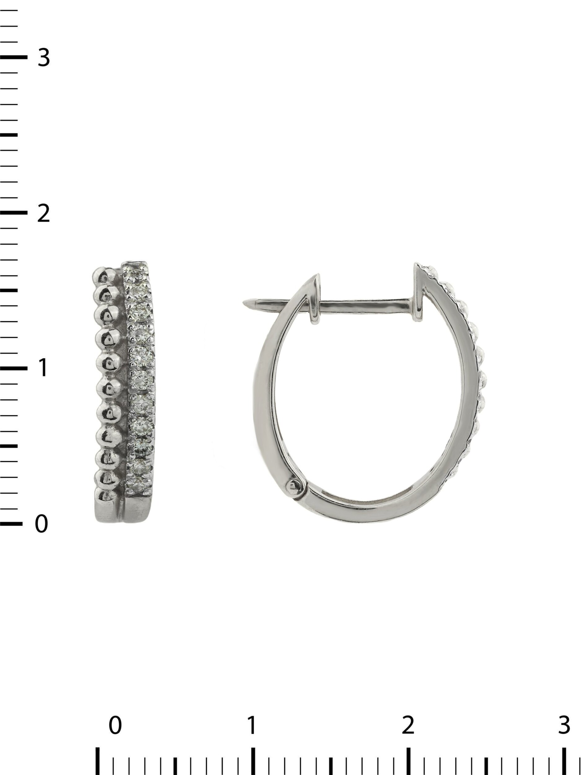 Дизайн изделия притягивает взгляд своей детализацией: одна сторона украшена рядом деликатных металлических шариков, которые создают необычную текстуру, а вторая инкрустирована сверкающими бриллиантами. Всего в изделии использовано 22 бриллианта круглой формы, которые за счет своей огранки и белого цвета вставок преломляют свет, создавая невероятное мерцание при каждом движении. Сочетание благородного металла и классических камней делает эти серьги универсальным аксессуаром, который уместен как в деловом стиле, так и в рамках вечернего выхода.