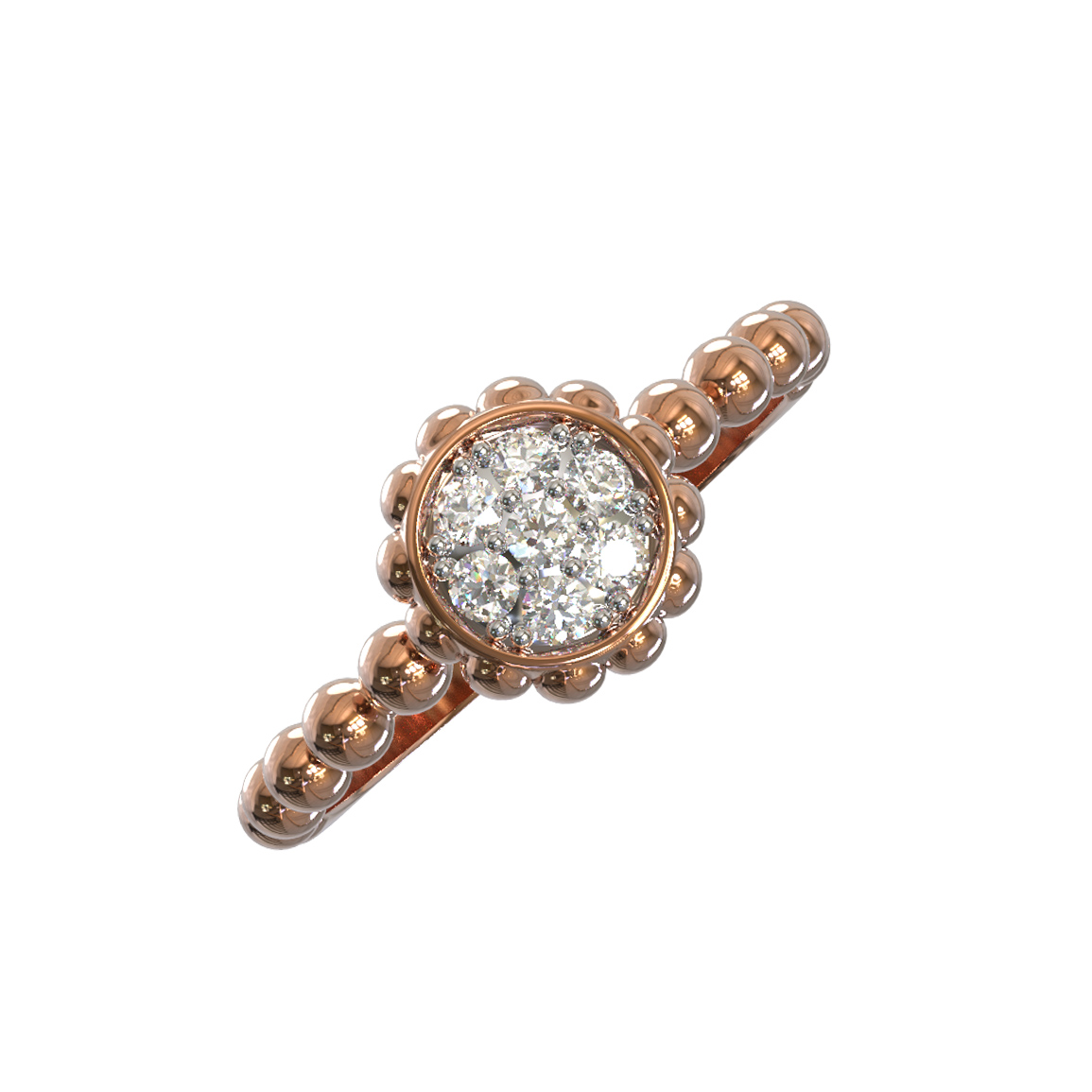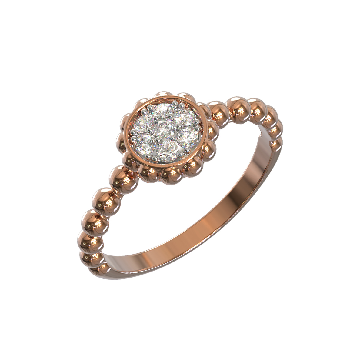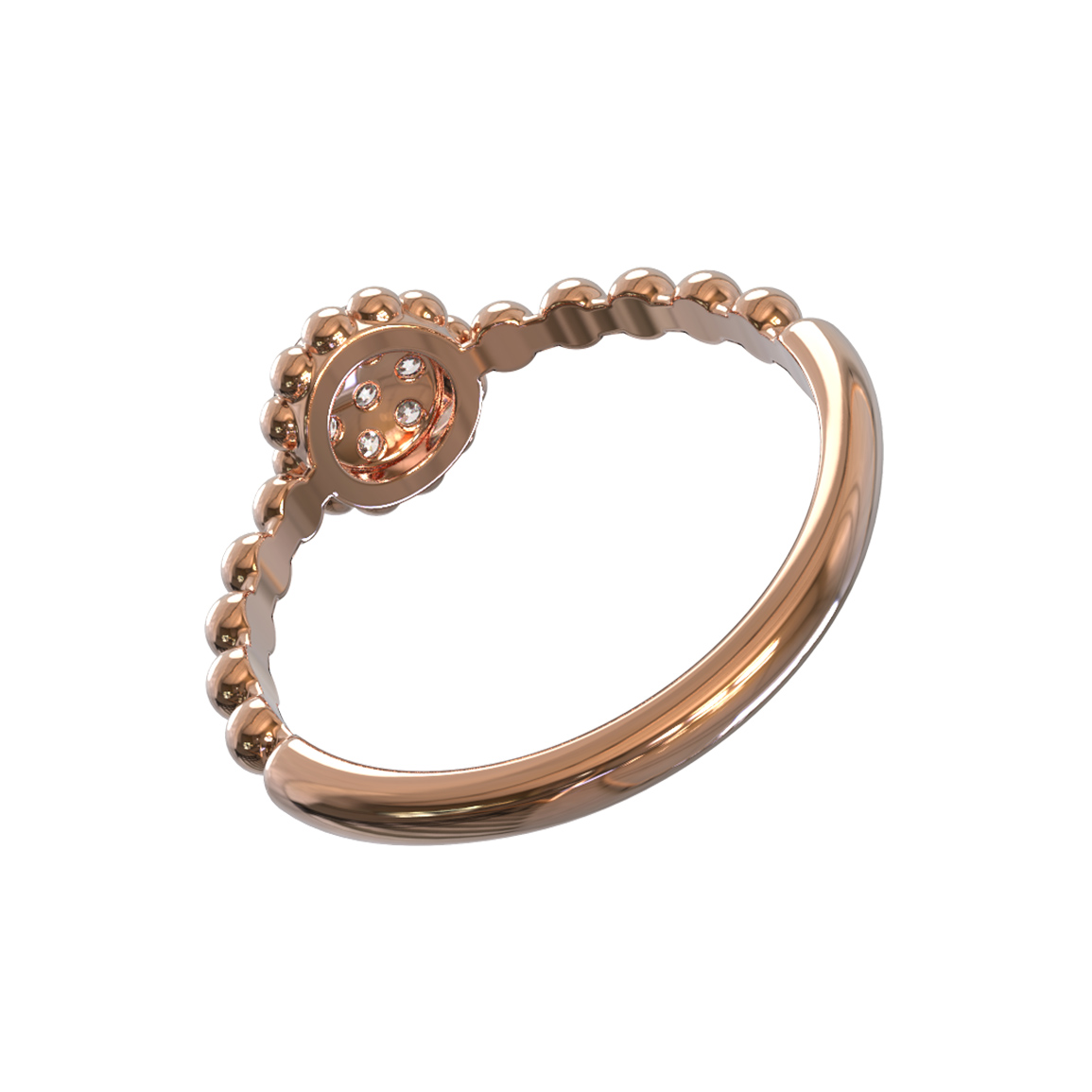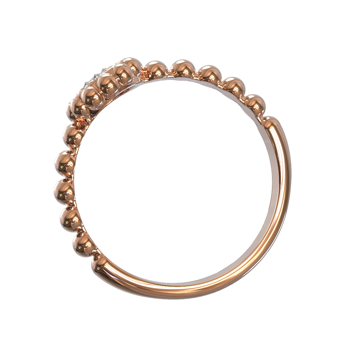 Центральным элементом композиции является круглая площадка, инкрустированная семью сверкающими бриллиантами. Белый цвет вставок эффектно контрастирует с теплым оттенком красного золота, создавая яркую игру света при каждом движении. Круглая форма вставок подчеркивает классическую эстетику, переосмысленную в духе современных ювелирных трендов.