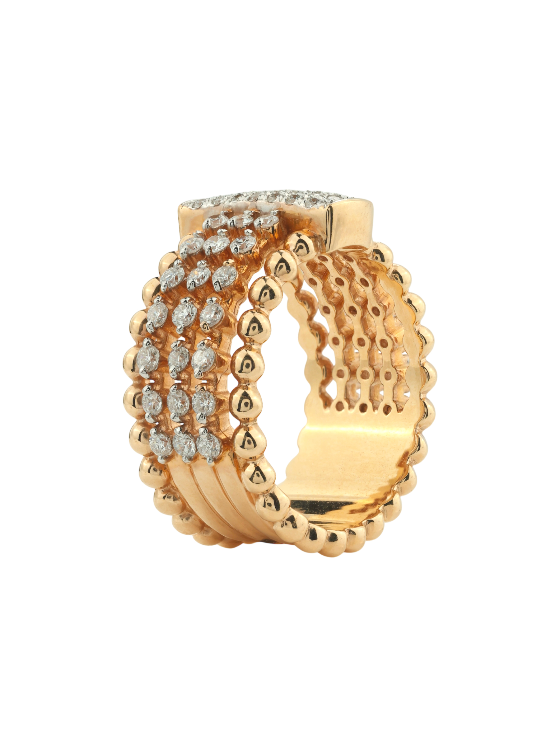 В качестве вставок использованы 72 бриллианта классической круглой огранки. Белый цвет вставок эффектно контрастирует с красным золотом, усиливая блеск и создавая игру света при каждом движении руки. Это массивное и статусное украшение универсально в своем применении — оно подходит как для женщин, так и для мужчин, предпочитающих выразительные ювелирные изделия.