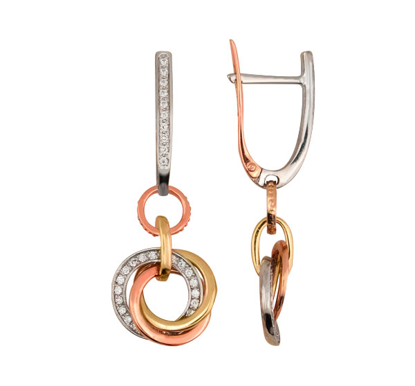 Изысканные серьги из красного золота 585 пробы из коллекции De Luxe Бриллианты — Trinity станут воплощением утонченного стиля и статуса. Эти ювелирные изделия отличает сложный дизайн, в котором переплетаются элементы разных оттенков, создавая гармоничную композицию. Основной акцент украшения сделан на сиянии драгоценных камней: серьги инкрустированы 66 бриллиантами круглой формы, которые мягко переливаются и придают изделию роскошное свечение. Белый цвет вставок эффектно контрастирует с теплым блеском красного золота.