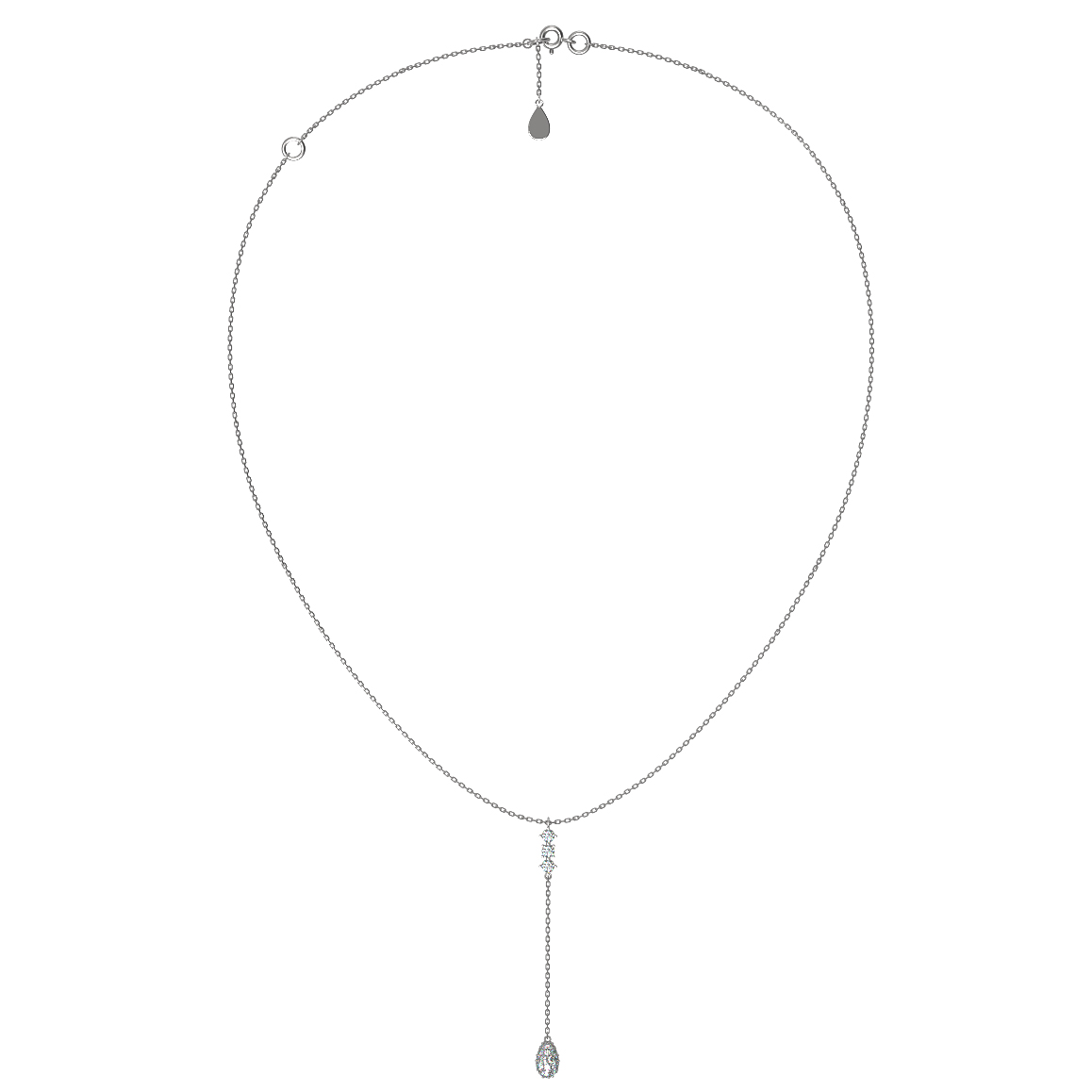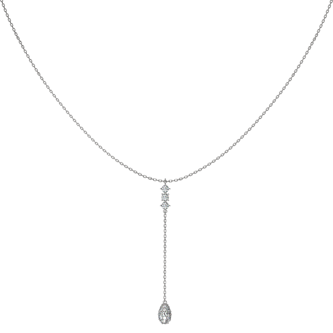 Дизайн модели подчеркивает грацию и изящество линий. Центральным акцентом композиции выступает вертикальная подвеска, инкрустированная 40 безупречными бриллиантами круглой формы. Белый цвет вставок гармонично дополняет холодный оттенок металла, создавая целостный и выразительный образ. Благодаря универсальному дизайну это колье станет достойным дополнением к образу как для женщин, так и для мужчин, подчеркивая индивидуальность и статус своего владельца.