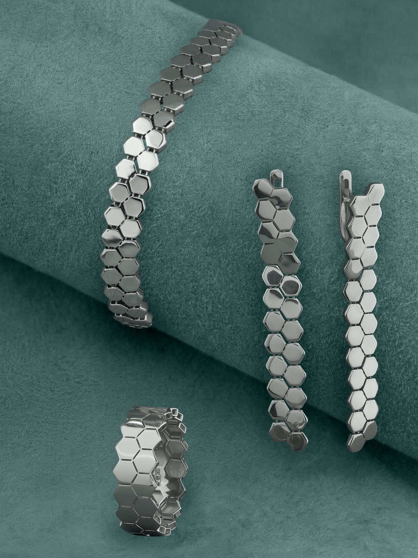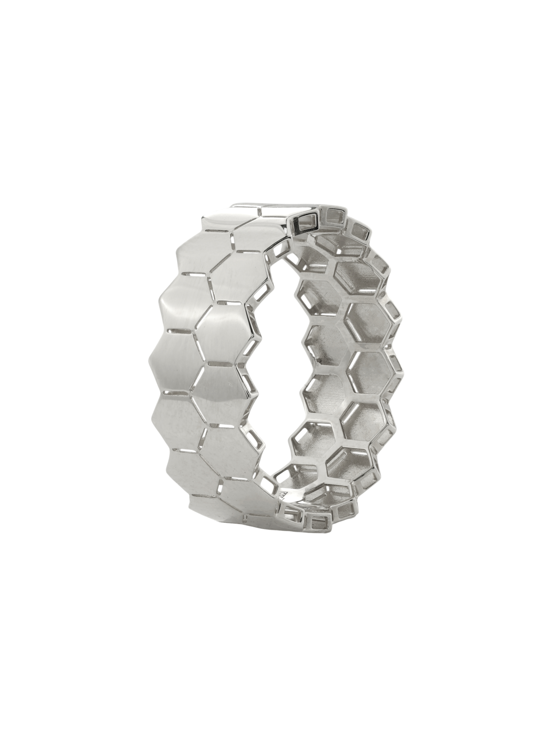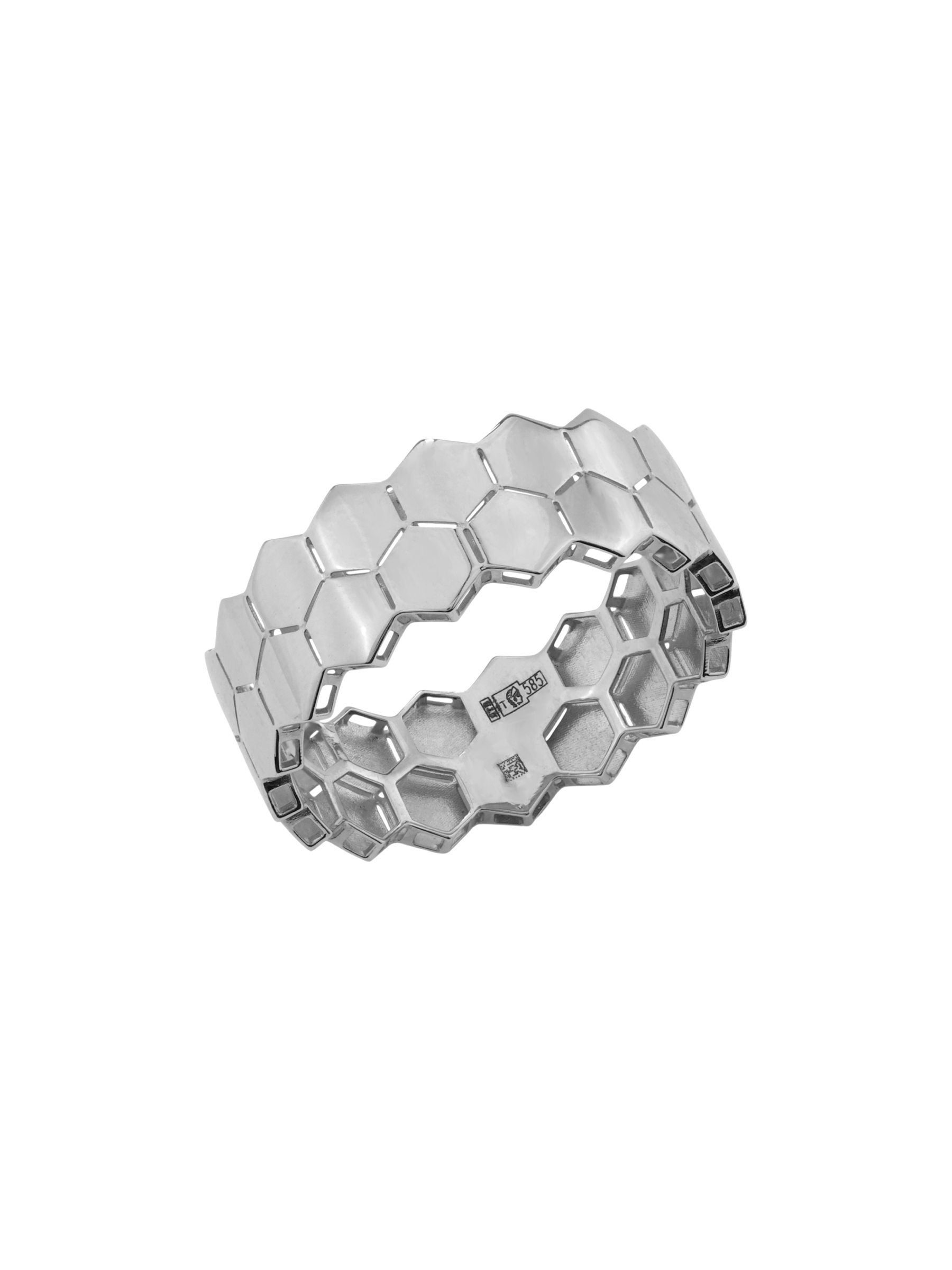 Это универсальное кольцо одинаково гармонично смотрится как на женской, так и на мужской руке, что делает его отличным выбором для создания парных украшений. Изделие выполнено в виде целостной структуры, напоминающей пчелиные соты, что обеспечивает комфортную посадку и привлекает внимание своей необычной фактурой. Мы предлагаем широкий размерный ряд для идеального выбора: доступны размеры 16.5, 17, 17.5, 18 и 18.5.