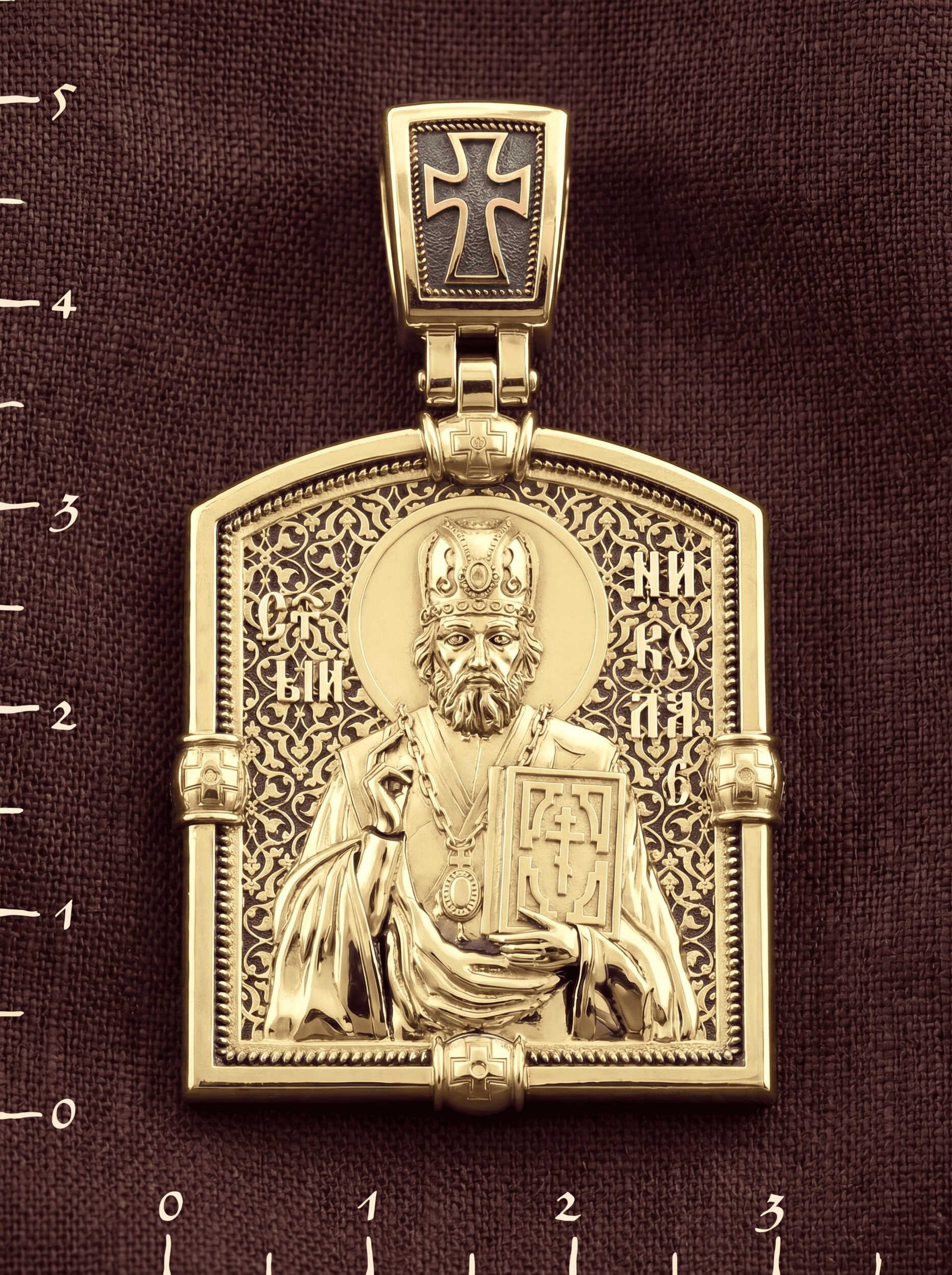 Лицевую сторону возглавляет икона Святителя Николая Чудотворца. Святитель Николай родился во второй половине III века в Малой Азии в Ликийском городе Патары. С рождения Божий Угодник проявлял необыкновенные дарования. Сохранилось Предание, что во время крещения он, никем не поддерживаемый, простоял в купели три часа. С детства святитель избегал пустых развлечений, любил молитву, прекрасно учился и проводил свободное время за чтением Священного Писания. По достижении зрелого возраста жители Патар выбрали его своим пресвитером. Несколько лет спустя Святой Николай стал епископом в городе Миры, столице Ликии.