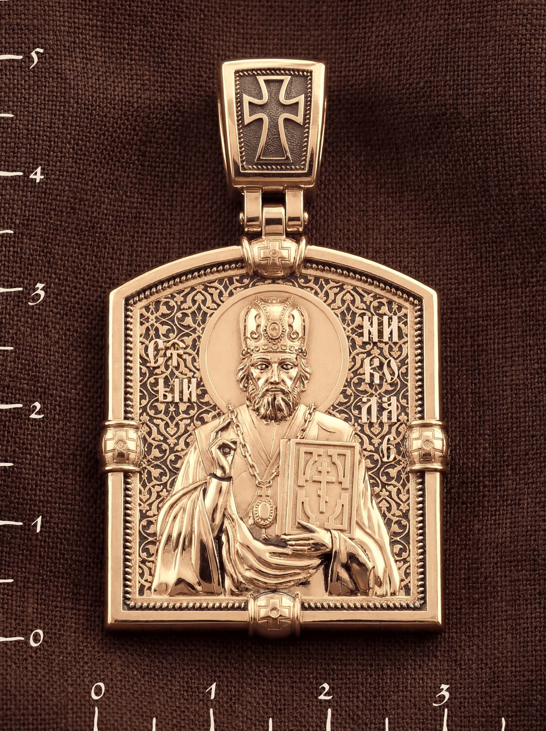 Лицевую сторону возглавляет икона Святителя Николая Чудотворца. Святитель Николай родился во второй половине III века в Малой Азии в Ликийском городе Патары. С рождения Божий Угодник проявлял необыкновенные дарования. Сохранилось Предание, что во время крещения он, никем не поддерживаемый, простоял в купели три часа. С детства святитель избегал пустых развлечений, любил молитву, прекрасно учился и проводил свободное время за чтением Священного Писания. По достижении зрелого возраста жители Патар выбрали его своим пресвитером. Несколько лет спустя Святой Николай стал епископом в городе Миры, столице Ликии.