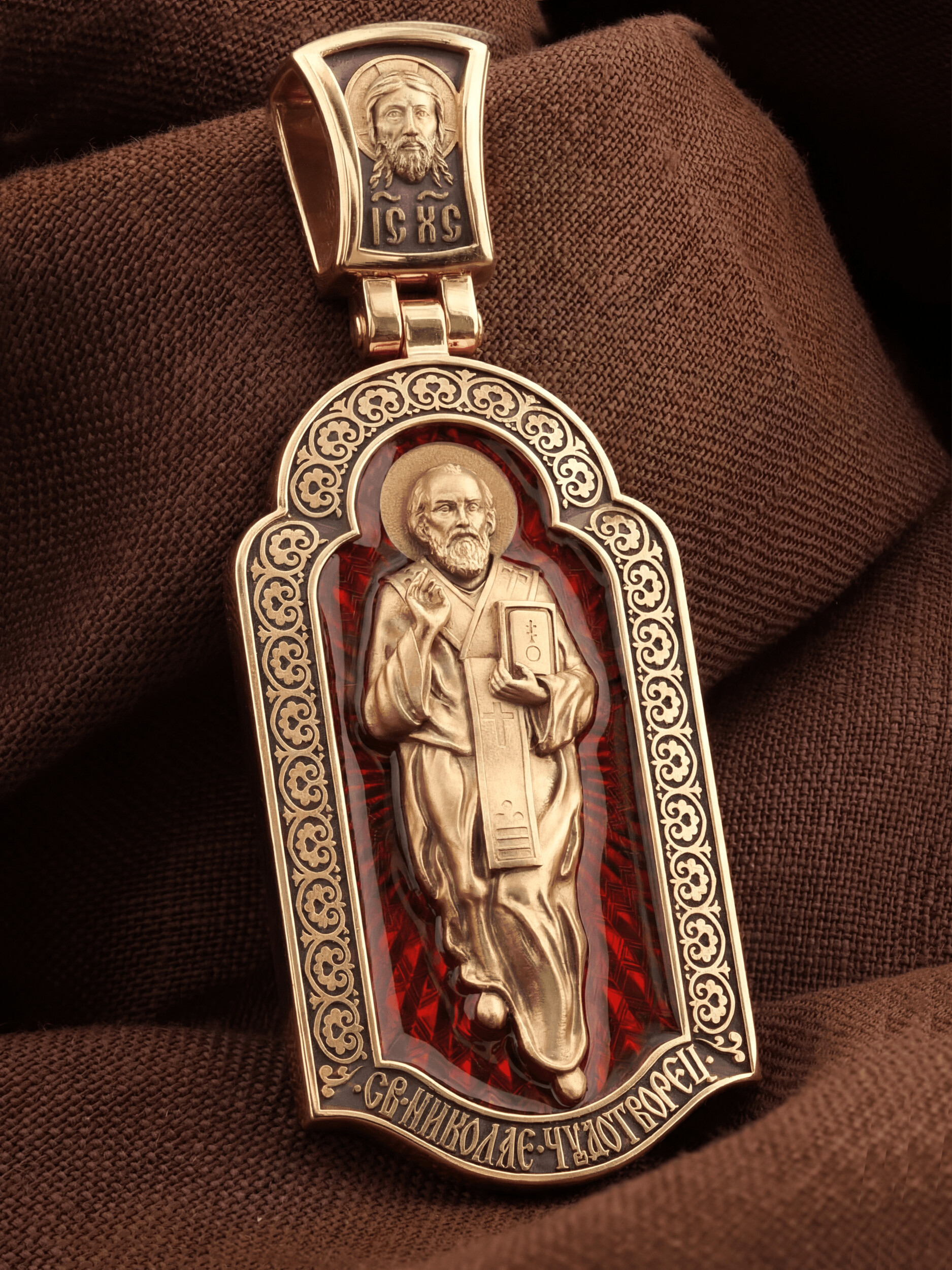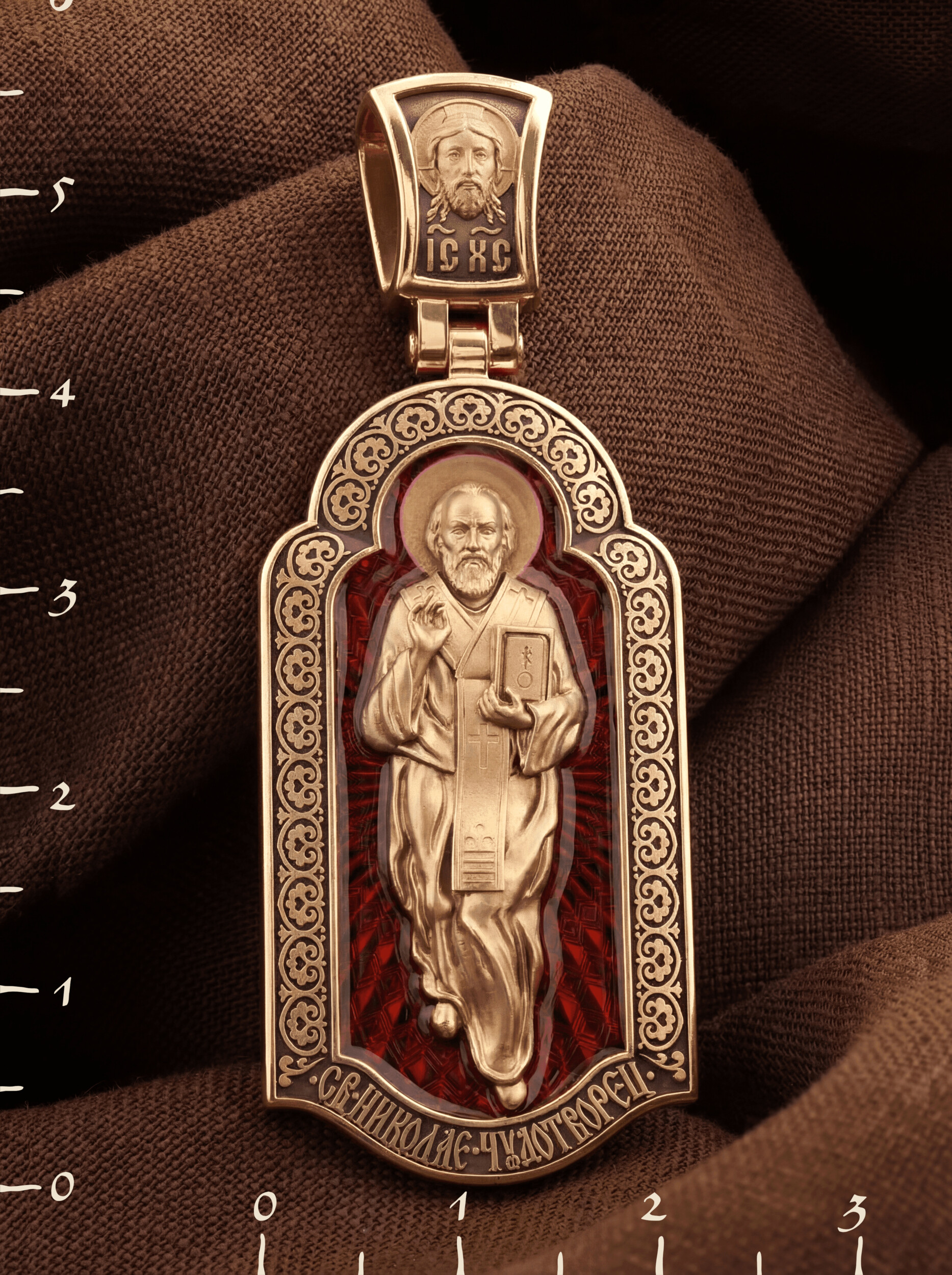 На лицевой стороне образка изображен Святитель Николай архиепископ Мир Ликийских, Чудотворец. Он является одним из самых почитаемых святых в православном мире. Избранник Божий Николай стал вершиной всех добродетелей. С кем из величайших праведников не сравнялся он образом духовной красоты, кому из них не последовал в своих деяниях и чудотворениях? Всеблаженный Николай был кроток, как Моисей, мужественен, как Давид, славен простотой нрава, как Иаков. Словно Ной, он спасал стадо Господне в новом ковчеге от потопа ересей. Вся жизнь святого Николая — это служение Богу. Много великих чудес сотворил на земле и на море великий Святитель Николай Угодник. Он укрощал штормы, спасал от потопления и выносил на сушу из глубины морской, освобождал из плена и приносил освобожденных домой, избавлял от уз и темницы, освобождал от смерти и подавал многим различные исцеления: слепым — прозрение, хромым — хождение, глухим — слух.