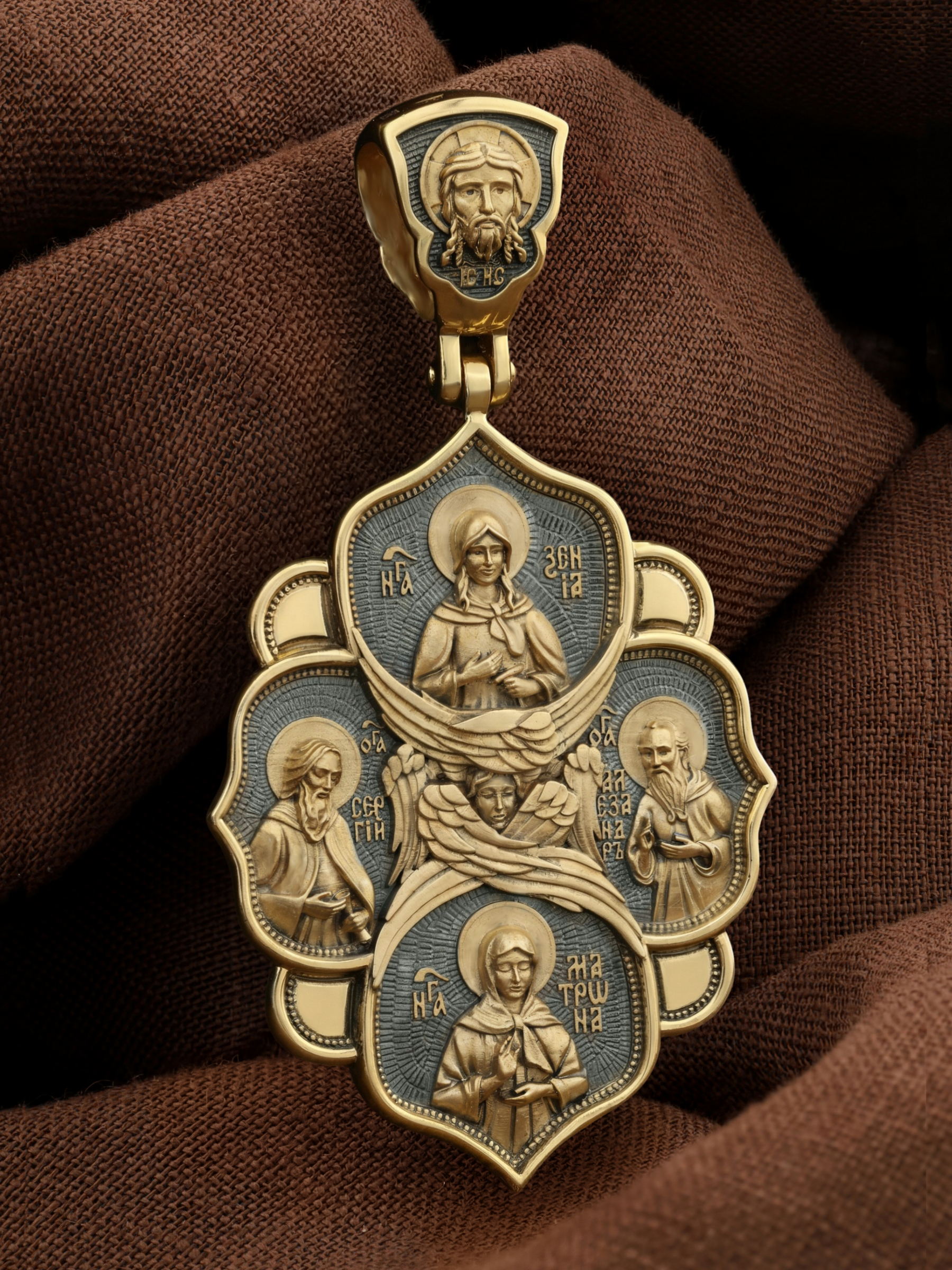 Справа от Серафима изображен преподобный. Александр Свирский. Преподобный Александр Свирский — великий русский святой. Прославился многими чудесами, и один из немногих святых сподобился явления Святой Троицы. Вверху образка изображена блаженная Ксения Петербургская Она прославилась своим подвигом юродства ради Христа. Святая почитается как скорая помощница в устроении семейного счастья, помогает при болезнях детей и близких.