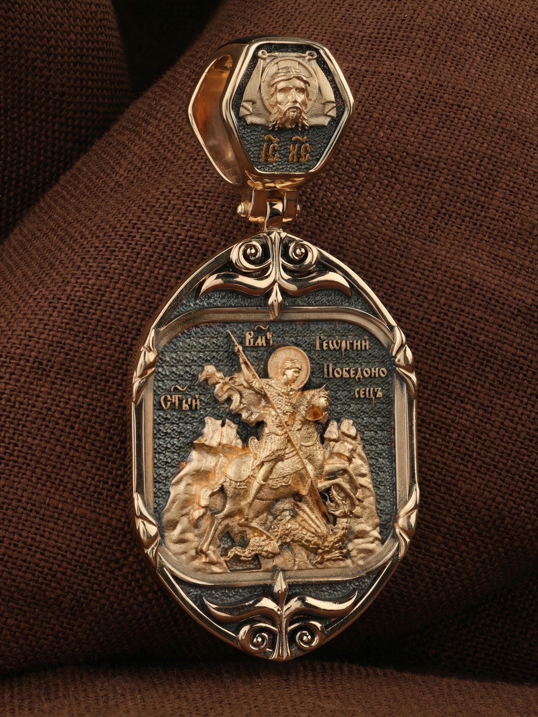Основой композиции лицевой стороны является изображение Святого Георгия Победоносца. Святой Георгий — один из наиболее почитаемых святых в Христианской Церкви. На Руси он известен как Юрий или Егорий, покровитель воинов, помощник в крестьянском труде. На образке изображено самое знаменитое чудо святого: спасение принцессы от змея, которому она предназначалась в жертву. Чудо это имеет символическое толкование. Принцесса означает душу человеческую, а змей — дьявола, желающего ее поглотить. Св. Георгий, небесный защитник, спускается с Небес, чтобы помочь душе избавиться от гибели.