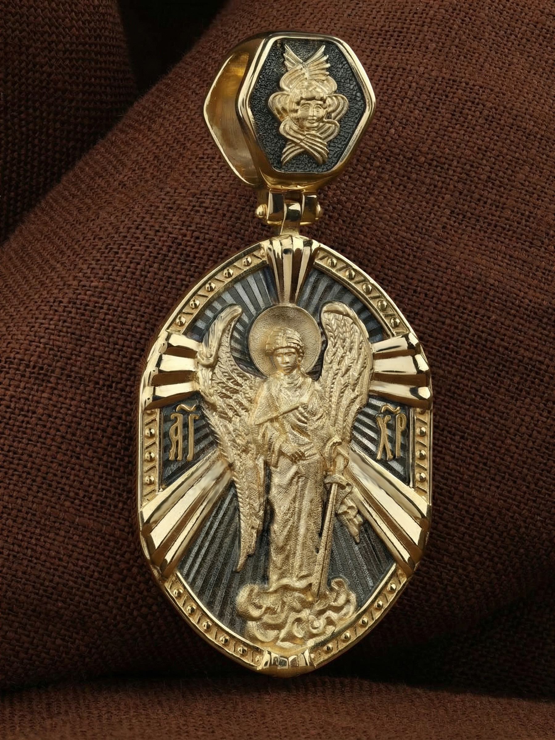 На оборотной стороне креста изображена прямостоящая фигура Ангела Хранителя с традиционными атрибутами в руках: крестом, которым он осеняет человека, и мечом для прогнания бесов. По Православному учению, каждому, принявшему святое крещение, дается Господом Ангел Хранитель, который сопровождает человека всю его жизнь, помогая в добрых делах и охраняя от нападок злых духов. Святые отцы утверждают, что только верующий человек имеет рядом с собой Ангела Хранителя: «Тем, которые сподобились крещения и возносятся на высоту добродетелей, даны от Бога Ангелы, заботящиеся о них и содействующие им. В этом уверяет нас Господь, когда говорит, что есть Ангелы Хранители у всякого, кто верует в Него» (преп. Анастасий Синаит). Но Ангел Хранитель пребывает с христианином, если только мы не прогоним его греховными делами, поскольку «как дым разгоняет пчел, так и грех прогоняет от нас Ангела Хранителя» (свт. Василий Великий). Но и после завершения земного пути Ангел Хранитель не покидает христианина, а помогает душе преодолеть воздушные мытарства на пути в Царство Небесное.