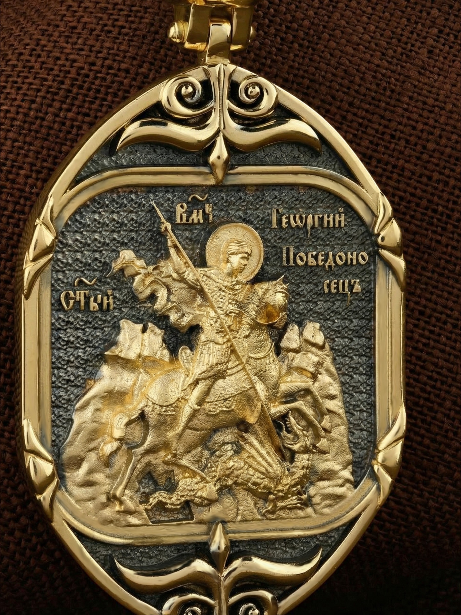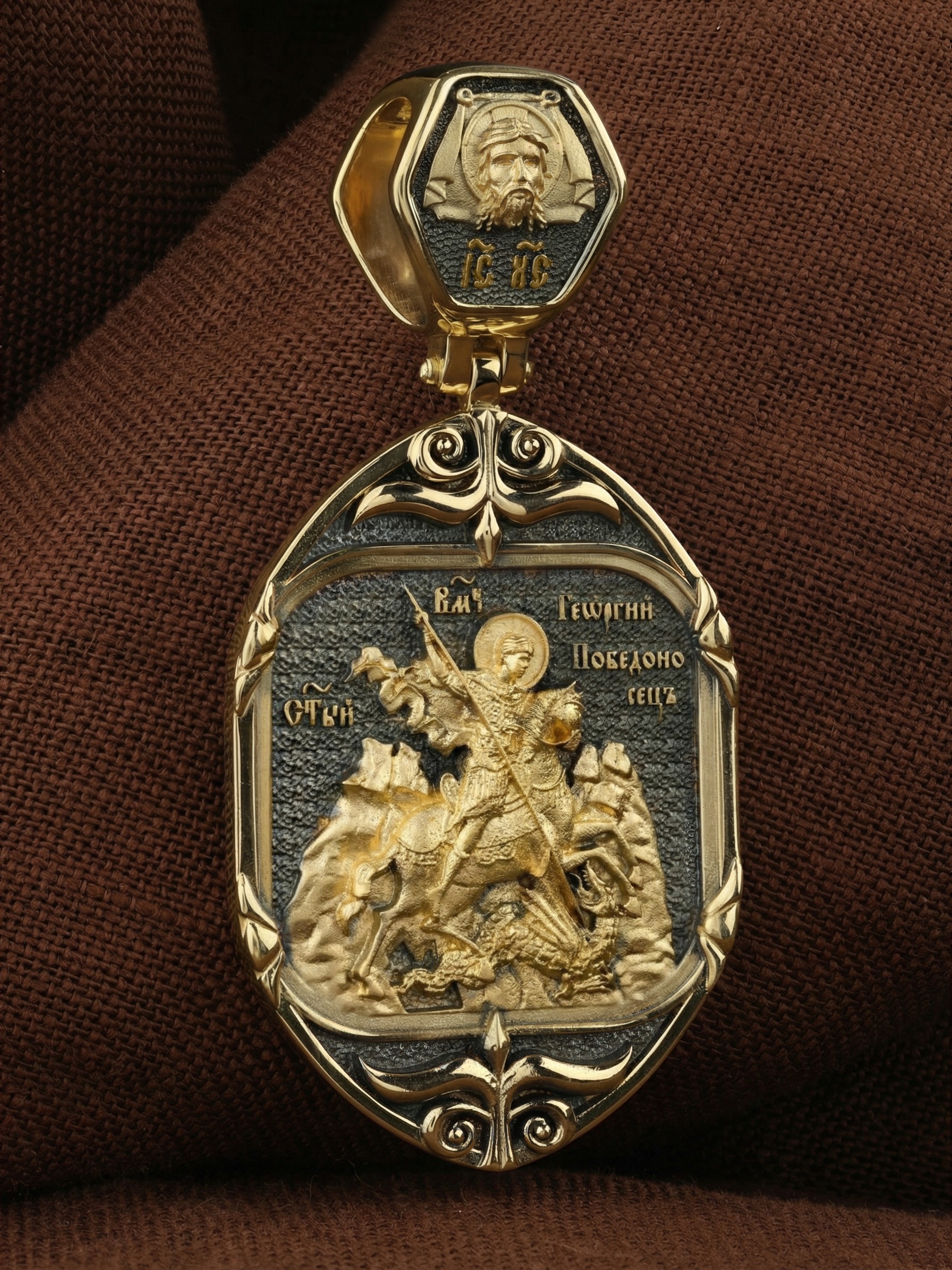 Основой композиции лицевой стороны является изображение Святого Георгия Победоносца. Святой Георгий — один из наиболее почитаемых святых в Христианской Церкви. На Руси он известен как Юрий или Егорий, покровитель воинов, помощник в крестьянском труде. На образке изображено самое знаменитое чудо святого: спасение принцессы от змея, которому она предназначалась в жертву. Чудо это имеет символическое толкование. Принцесса означает душу человеческую, а змей — дьявола, желающего ее поглотить. Св. Георгий, небесный защитник, спускается с Небес, чтобы помочь душе избавиться от гибели.