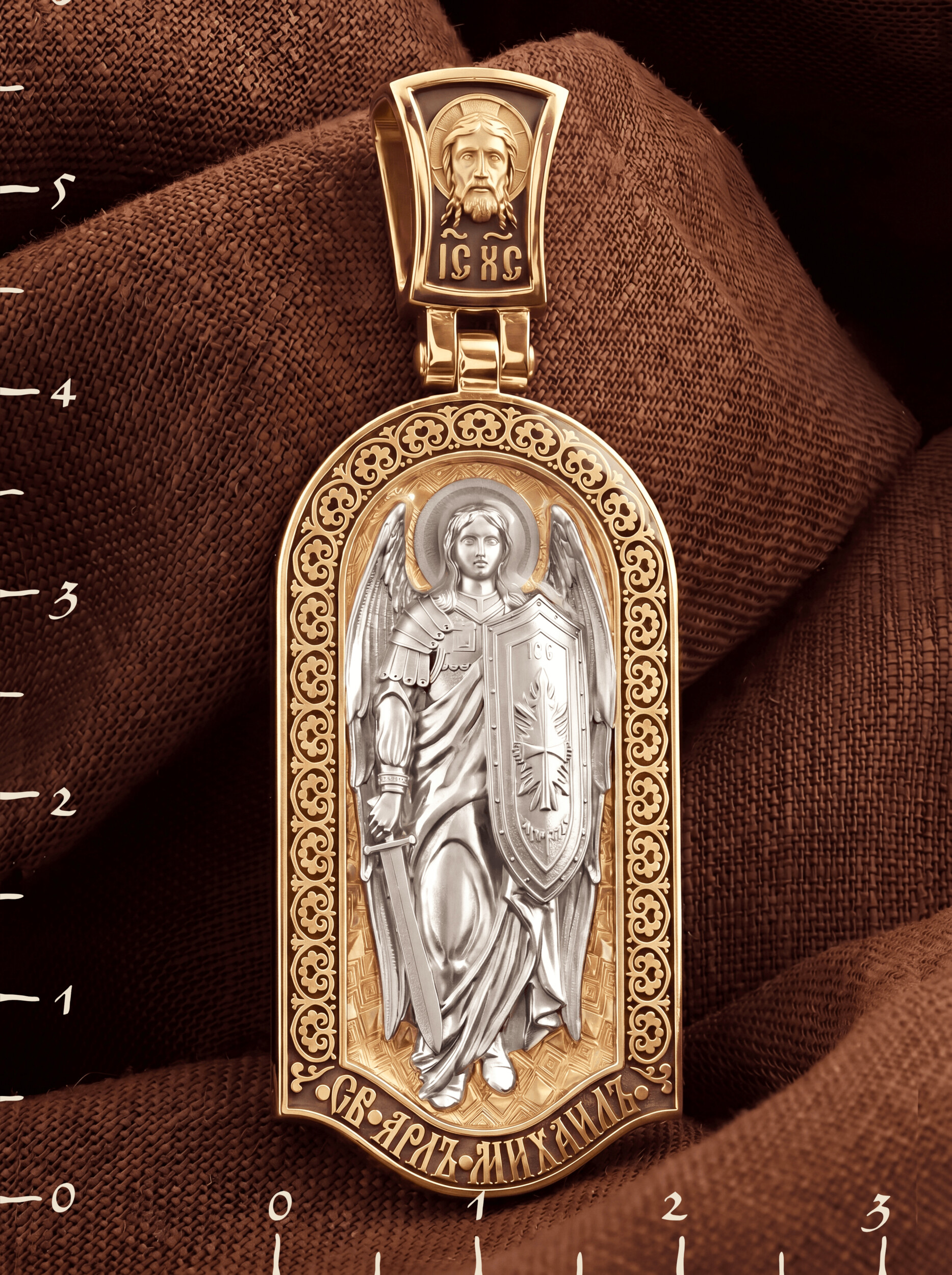 Основой композиции лицевой стороны является ростовое изображение Архангела Михаила — Архистратига всех Небесных Воинств. Он ведет непримиримую войну против сил зла, охраняет райские врата и защищает души людей. Его имя означает «Кто яко Бог?», так как он самый могучий и грозный враг зла. Он первым ополчился на Денницу, когда тот восстал против Бога, низверг его с Неба и не перестает сражаться с его темным воинством. Поэтому он часто изображается в виде воина, в доспехах и с огненным мечом. Но как служитель Небесного Царя и глава Ангелов и Архангелов на многих иконах он предстает в богатой одежде византийских придворных.