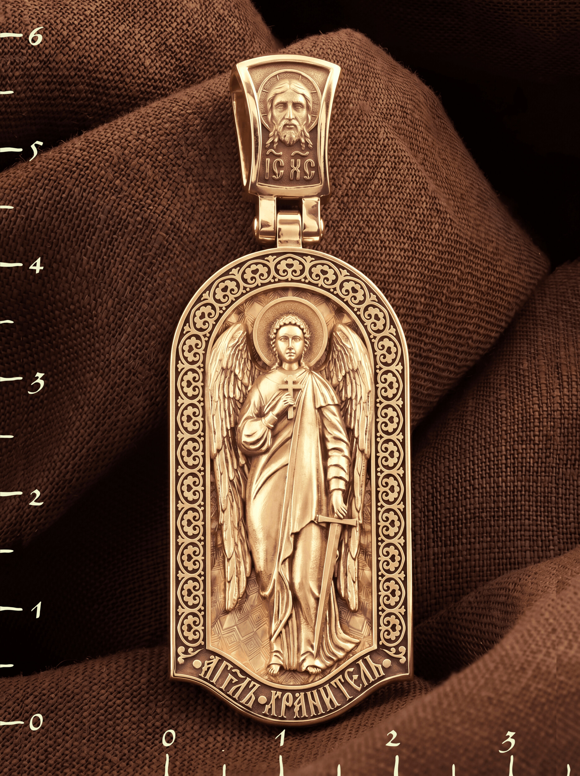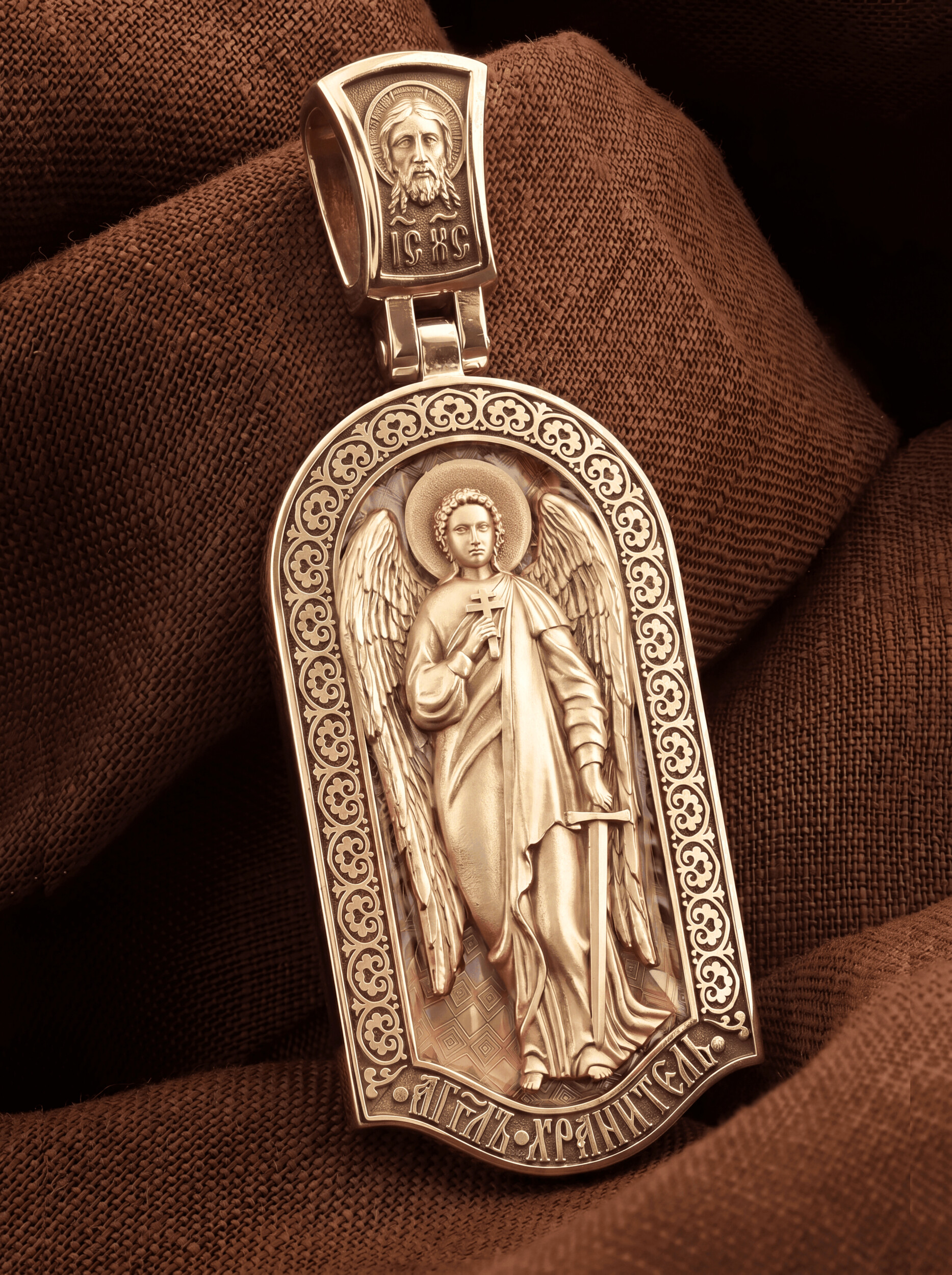 Основой композиции лицевой стороны является Ангела Хранителя. Образок Ангел Хранитель — это не просто украшение, а настоящая миниатюрная икона. В руках Ангел держит традиционные символические атрибуты Ангелов Хранителей: крест — знак послушания Христу и следования Его заповедям, меч — символ непримиримой борьбы, которую он ведет с бесами, отражая их нападения на людей. Слово «ангел» означает «вестник». Ангелы — верные служители Божьи, которых Господь посылает возвещать Свои повеления. Ангелы тварны, как и люди, но имеют другую природу. На иконах они изображаются в человеческом обличье с большими крыльями. Могучие крылья ангелов символизируют быстроту, с которой они исполняют повеления Бога, а небольшие ленточки у ушей –тороки, или слухи — показывают, что они всегда слышат Его голос.
