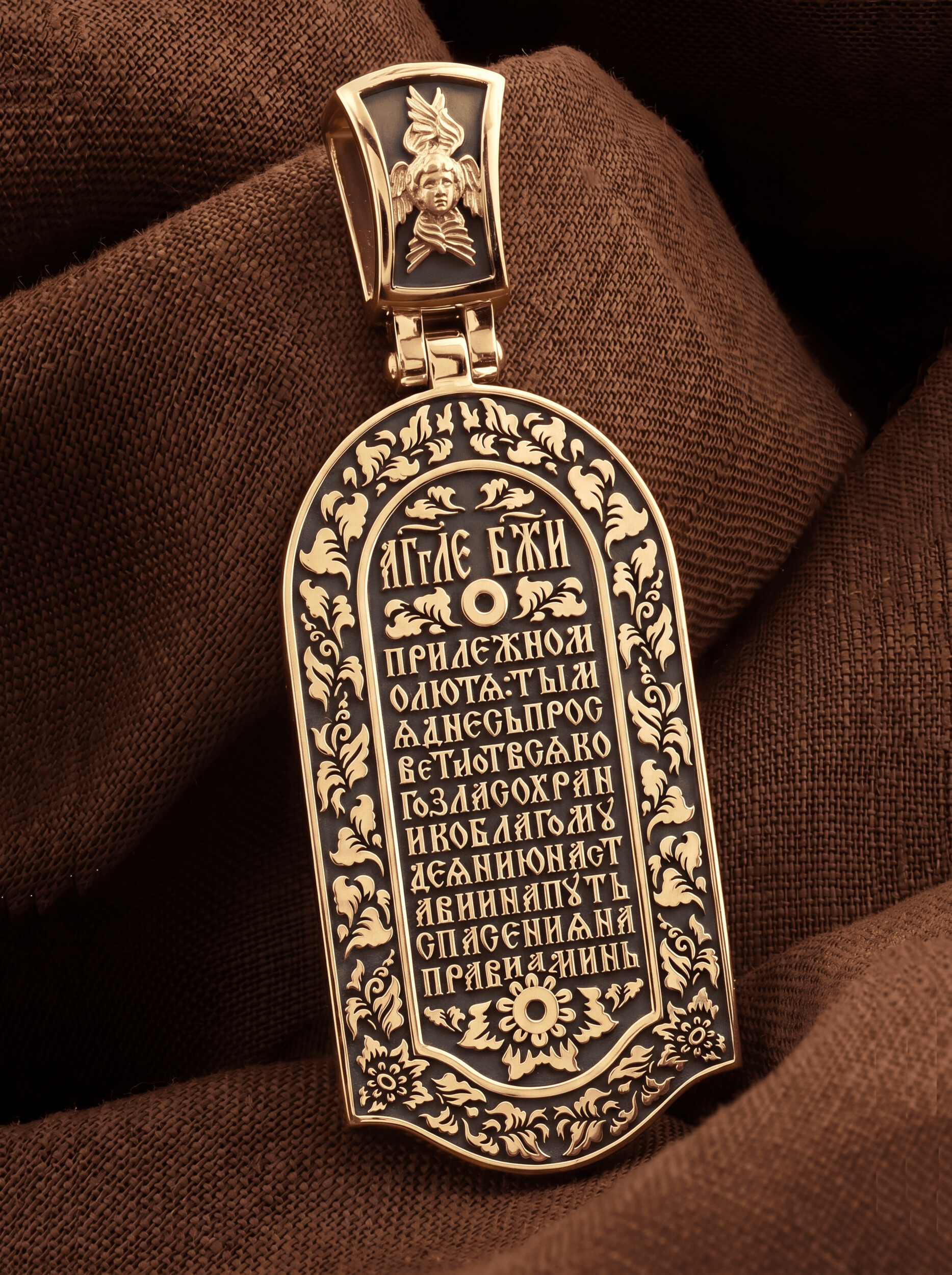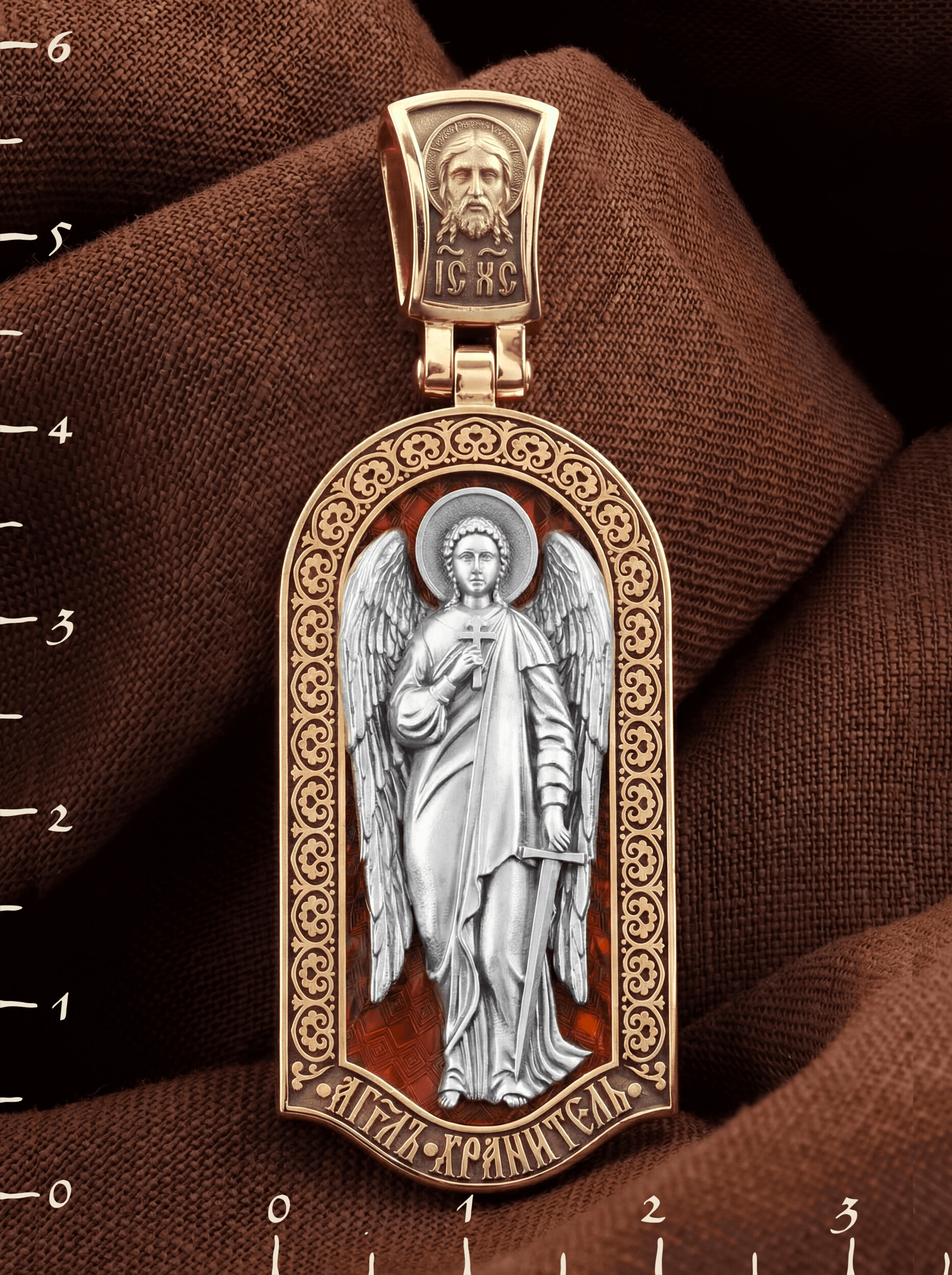 Основой композиции лицевой стороны является Ангела Хранителя. Образок Ангел Хранитель — это не просто украшение, а настоящая миниатюрная икона. В руках Ангел держит традиционные символические атрибуты Ангелов Хранителей: крест — знак послушания Христу и следования Его заповедям, меч — символ непримиримой борьбы, которую он ведет с бесами, отражая их нападения на людей. Слово «ангел» означает «вестник». Ангелы — верные служители Божьи, которых Господь посылает возвещать Свои повеления. Ангелы тварны, как и люди, но имеют другую природу. На иконах они изображаются в человеческом обличье с большими крыльями. Могучие крылья ангелов символизируют быстроту, с которой они исполняют повеления Бога, а небольшие ленточки у ушей –тороки, или слухи — показывают, что они всегда слышат Его голос.
