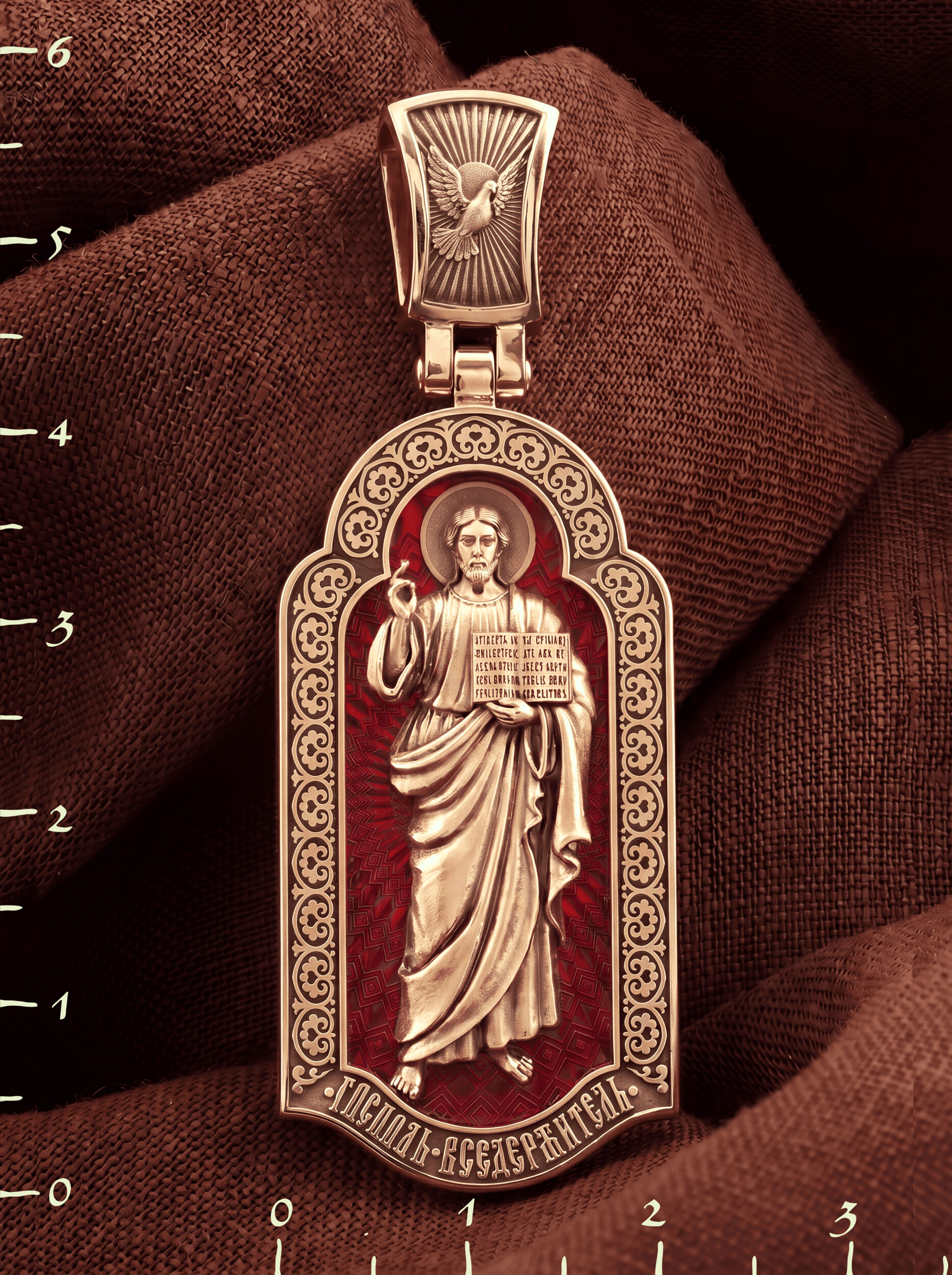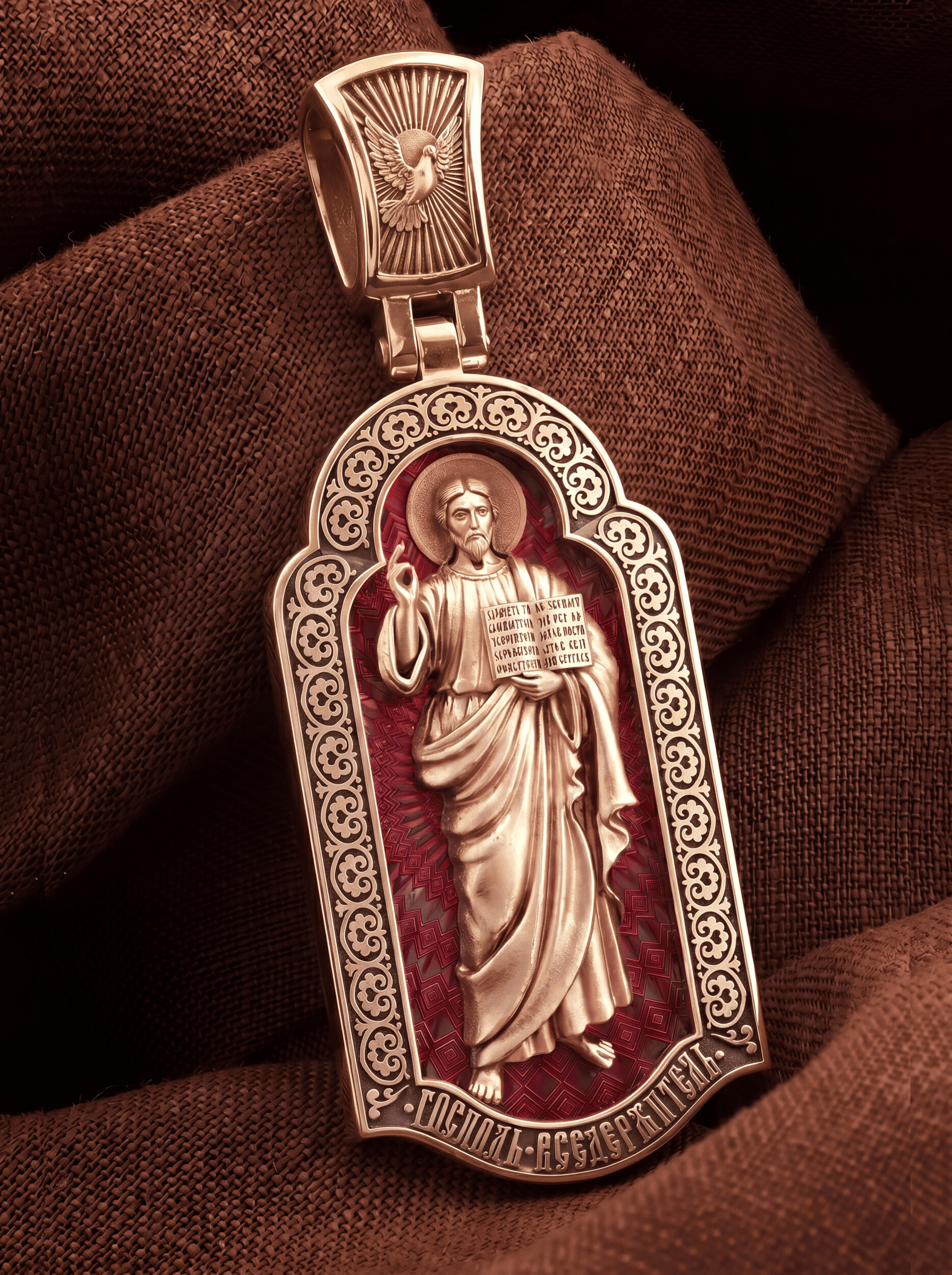 На лицевой стороне креста изображен Иисус Христос в образе Вседержителя, по-гречески «Пантократор». Это древнейший образ Спасителя, на котором Он представлен как властелин и правитель мира. Христос держит в руках Книгу, которая символизирует Книгу Бытия, то есть весь сотворенный Богом мир. В этой Книге судьбы всех людей, живущих на земле. Часто эту Книгу образно называют Книгой Жизни. Первое дошедшее до нас подобное изображение датируется VI веком и хранится в монастыре Святой Екатерины на горе Синай. Такие образы Христа с глубокой древности писались и в Палестине. Но Святая земля так часто подвергалась разграблению завоевателями, что древних икон там не осталось. Большинствоикон в храме Воскресения Христова были созданыв XIX веке.