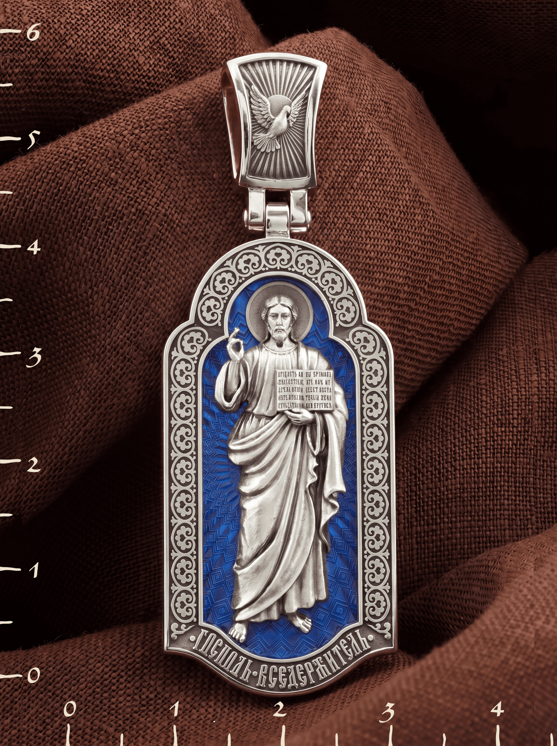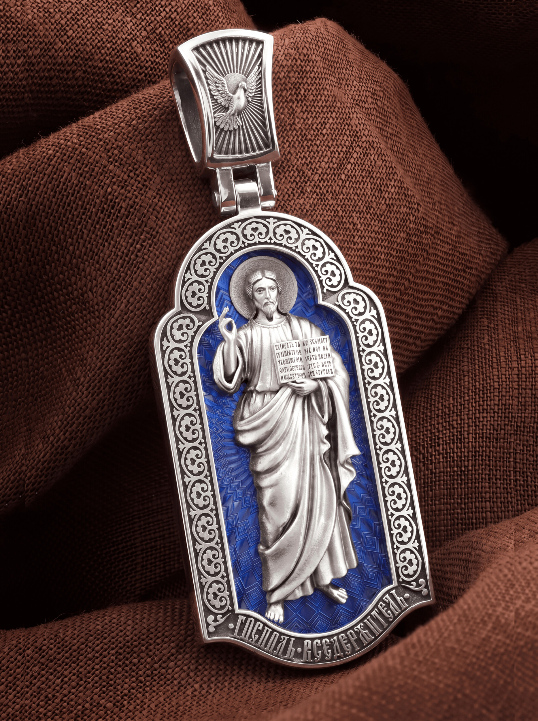 На лицевой стороне креста изображен Иисус Христос в образе Вседержителя, по-гречески «Пантократор». Это древнейший образ Спасителя, на котором Он представлен как властелин и правитель мира. Христос держит в руках Книгу, которая символизирует Книгу Бытия, то есть весь сотворенный Богом мир. В этой Книге судьбы всех людей, живущих на земле. Часто эту Книгу образно называют Книгой Жизни. Первое дошедшее до нас подобное изображение датируется VI веком и хранится в монастыре Святой Екатерины на горе Синай. Такие образы Христа с глубокой древности писались и в Палестине. Но Святая земля так часто подвергалась разграблению завоевателями, что древних икон там не осталось. Большинствоикон в храме Воскресения Христова были созданыв XIX веке.