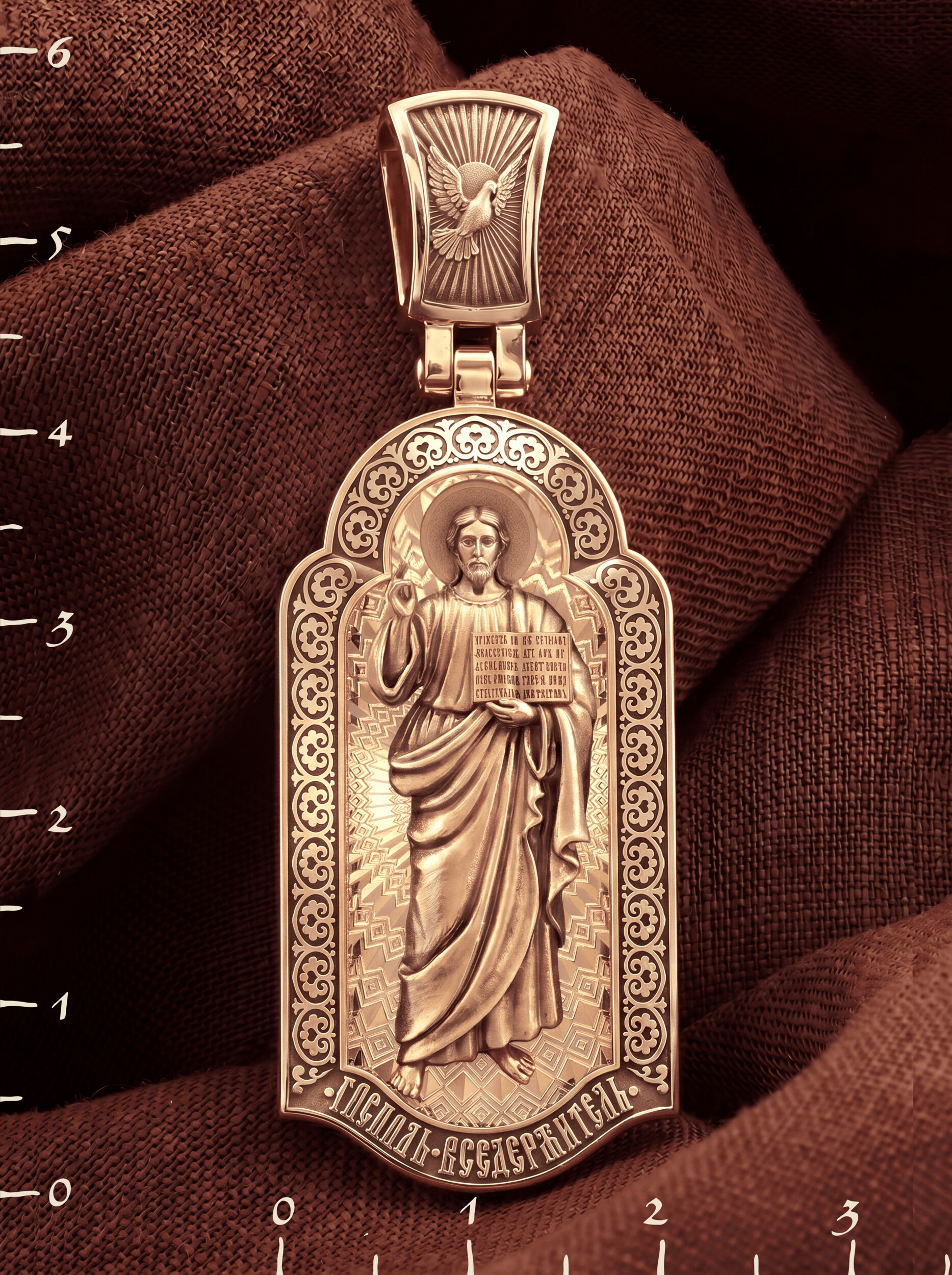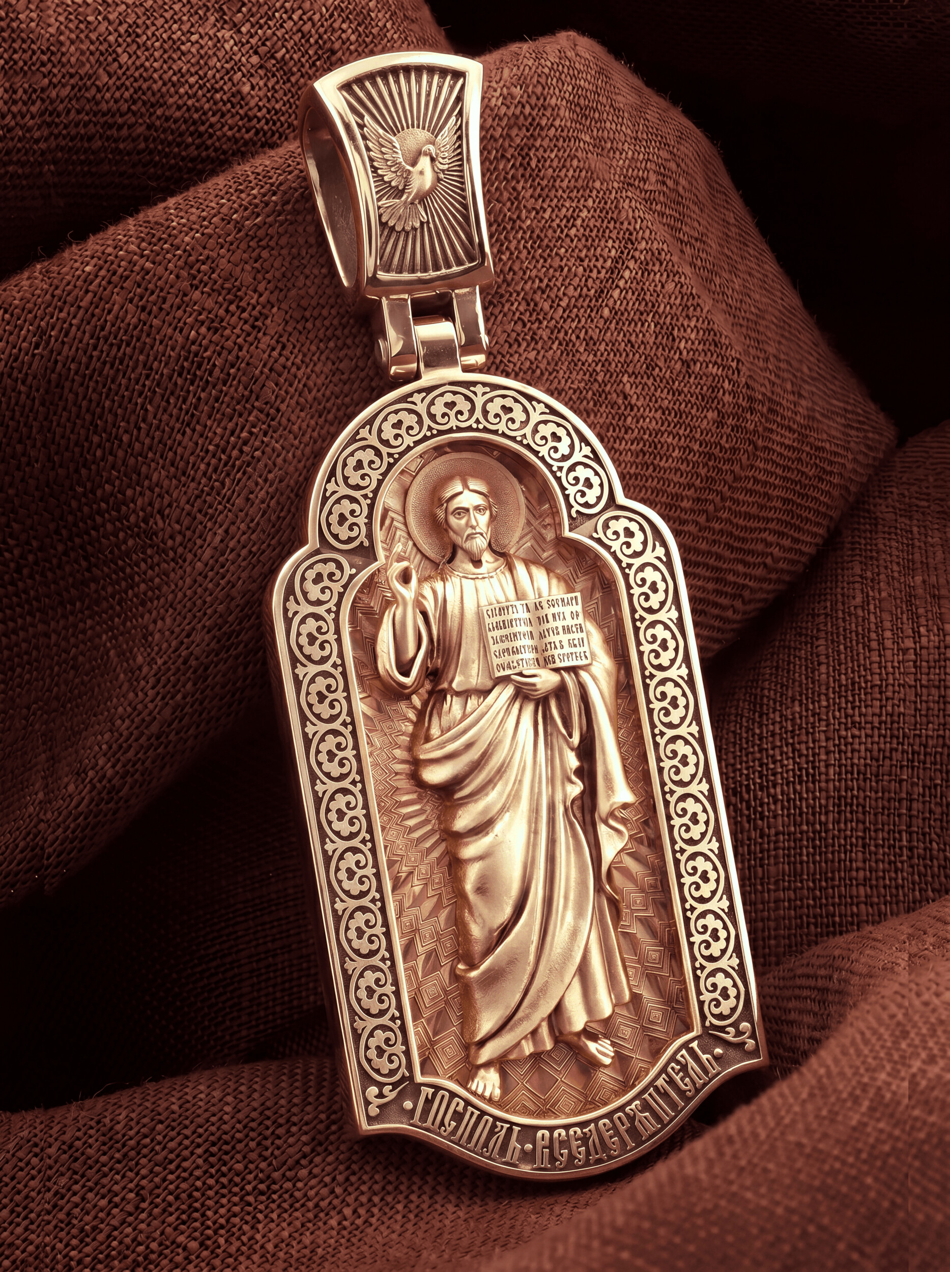 На лицевой стороне креста изображен Иисус Христос в образе Вседержителя, по-гречески «Пантократор». Это древнейший образ Спасителя, на котором Он представлен как властелин и правитель мира. Христос держит в руках Книгу, которая символизирует Книгу Бытия, то есть весь сотворенный Богом мир. В этой Книге судьбы всех людей, живущих на земле. Часто эту Книгу образно называют Книгой Жизни. Первое дошедшее до нас подобное изображение датируется VI веком и хранится в монастыре Святой Екатерины на горе Синай. Такие образы Христа с глубокой древности писались и в Палестине. Но Святая земля так часто подвергалась разграблению завоевателями, что древних икон там не осталось. Большинствоикон в храме Воскресения Христова были созданыв XIX веке.