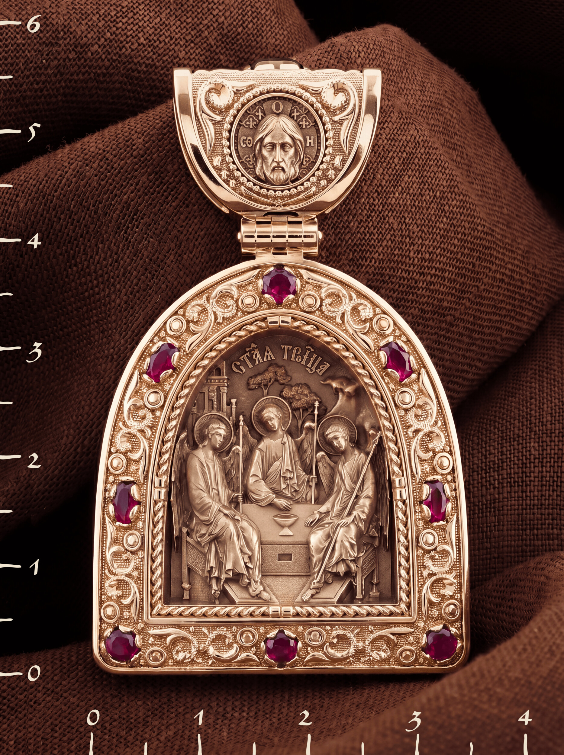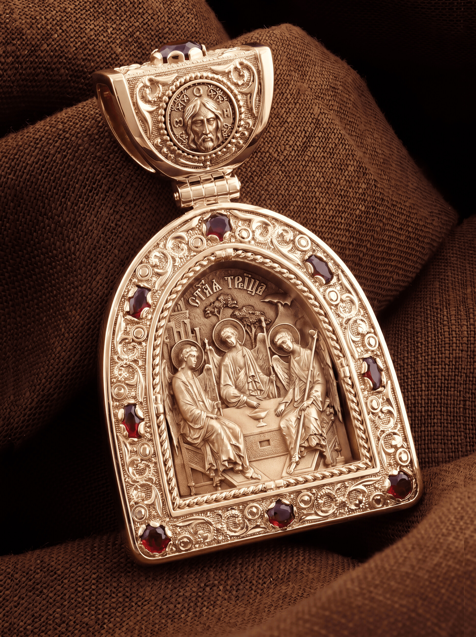 Основой композиции лицевой стороны является икона Святой Троицы.