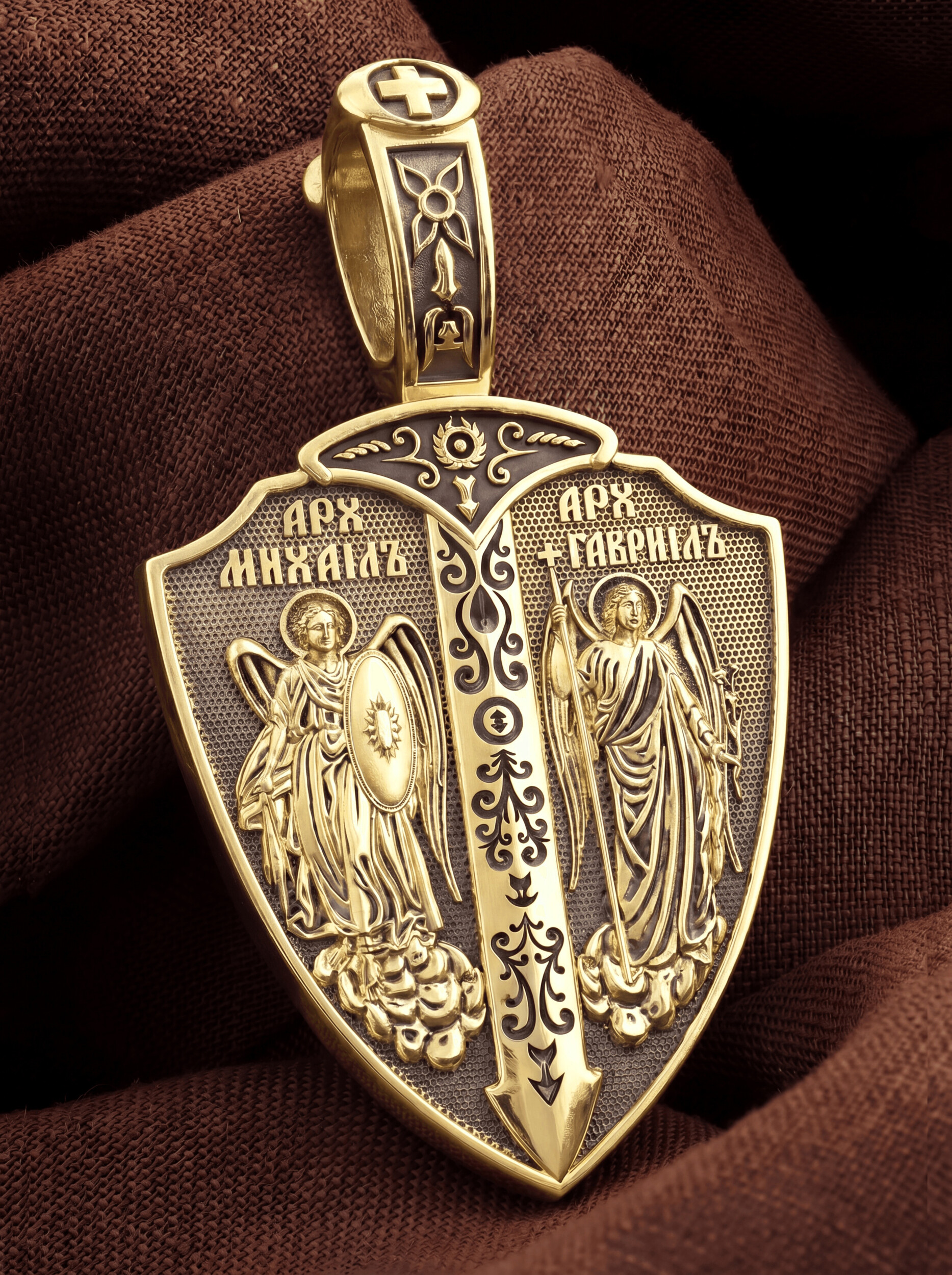 Образок выполнен в виде воинского щита и меча. На лицевой стороне образка изображены Архангел Михаил и Архангел Гавриил. Архангел Михаил изображен в воинственном виде с огненным мечом в правой руке и щитом в левой руке. Архангел Михаил — верный служитель Божий, который низринул с Неба возгордившегося денницу с другими павшими духами. В Православии его называют Архистратигом, что означает глава святого воинства Ангелов и Архангелов. Архангел почитается как покровитель воинов и всех верных Богу и ведущих борьбу против сил зла, борец против ересей, а также защитник душ умерших, страж райских врат. Архангел Гавриил изображен с крестом в правой руке и цветком лилии в левой руке. Он несколько раз упоминается в Писании, как Небесный вестник, которого Бог посылает, чтобы возвестить людям Свои планы о спасении рода человеческого. Так, Архангел Гавриил несколько раз являлся пророку Даниилу и раскрывал ему тайны пришествия Мессии, гонений антихриста и конца мира (Дан. 8, 16, 9−21). Перед пришествием Сына Божия в мир архангел Гавриил явился в храме старцу Захарии и сообщил ему о чудесном зачатии Предтечи. Через шесть месяцев он явился в Назарете Деве Марии с вестью об избрании Ее быть Матерью Христа Спасителя (Лк. 1). Когда Господь перед Своими страданиями молился в Гефсиманском саду до кровавого пота, на укрепление Его, по Церковному Преданию, был послан с Небес Архангел Гавриил. (Лк.22:43). Жены мироносицы услышали от Архистратига радостную весть о Воскресении Христовом.
