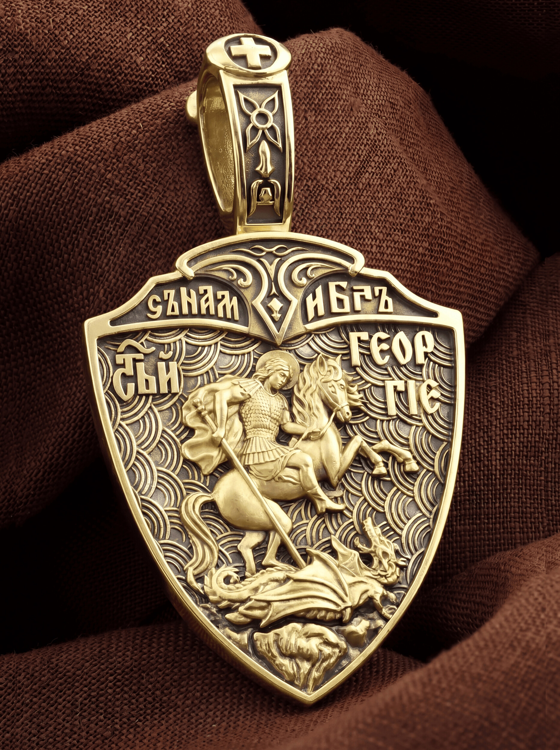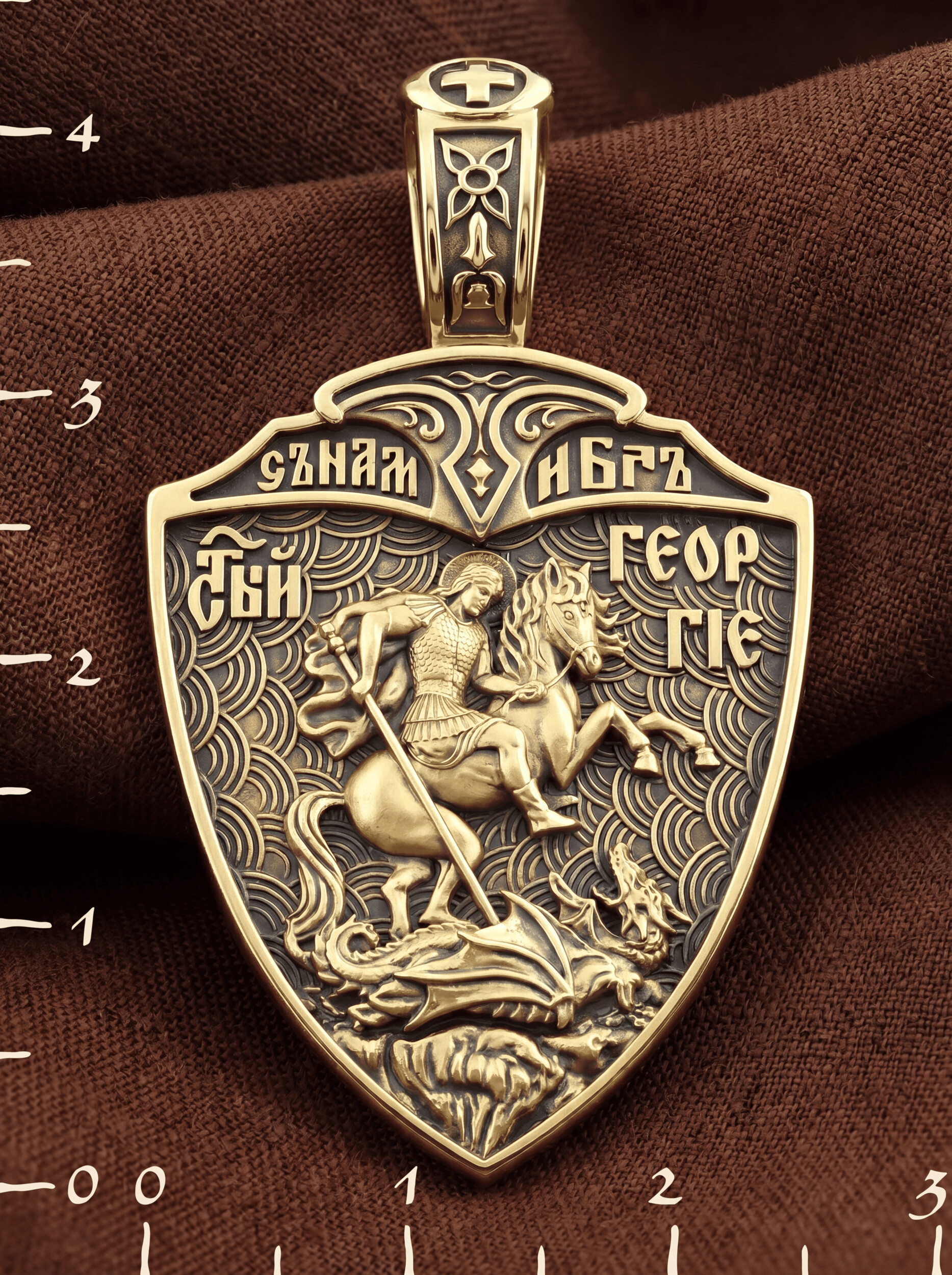 На оборотной стороне образка изображен Святой Великомученик Георгий Победоносец — один из самых почитаемых и удивительных святых. На Руси он известен как Юрий или Егорий, заступник для верующих, чья жизнь имеет какое-либо отношение к военным делам, помощник в крестьянском труде. На образке Георгий изображен как воитель, сидящий на вздыбленном коне и поражающий копьем огнедышащего змея. Змей символизирует собою сатанинские силы. Молитвами вознесенными к Всевышнему и своей непреклонной верой он смог одолеть чудовище. Святой убил змея, спас царскую дочь, принесенную в жертву, и жителей города, их души от влияния дьявола, породив в них надежду и веру в Господа, призывая людей принять христианскую веру.