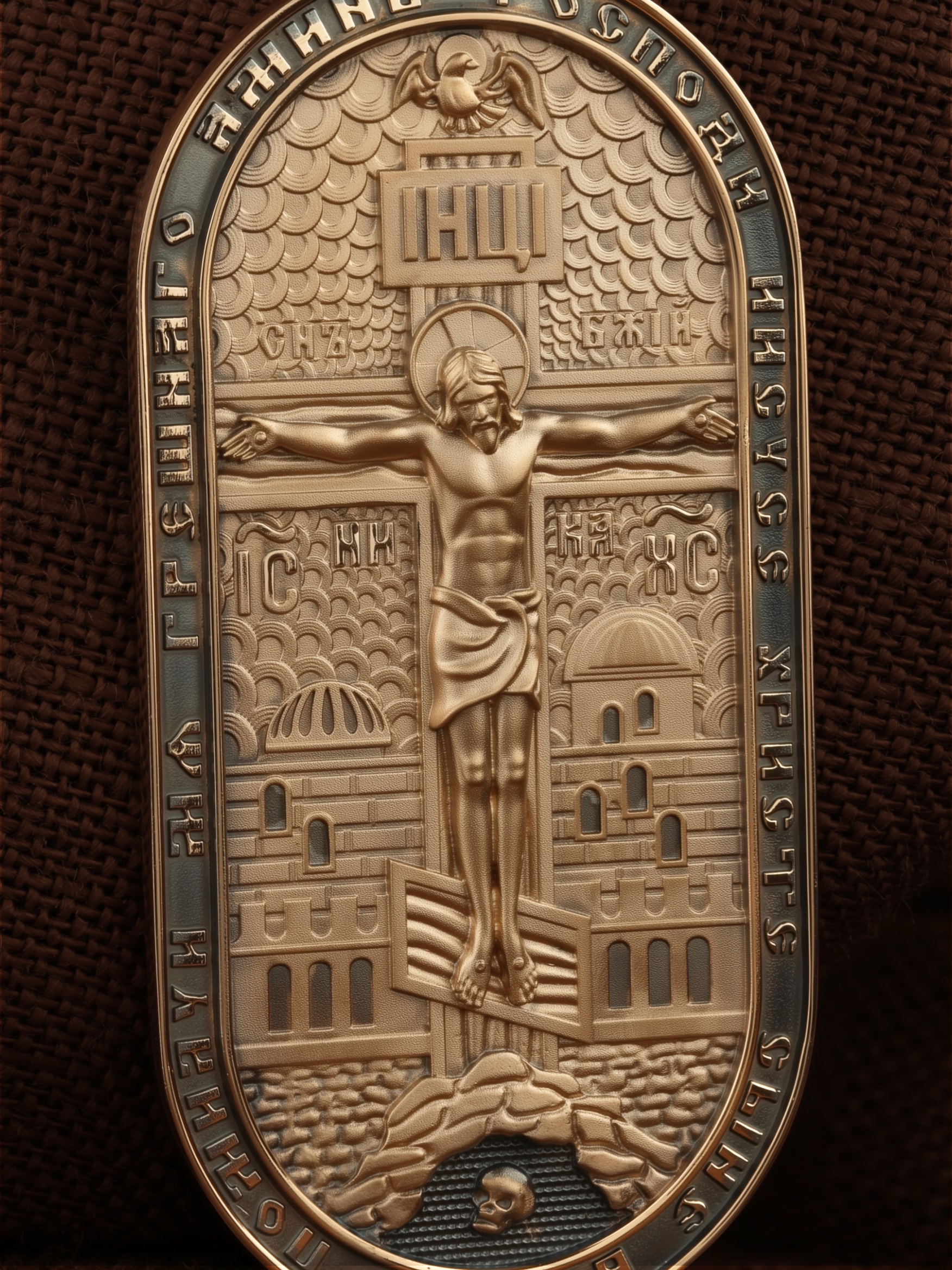 По контуру написана молитва: «Победоносче Великомучениче Георгие, моли Христа Бога спастися душам нашим». На кулонном кольце изображен Спас Нерукотворный — Символ вочеловечившегося Божества.