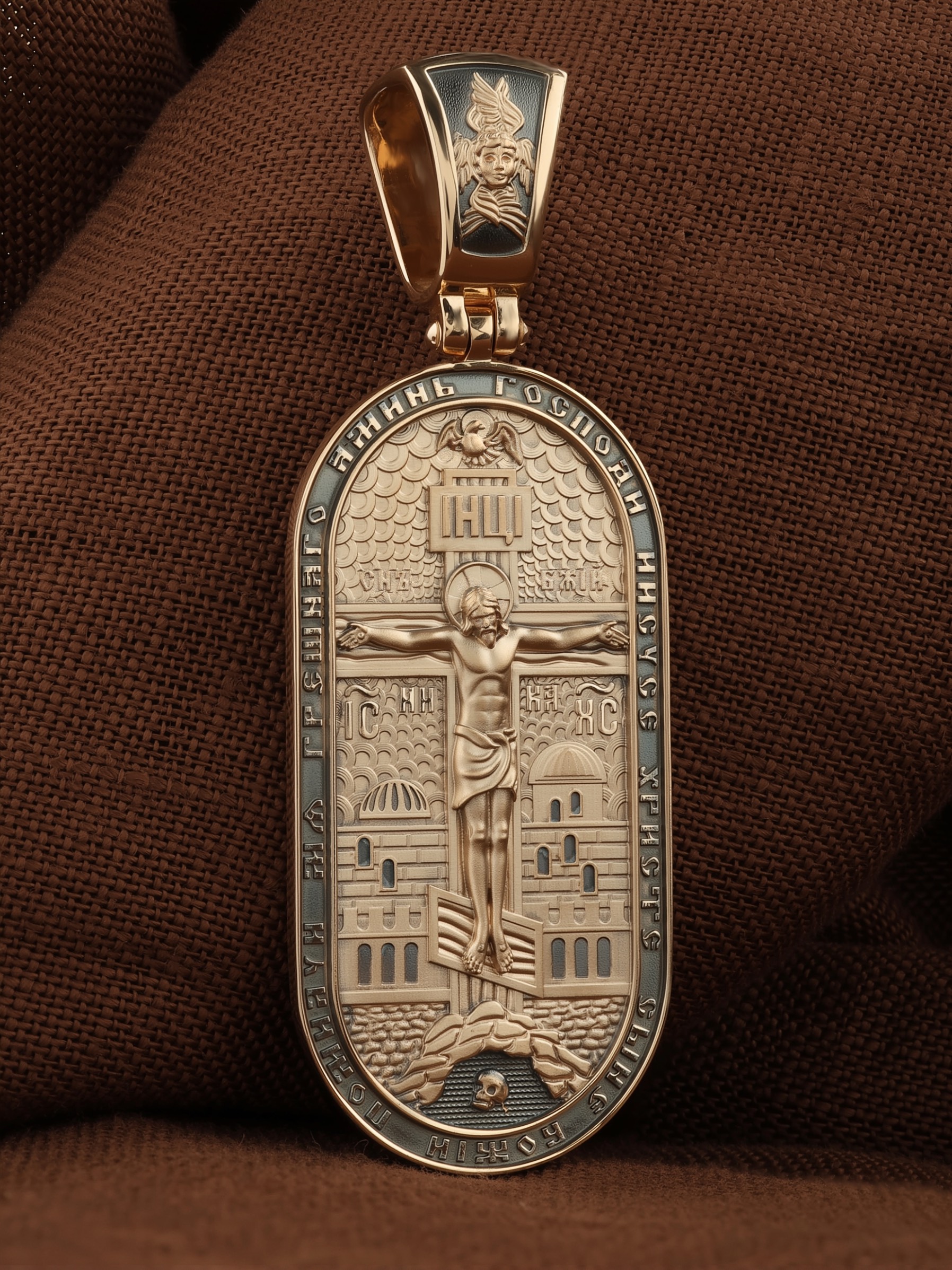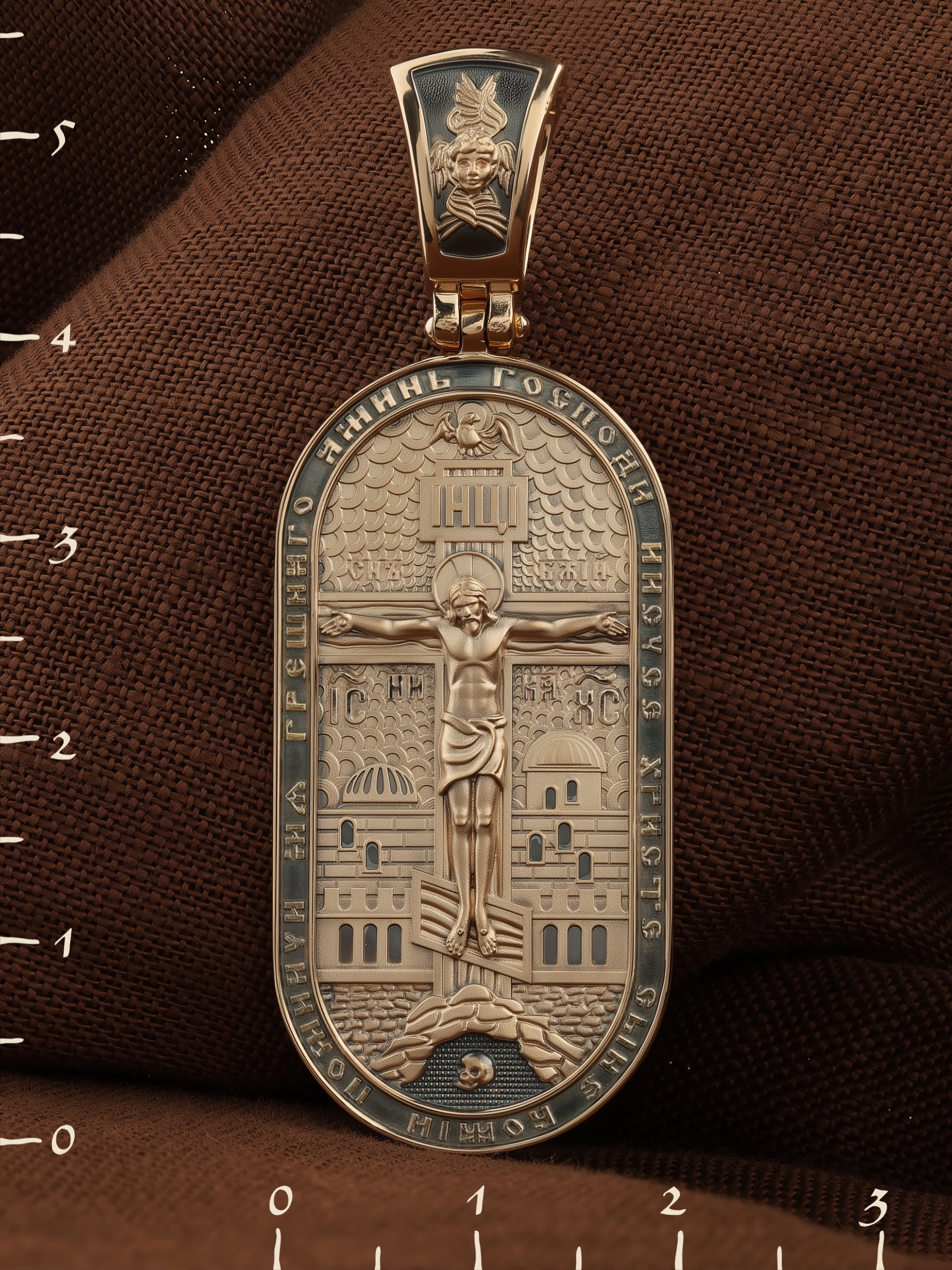 По контуру образка написана молитва: «Господи Иисусе Христе, Сыне Божий, помилуй мя грешного. Аминь». На кулонном кольце изображен шестикрылый Серафим — самый приближенный к Господу Ангел