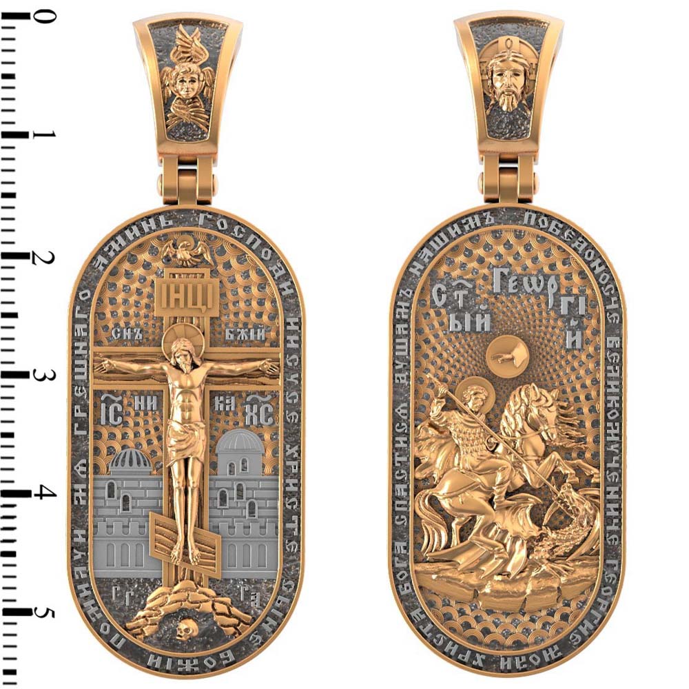 По контуру написана молитва: «Победоносче Великомучениче Георгие, моли Христа Бога спастися душам нашим». На кулонном кольце изображен Спас Нерукотворный — Символ вочеловечившегося Божества.